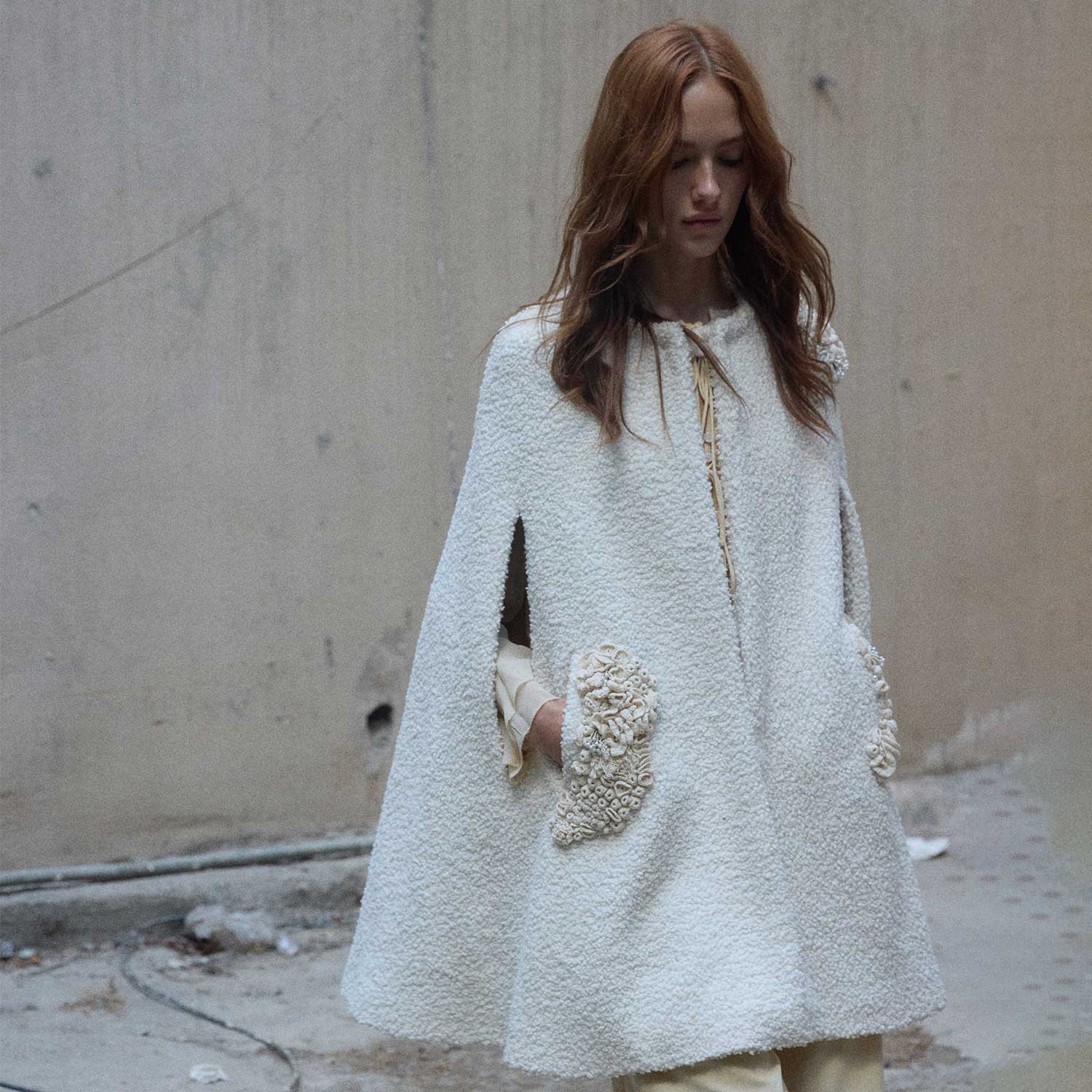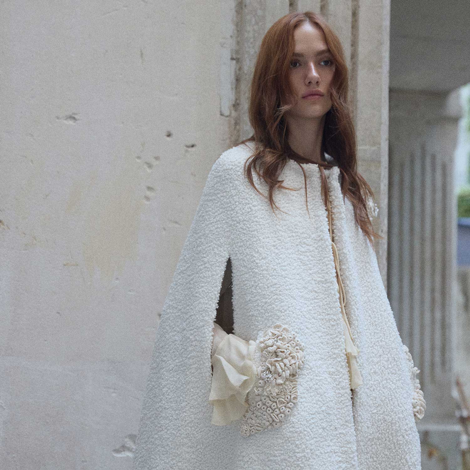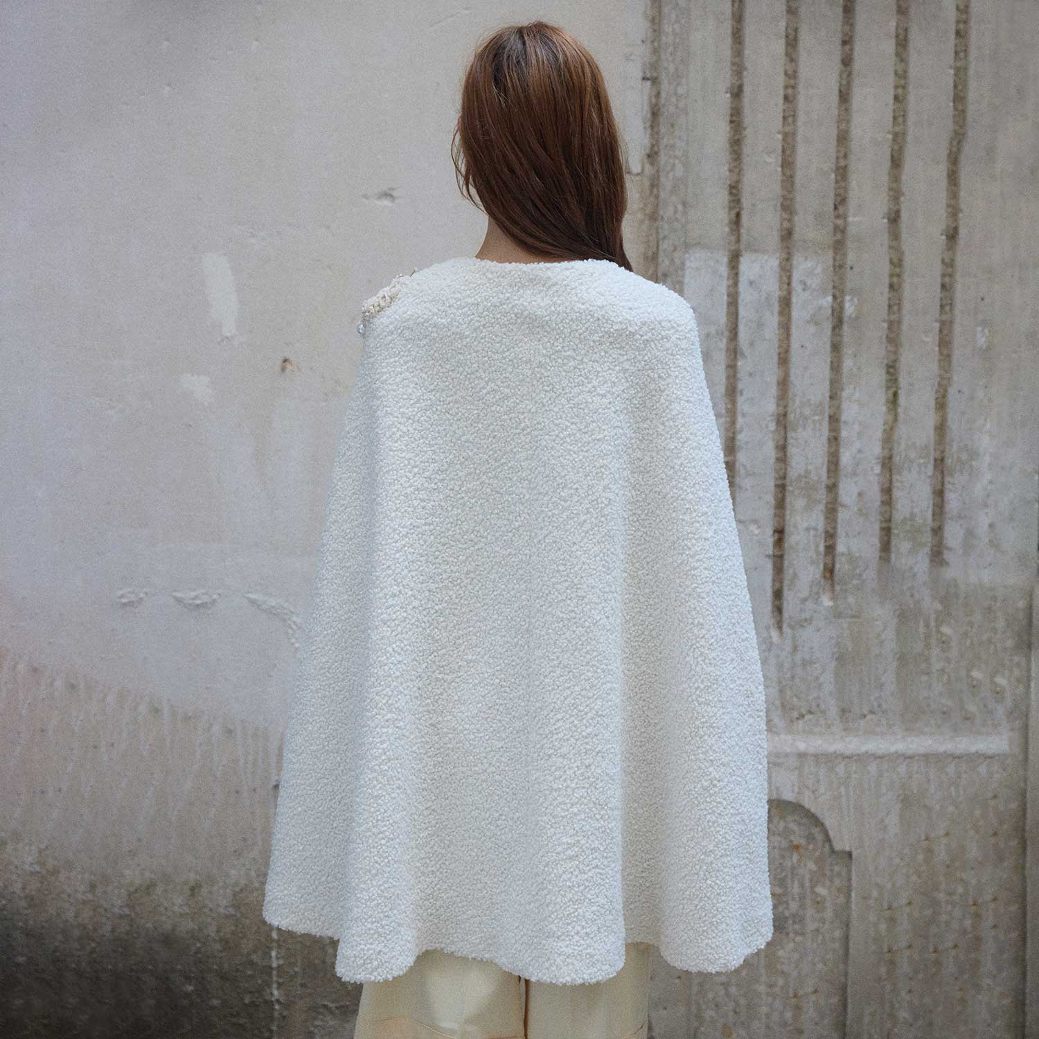 Soft and enveloping, the Beige Moss on Bouclé Mid-Cape is adorned with organic, textured details that bring depth to its cozy form. Introduced in The Grounded Collection, this cape balances warmth with artistry, making it a refined statement for cooler days.