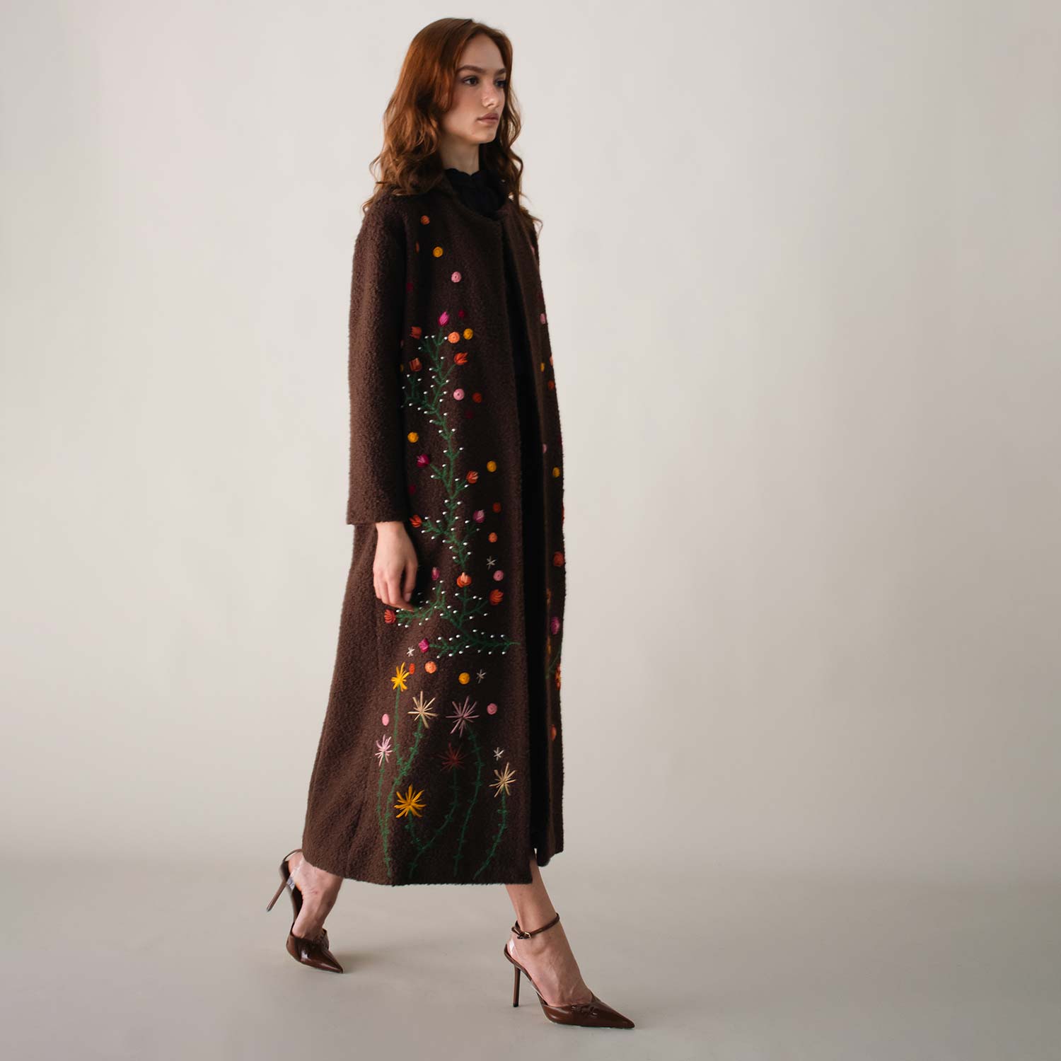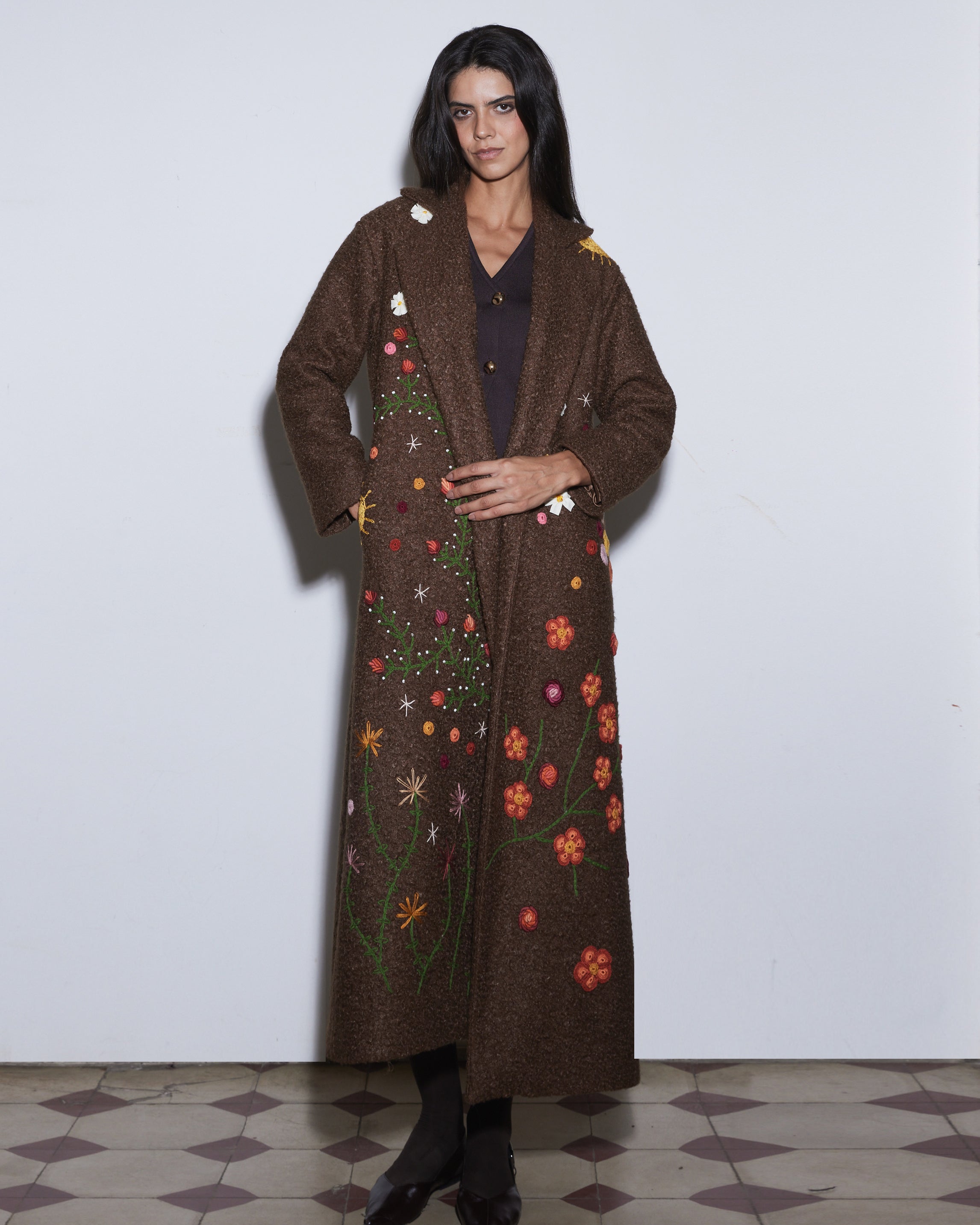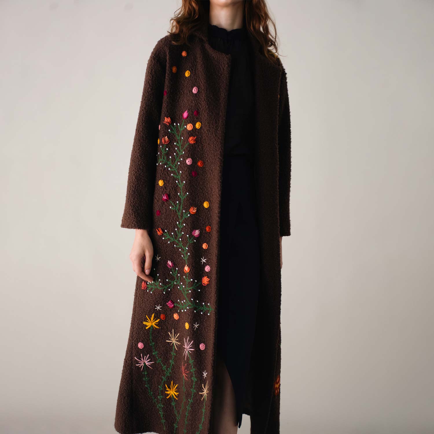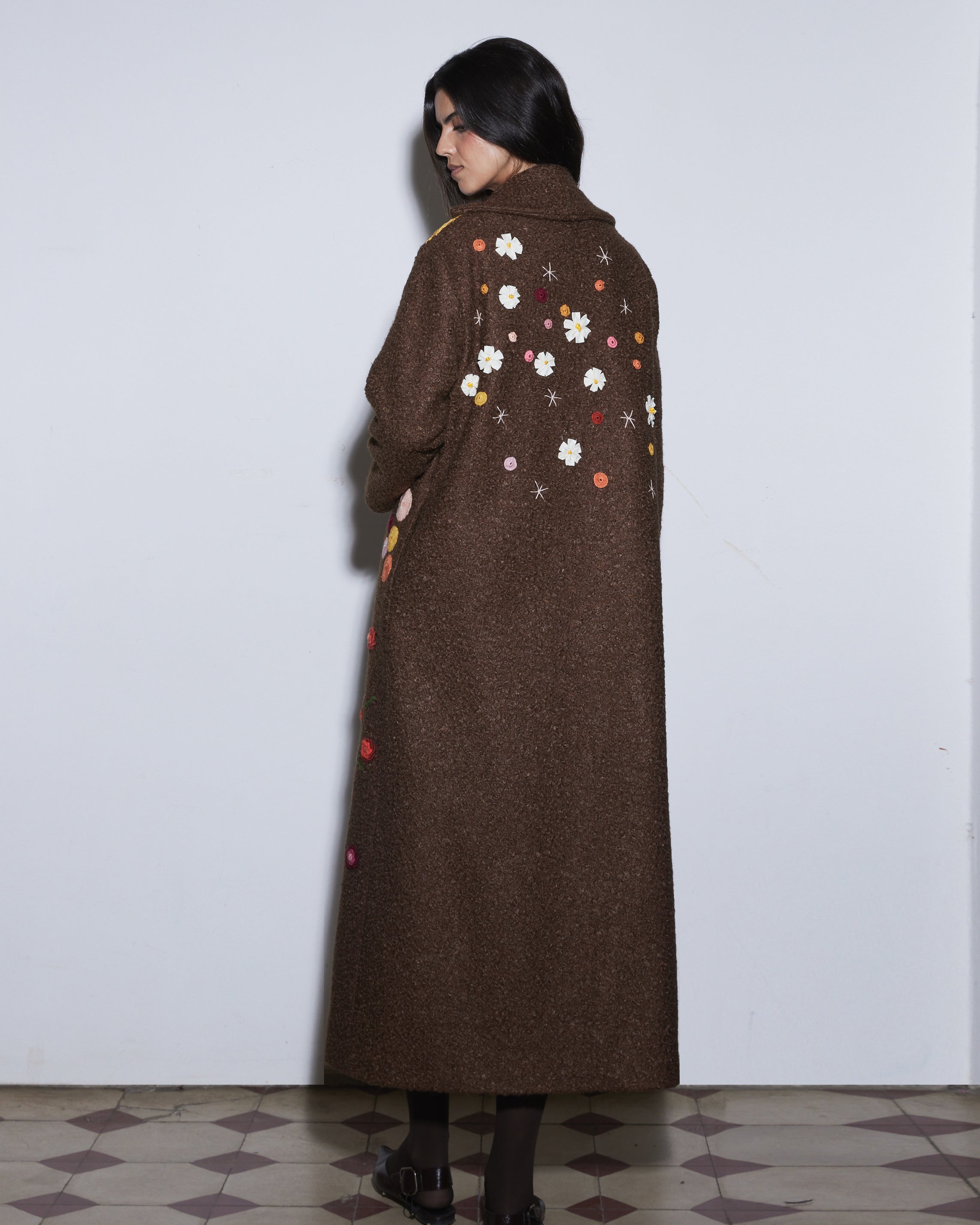 The Bloom on Bouclé Brown Coat is adorned with hand-embroidered floral motifs in vibrant colors that cascade along the long silhouette, bringing a lively and artistic touch to winter layers. With its open-front design and relaxed fit, it drapes effortlessly, offering both comfort and everyday style.