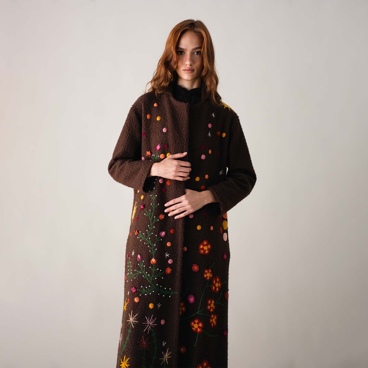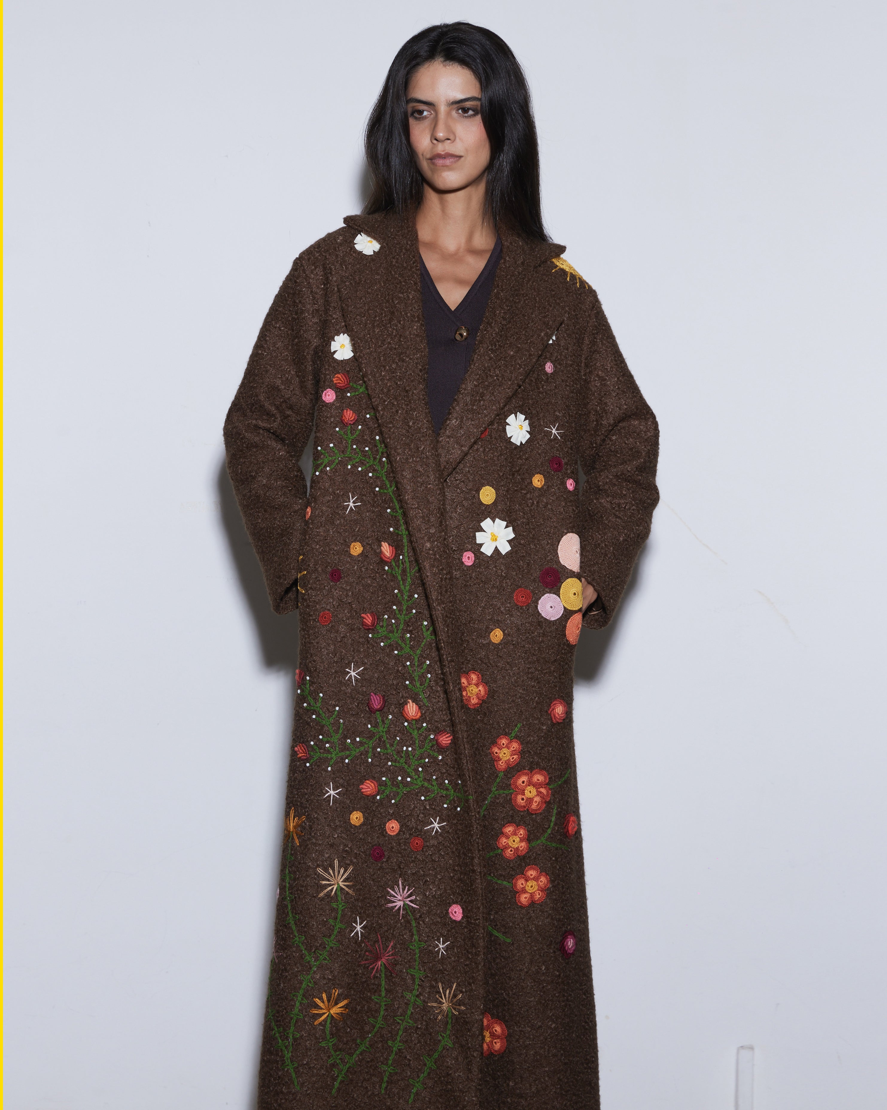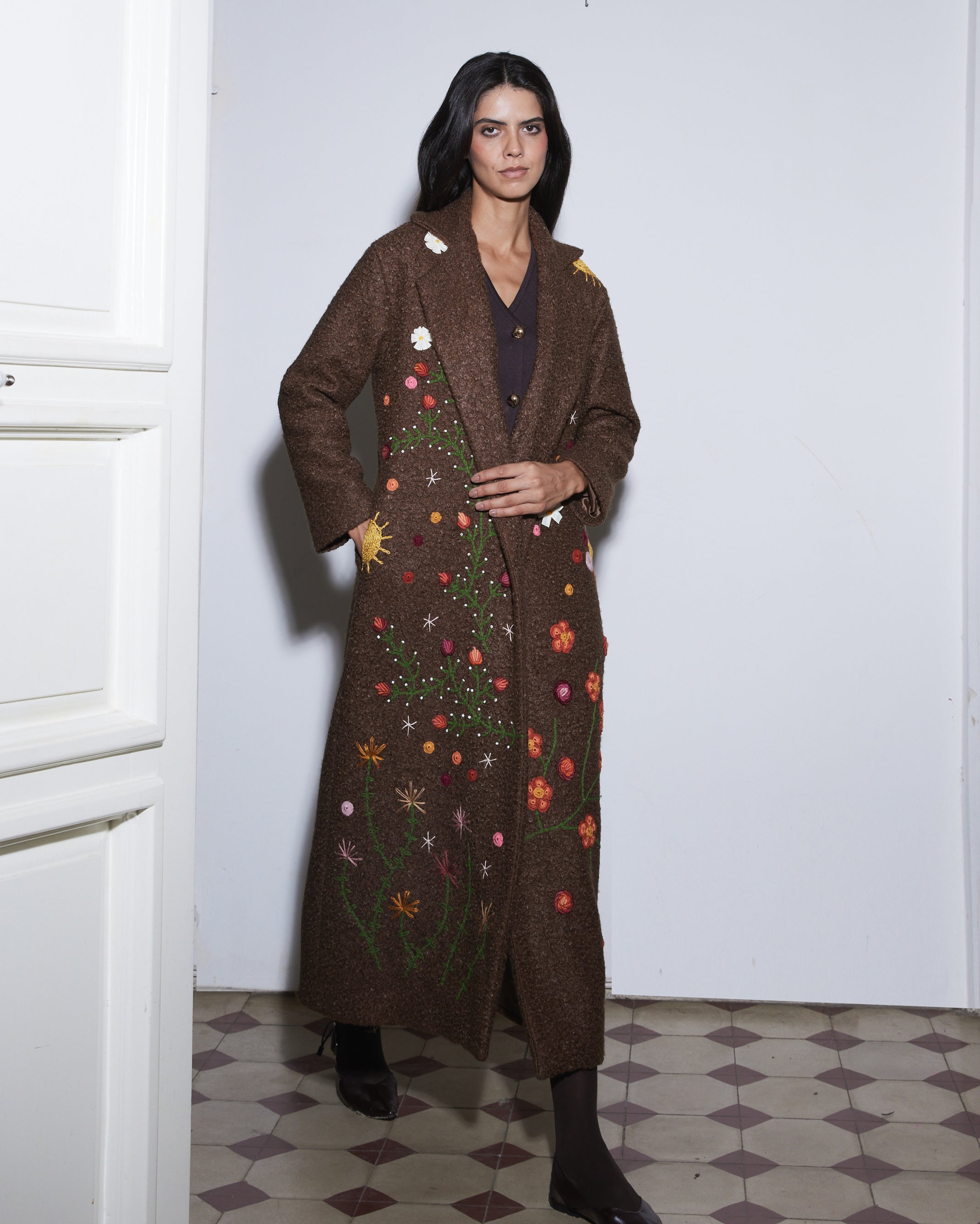 The Bloom on Bouclé Brown Coat is adorned with hand-embroidered floral motifs in vibrant colors that cascade along the long silhouette, bringing a lively and artistic touch to winter layers. With its open-front design and relaxed fit, it drapes effortlessly, offering both comfort and everyday style.