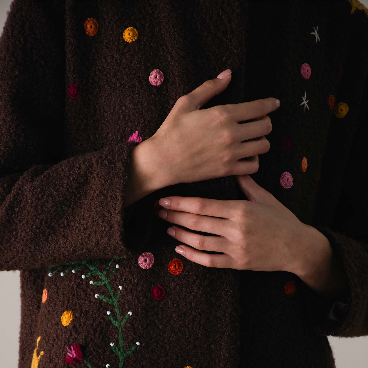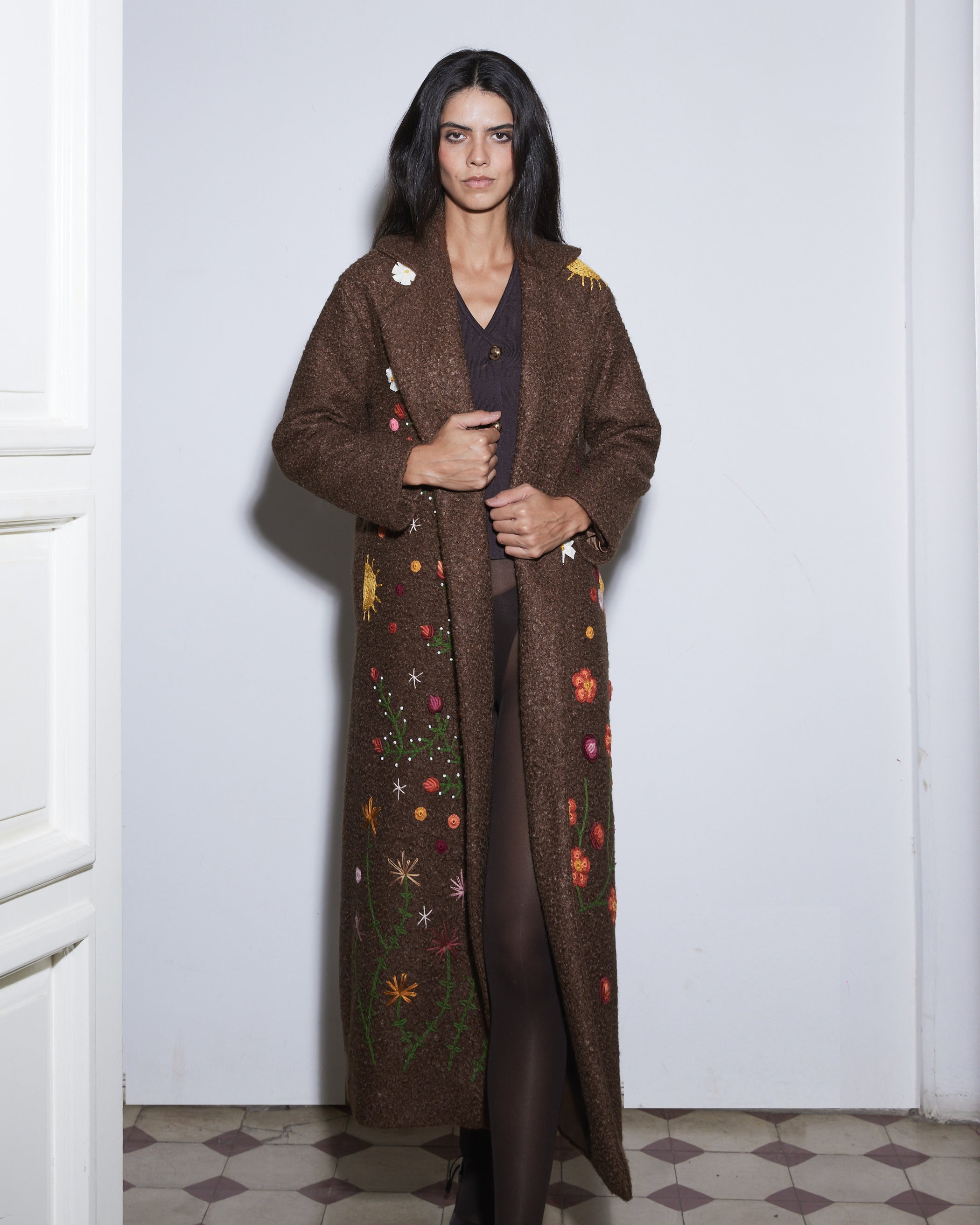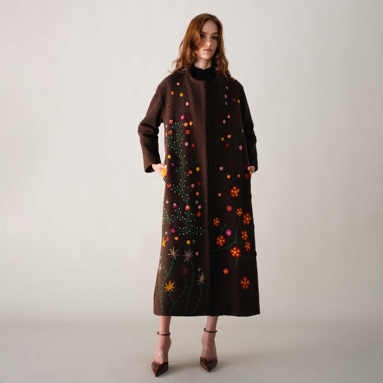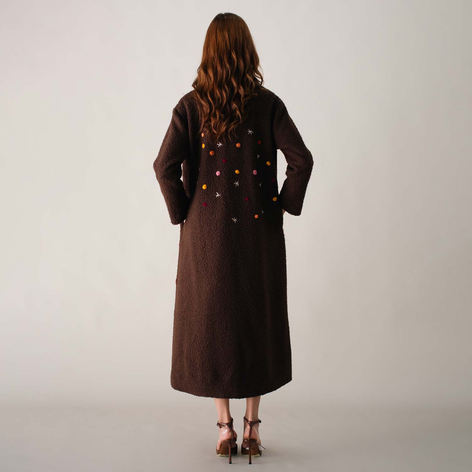 The Bloom on Bouclé Brown Coat is adorned with hand-embroidered floral motifs in vibrant colors that cascade along the long silhouette, bringing a lively and artistic touch to winter layers. With its open-front design and relaxed fit, it drapes effortlessly, offering both comfort and everyday style.