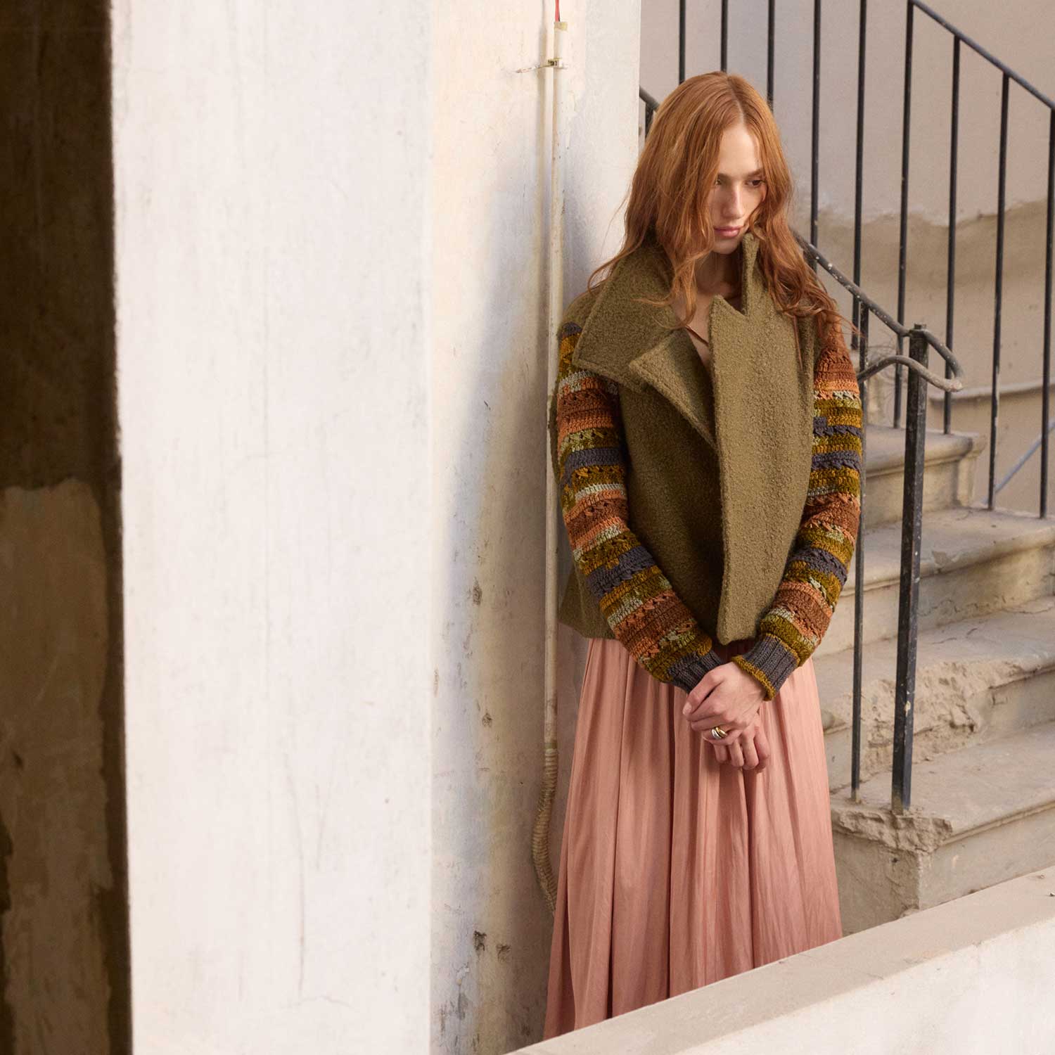 The earth tone wool sleeve on black boucle yas jacket is crafted in khaki bouclé, offering a soft, sculpted base, while the sleeves are hand-crocheted in earthy tones of green, orange, and brown, evoking autumnal landscapes. Its oversized notched collar add a structured finish. A statement layering piece, it brings artisanal detail and seasonal depth to everyday styling.