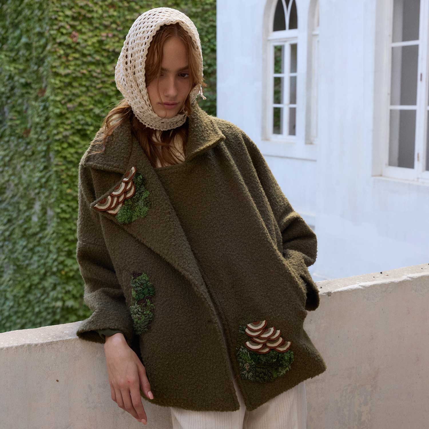 The Forest on Khaki Bouclé Bea Jacket merges natural texture with tailored refinement. Crafted from khaki bouclé, it is accented with a forest-inspired motif that brings depth and contrast. Designed within The Grounded Collection, this piece highlights the harmony of craftsmanship and contemporary style. Structured shoulders, a notched collar, and a clean front closure give it a polished cut, making it a versatile layering choice for cooler seasons.