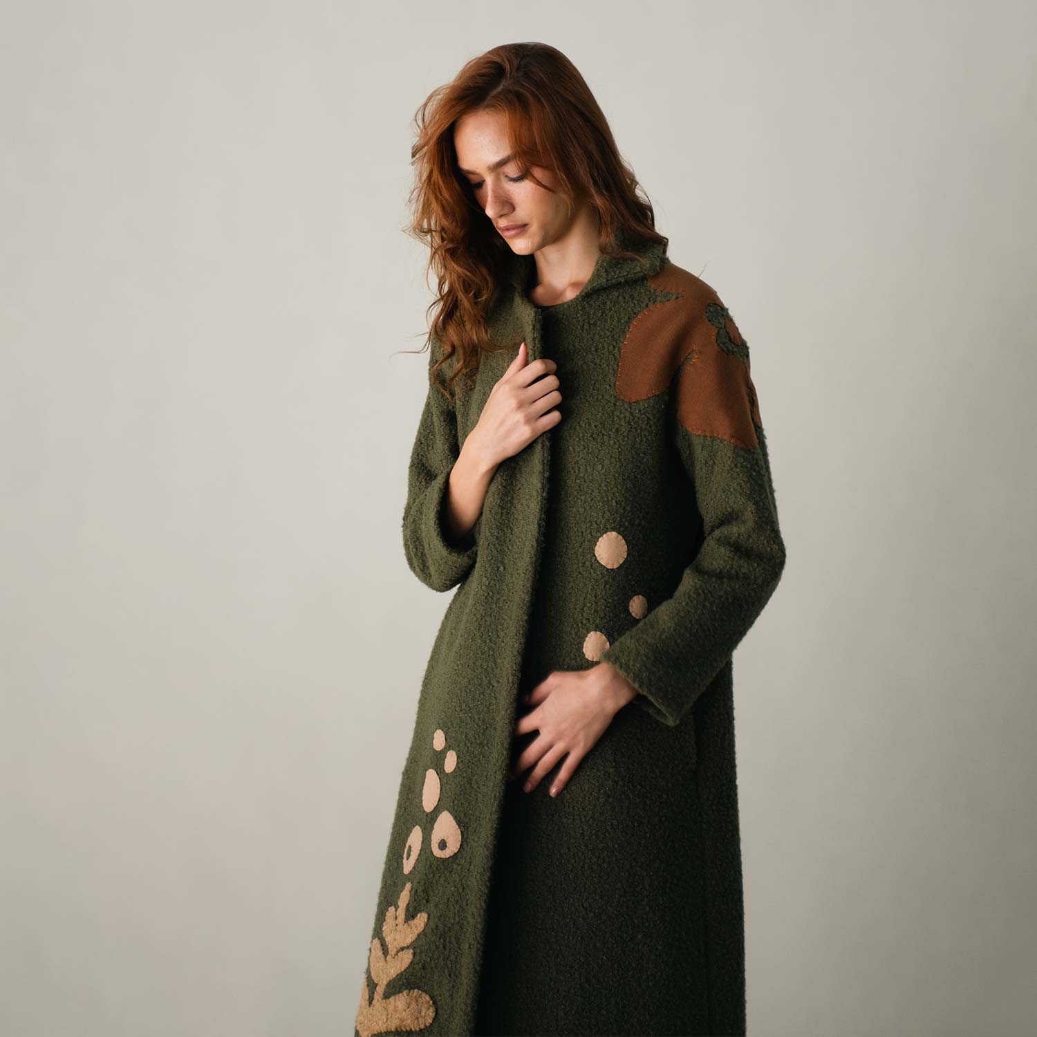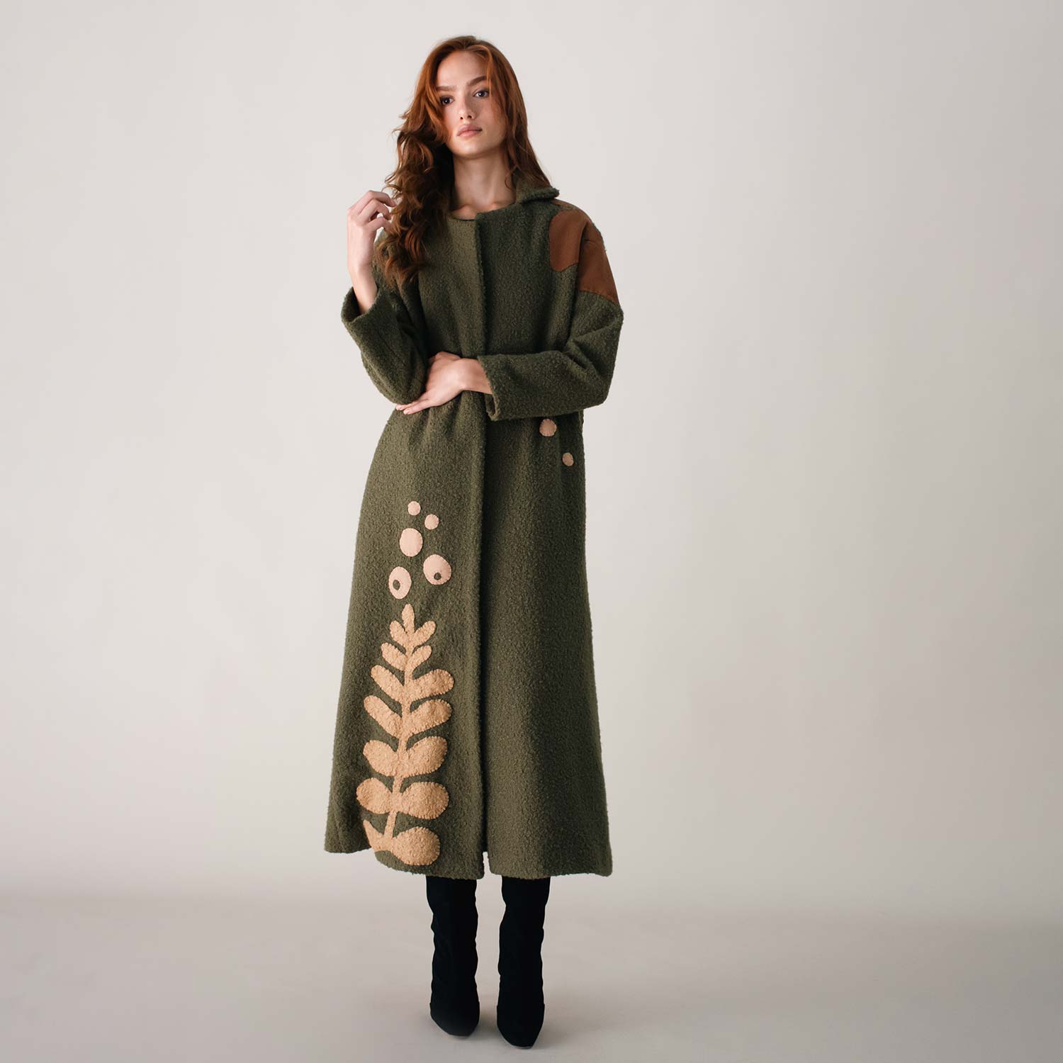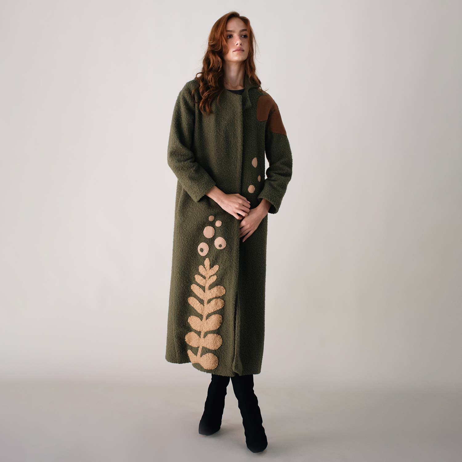 Wrap yourself in warmth with the Liberty on Bouclé Khaki Coat. Crafted from textured bouclé fabric, it’s adorned with hand-embroidered bird motifs in earthy brown thread, bringing a touch of artistry to winter layers. The open-front design and relaxed fit ensure effortless wear, while its longline silhouette offers both comfort and style. A versatile piece, perfect for layering through cooler days with refined ease.