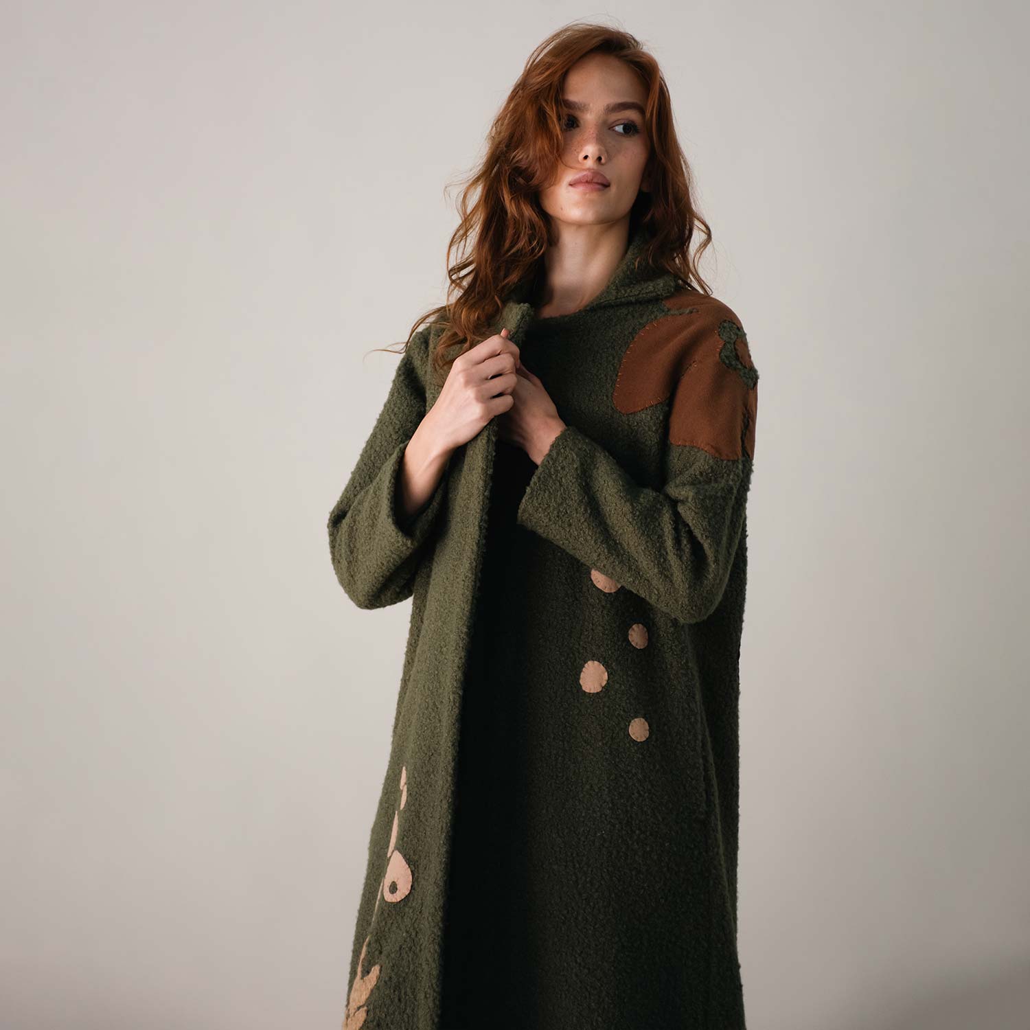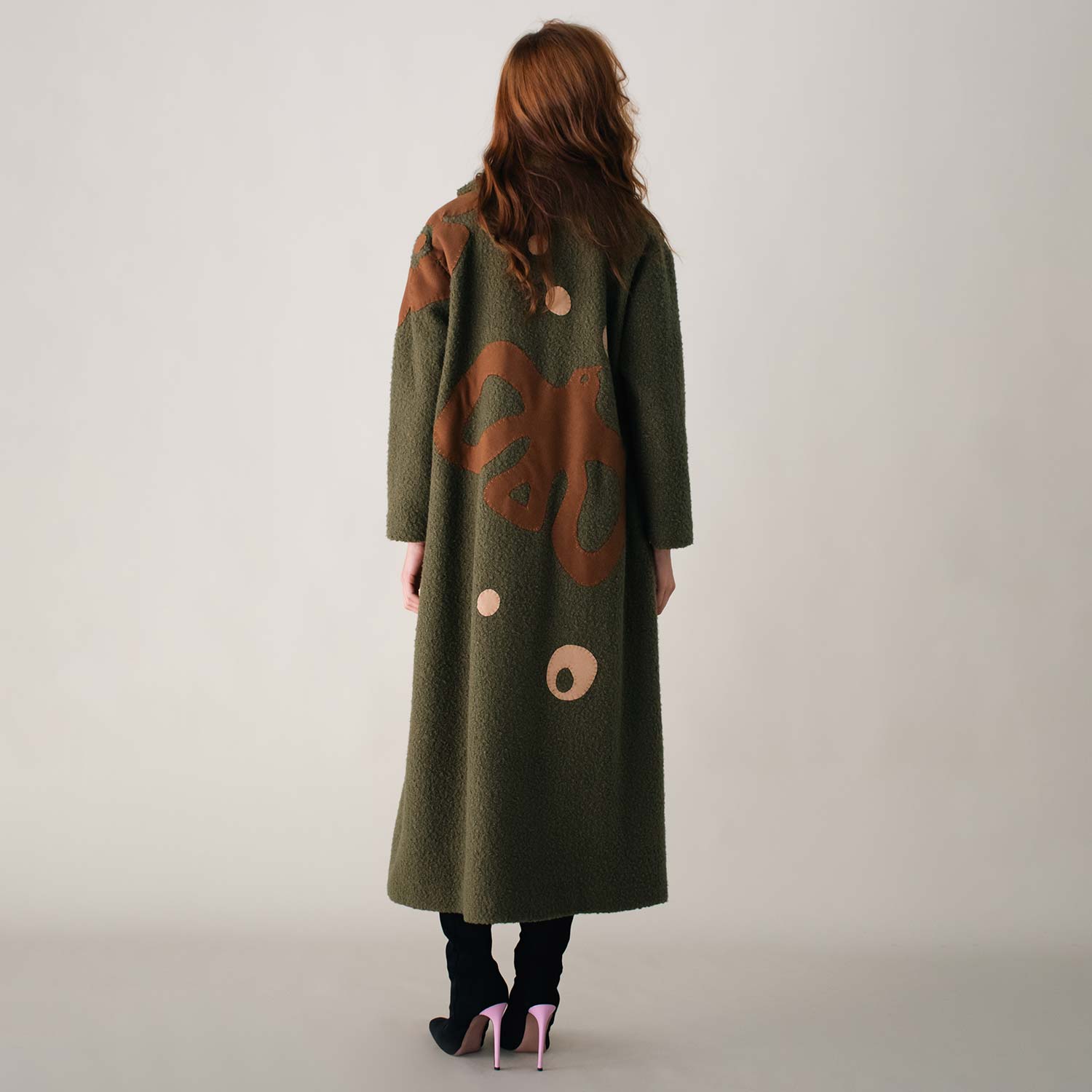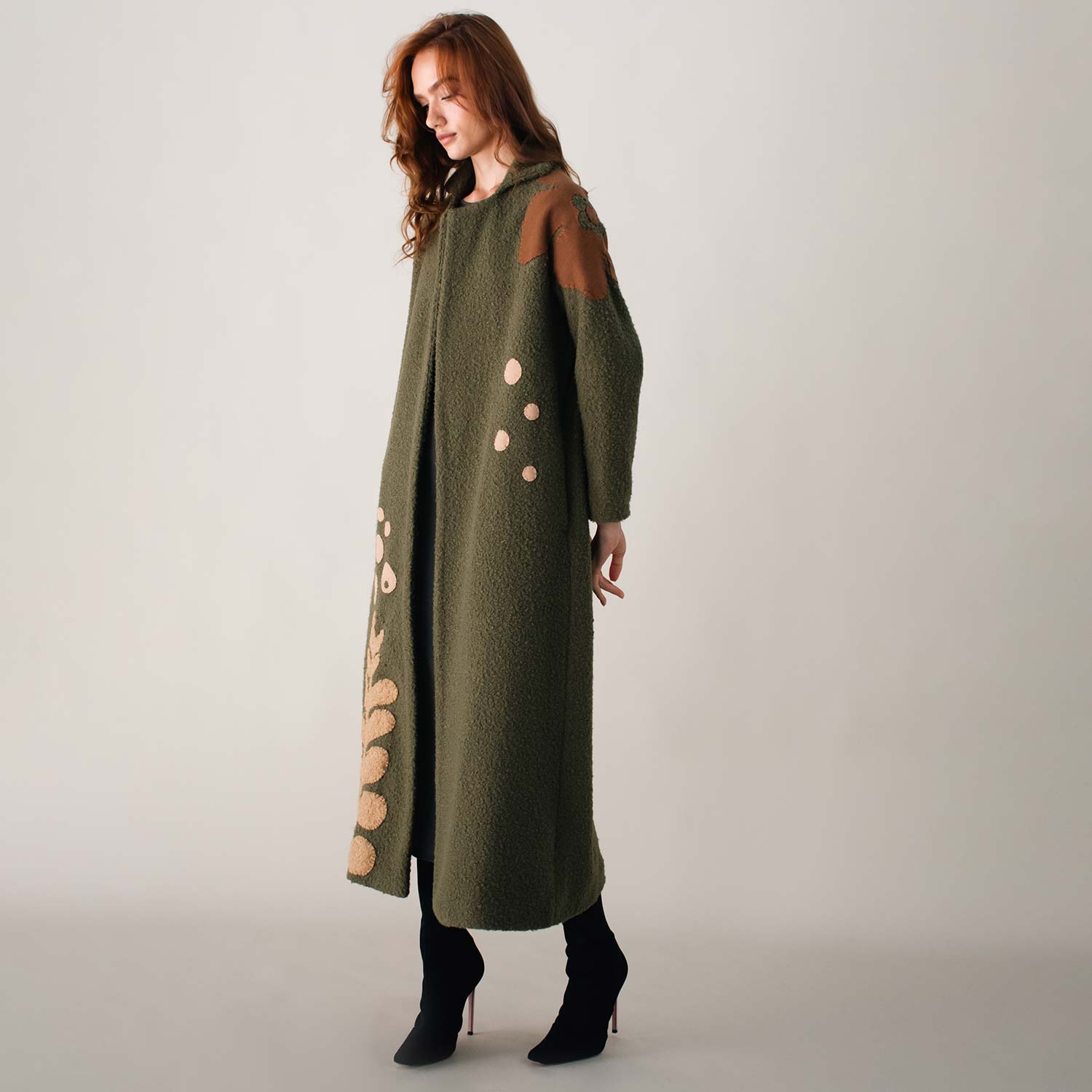 Wrap yourself in warmth with the Liberty on Bouclé Khaki Coat. Crafted from textured bouclé fabric, it’s adorned with hand-embroidered bird motifs in earthy brown thread, bringing a touch of artistry to winter layers. The open-front design and relaxed fit ensure effortless wear, while its longline silhouette offers both comfort and style. A versatile piece, perfect for layering through cooler days with refined ease.