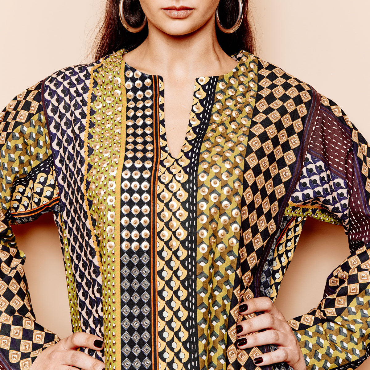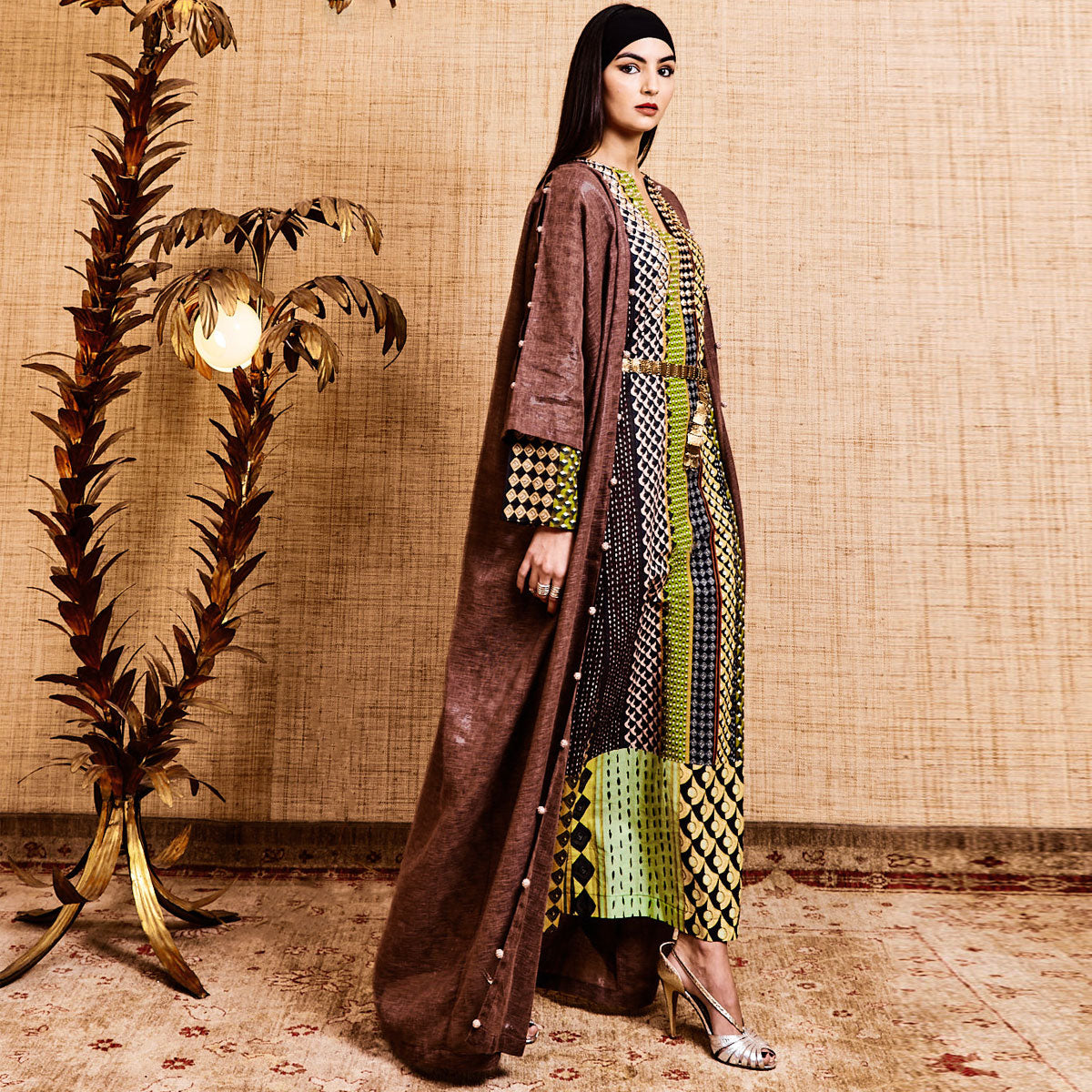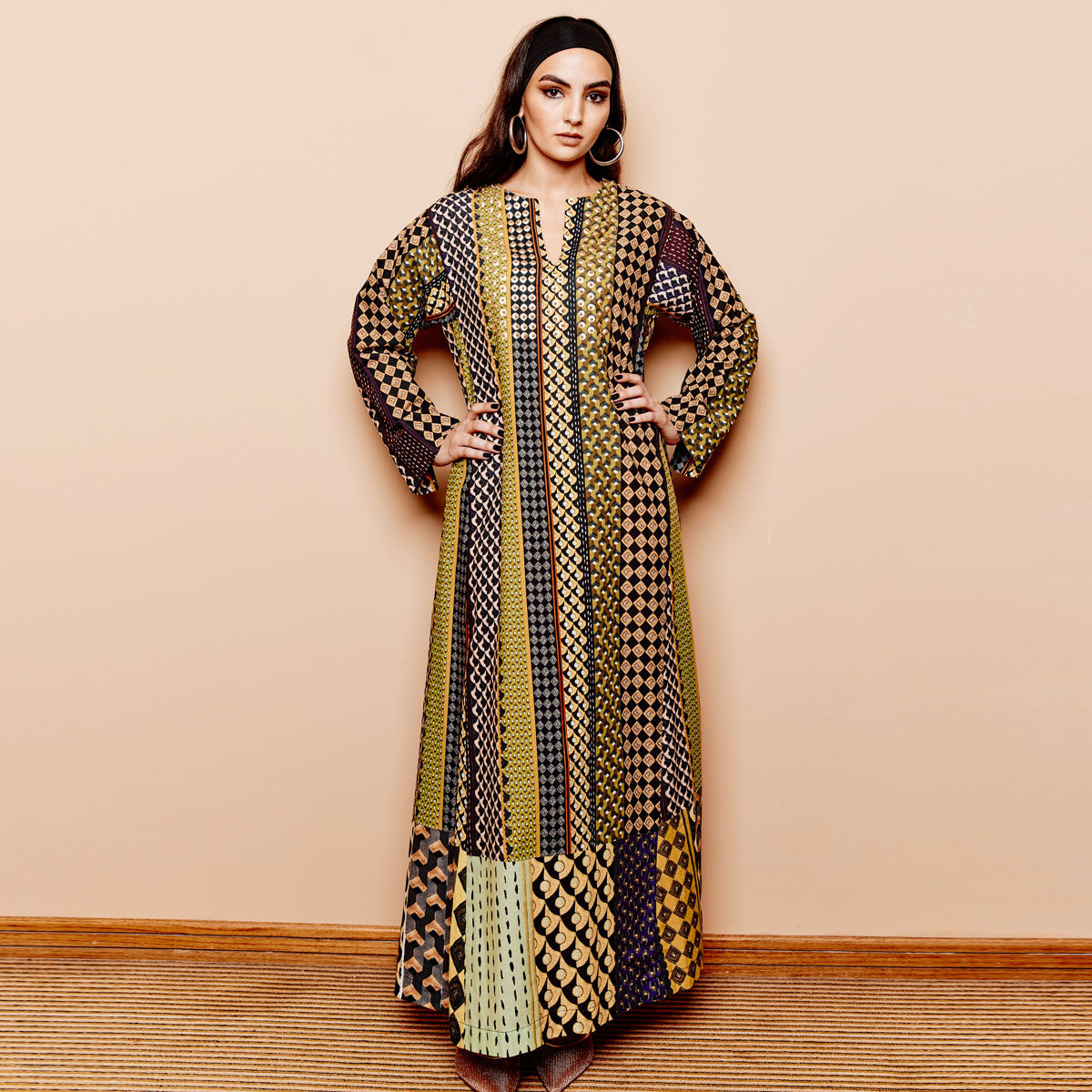 Turn heads with the Nomad Khaki Amal dress, crafted from breathable 100% cotton in a striking retro-inspired print. The fluid silhouette drapes beautifully, creating a flattering and effortless fit. Intricate hand-beaded and sequined embellishments in pale gold bring a touch of understated glamour. Style it alone, belted or loose or layer it under the Crochet Drops on Olive Abaya for an elevated look. Pair it with heels for a sophisticated edge or flats for effortless chic.