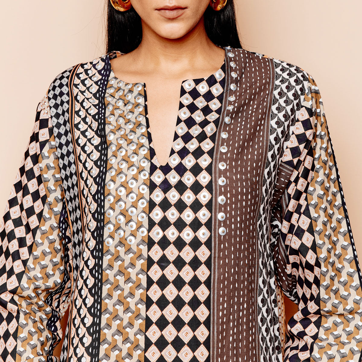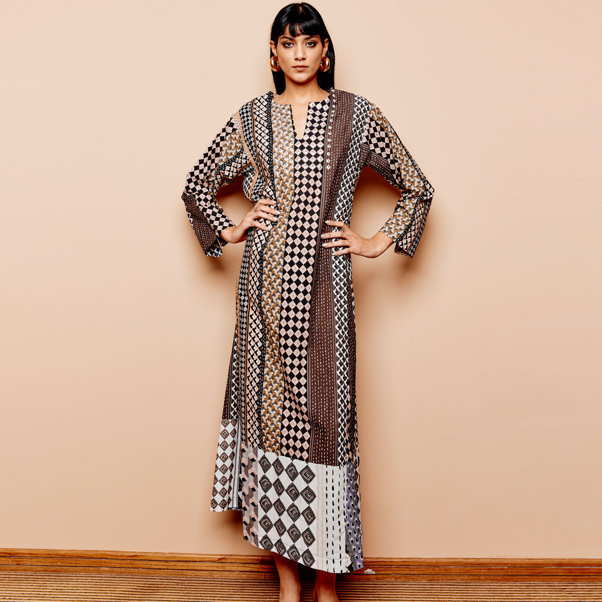 Make a statement with the Nomad Pastel Amal dress, designed in a bold retro pattern from 100% breathable cotton, it drapes effortlessly, offering a fluid yet flattering fit. Delicate hand-beaded and sequined accents in shimmering silver add a touch of subtle glamour. Whether worn solo or layered under the Pearl Drops on Gold Abaya for a more glamorous look, this versatile piece transitions seamlessly from day to evening. Pair it with heels for a polished finish or flats for effortless chic