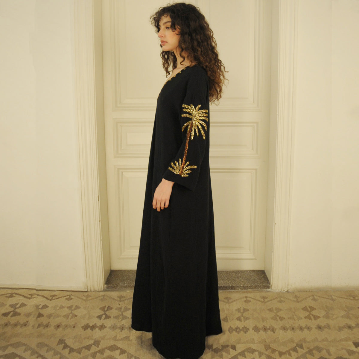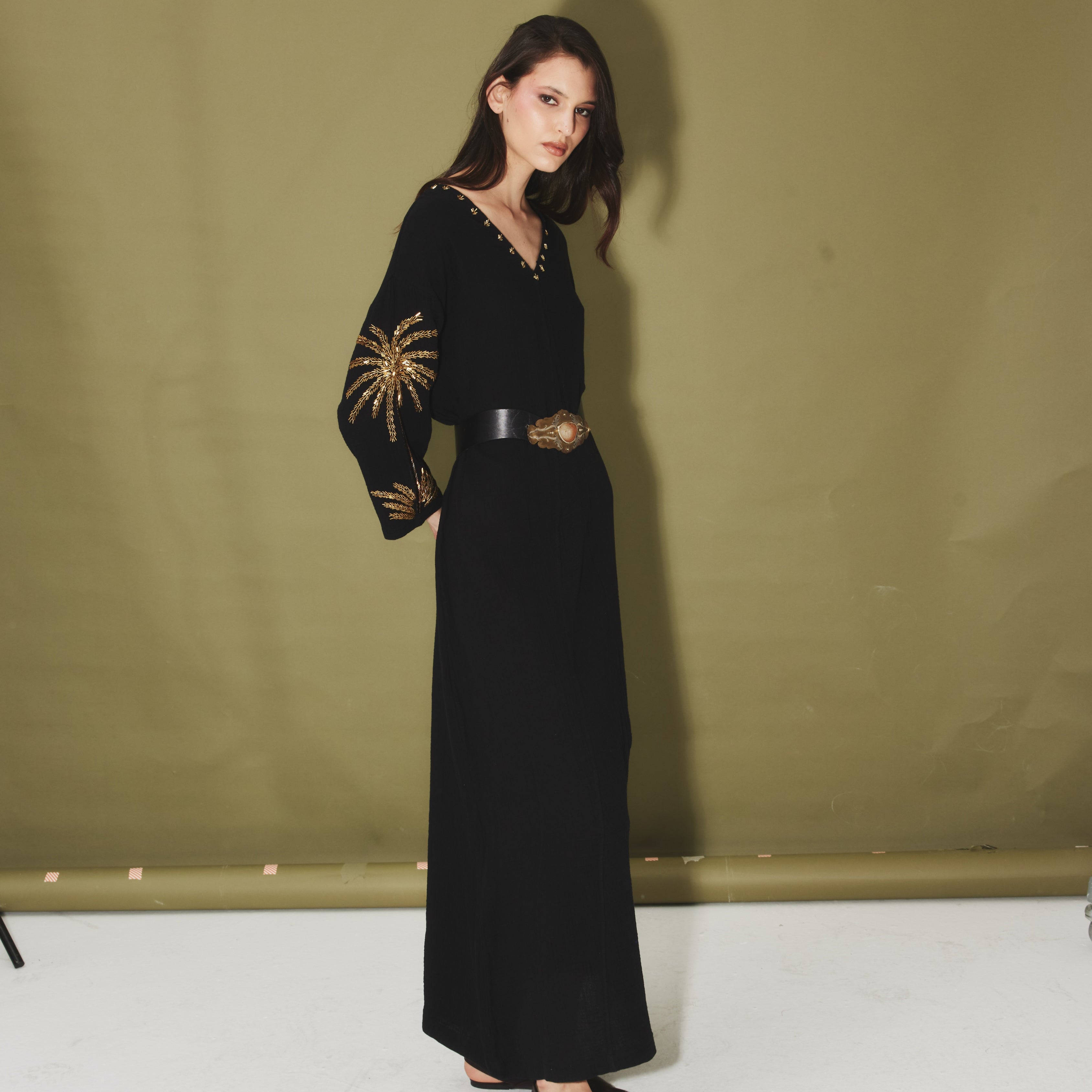 The Palm Gold Sleeve Black Rania offers a contemporary take on traditional elegance. Crafted from breathable black cotton, this versatile V-neck design features gleaming palm trees exquisitely hand-beaded on the full sleeves. Whether styled as a jalabiya under a abaya or worn as a chic belted maxi dress, it delivers effortless sophistication and pairs beautifully with minimal accessories and statement footwear.