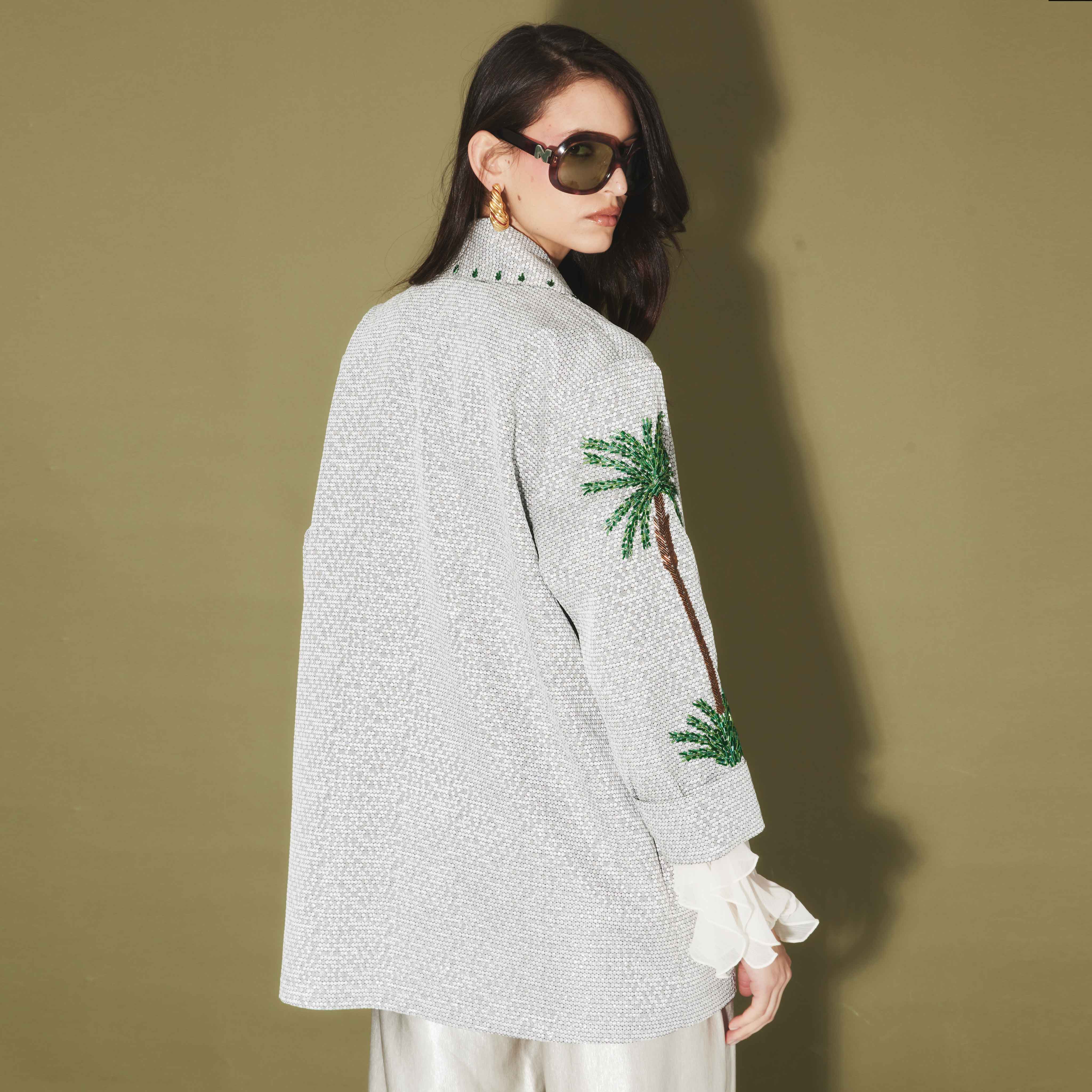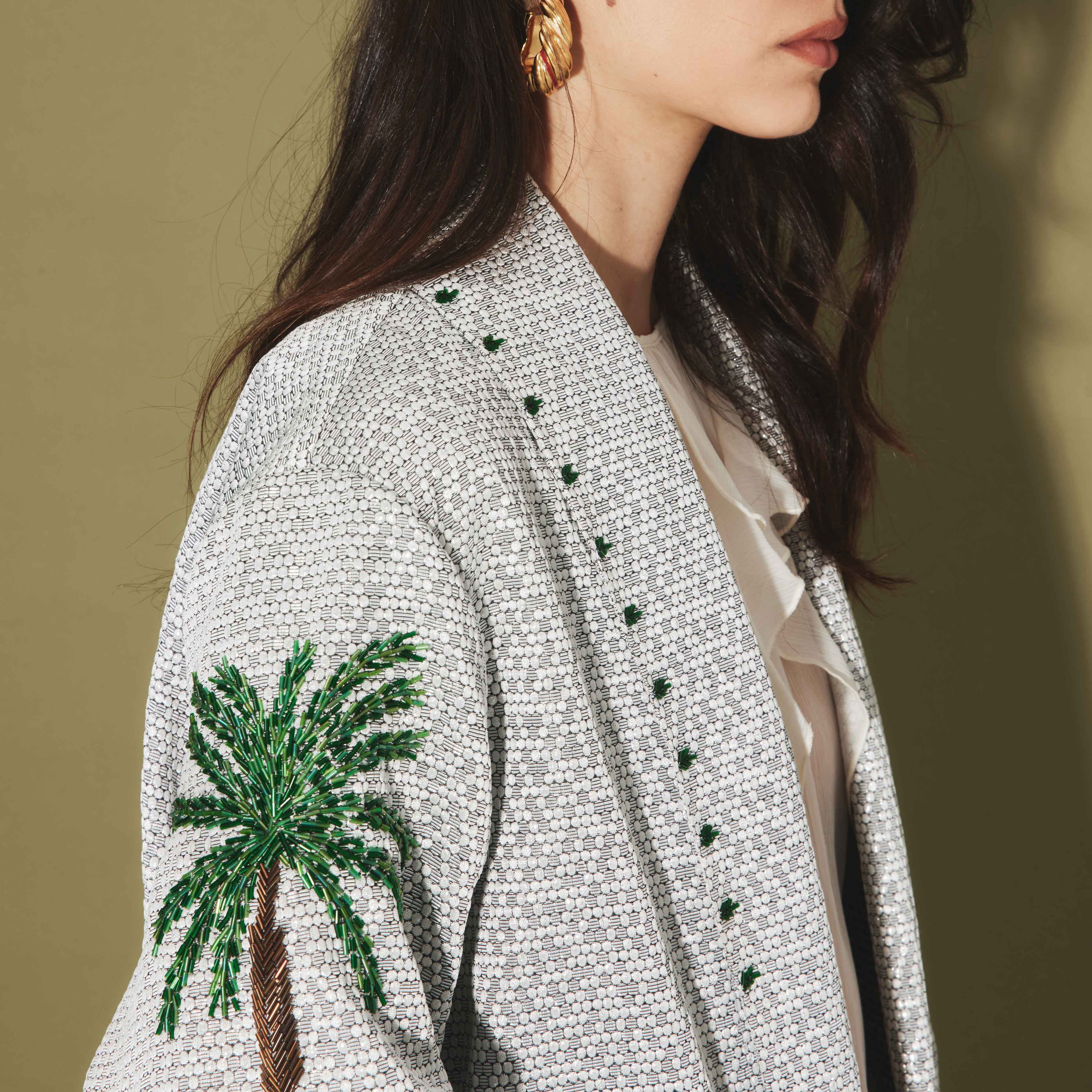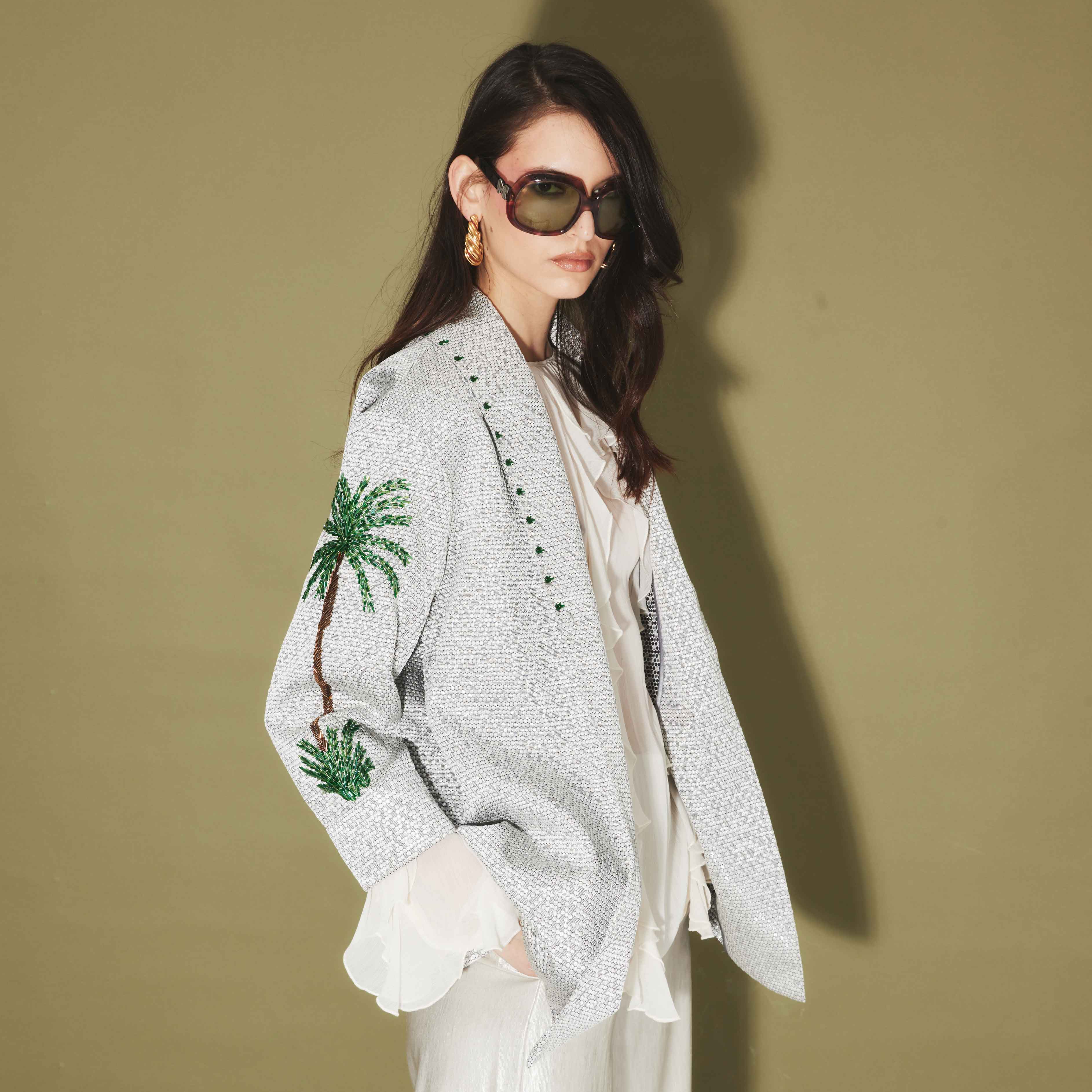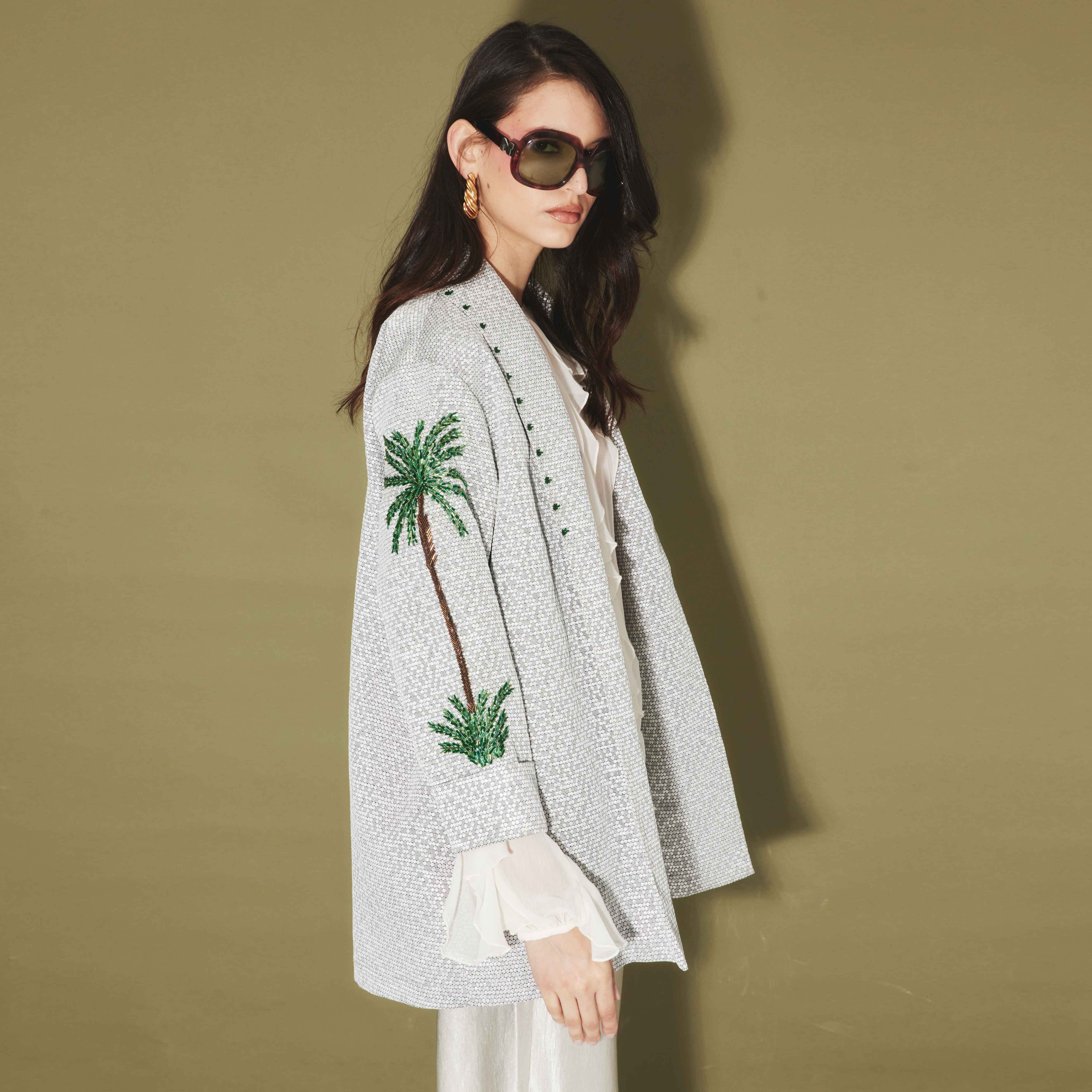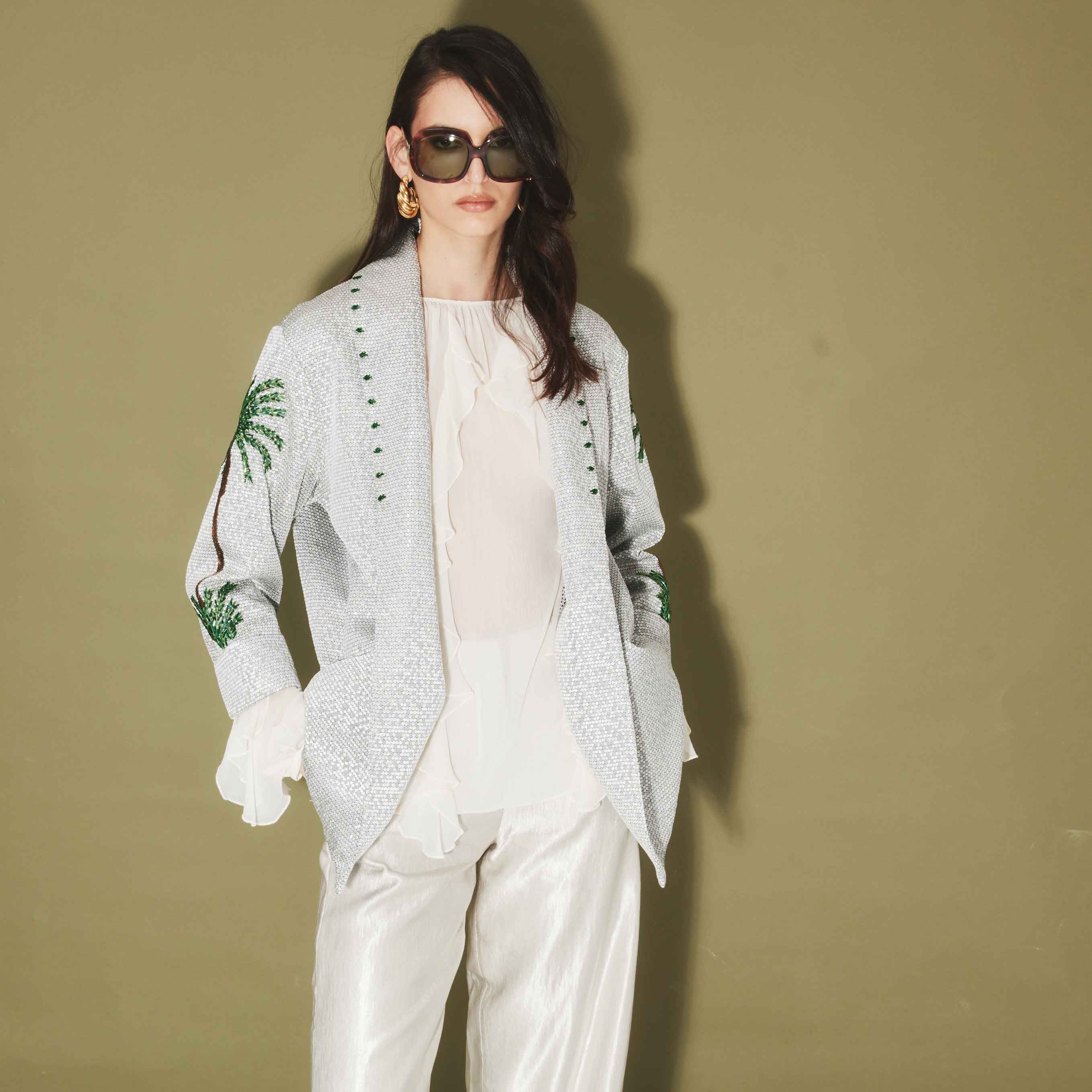 The Palm Honeycomb Silver Jacket offers a contemporary take on timeless elegance with its structured silhouette and shimmering silver honeycomb fabric. Green hand-beaded palm trees sparkle along the sleeves and subtle embellishments on the lapels provide a delicate accent. Whether paired with tailored pieces or layered over evening wear, this versatile jacket delivers an effortlessly glam statement for any occasion.
