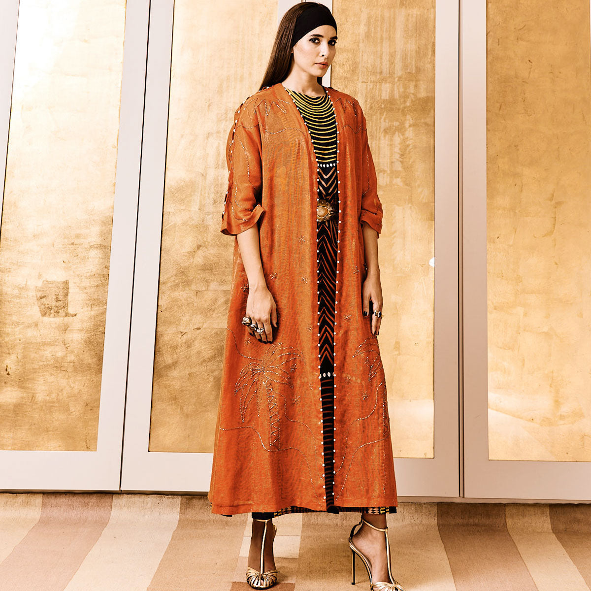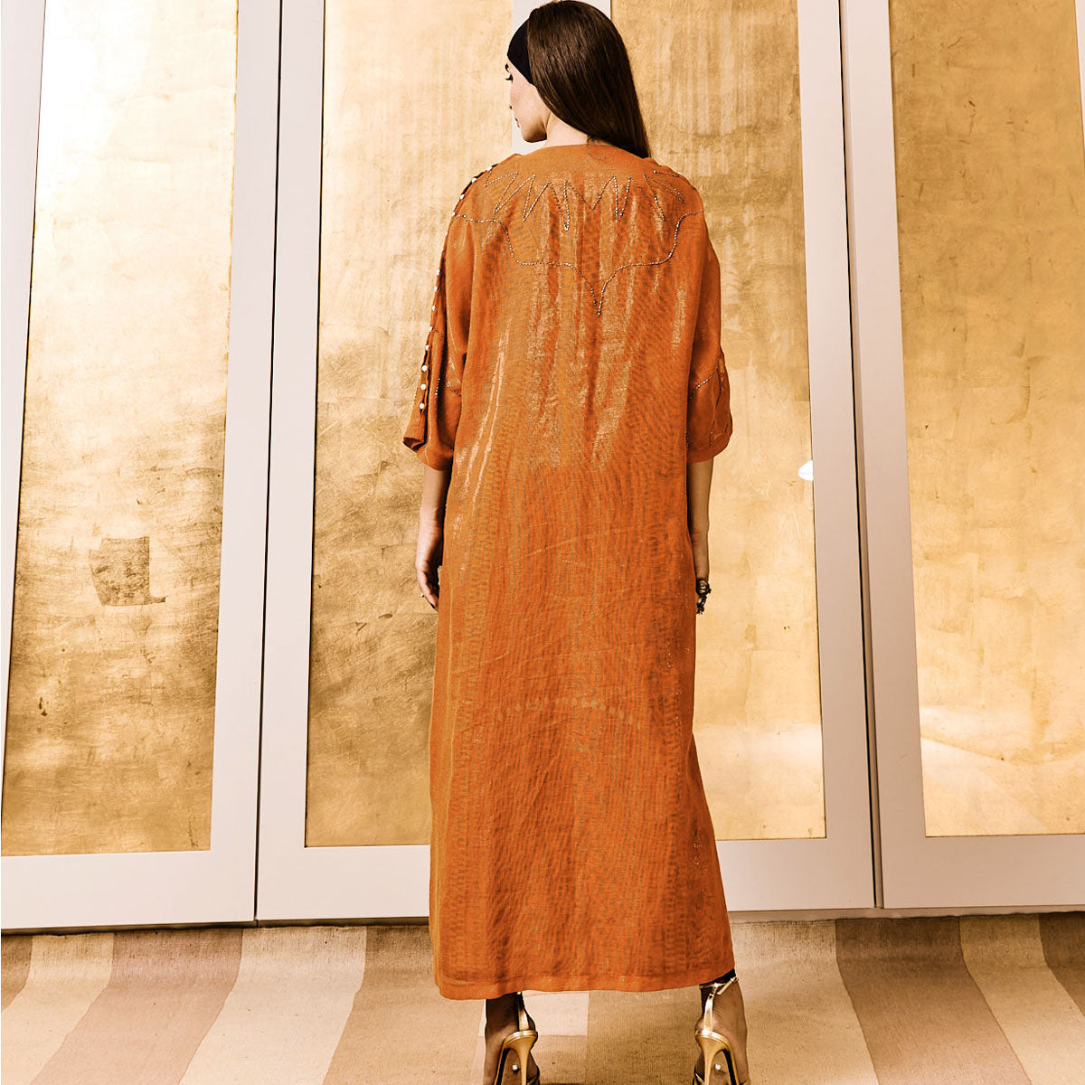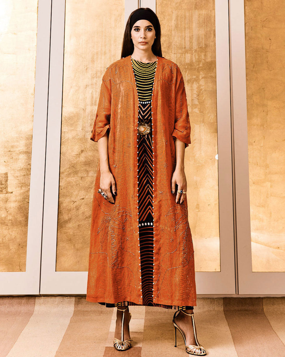 Turn heads with the Pearl Drops on Palm Rust Abaya. The rich burnt orange fabric is adorned with intricately hand-beaded palm tree and celestial motifs, adding a touch of shimmer and depth. Designed with a sleek, straight silhouette, it drapes elegantly, while pearl embellishments along the sleeves and front lapels offer a refined finish. Perfect for special occasions or everyday elegance, pair it with statement accessories for a striking look.
