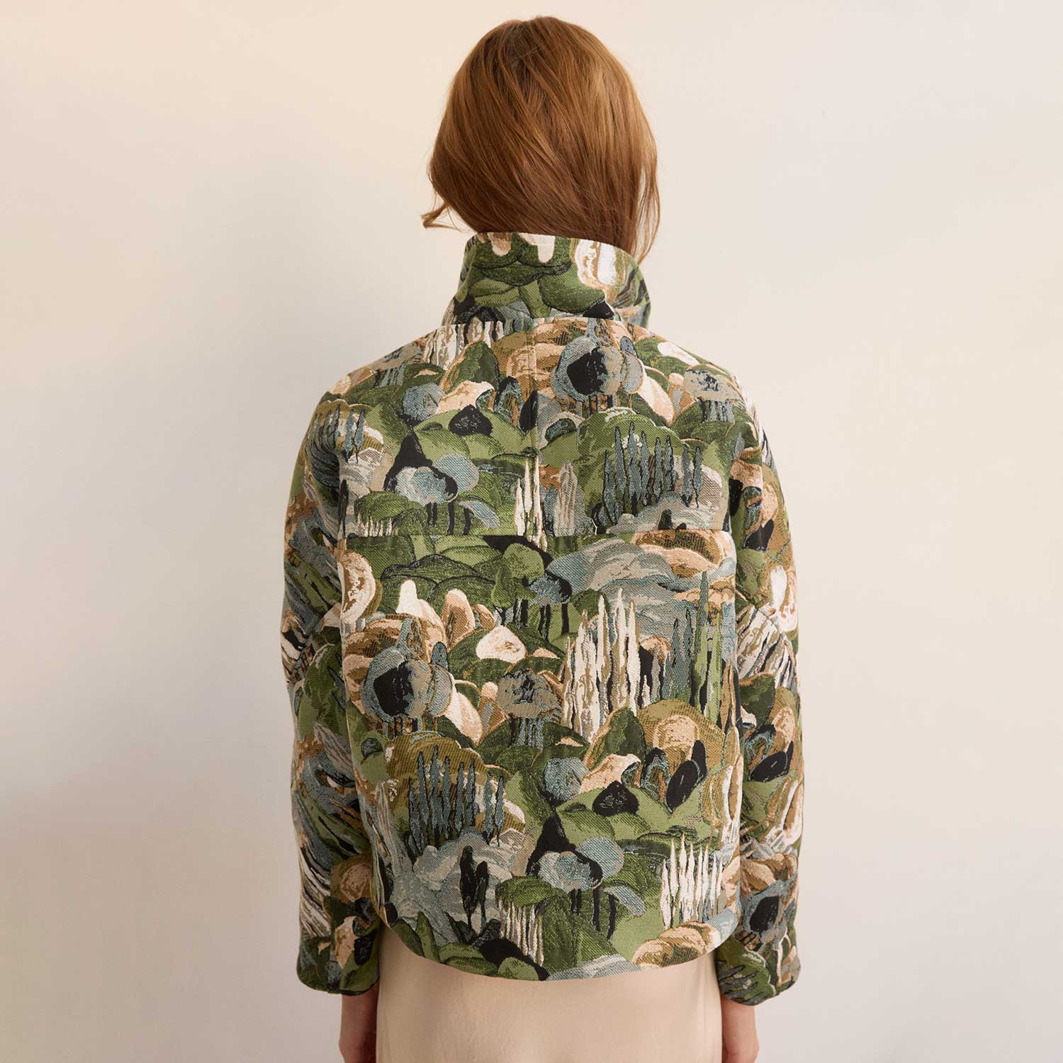 The Pine Forest on Yas Jacket is crafted from richly woven jacquard with an intricate forest-inspired tapestry design. The notched collar, and front closure provide a tailored shape, while the dense weave offers warmth and protection against colder weather. With its textured finish and bold patterning, this versatile piece is designed as a layering essential for winter, combining function with a striking look.