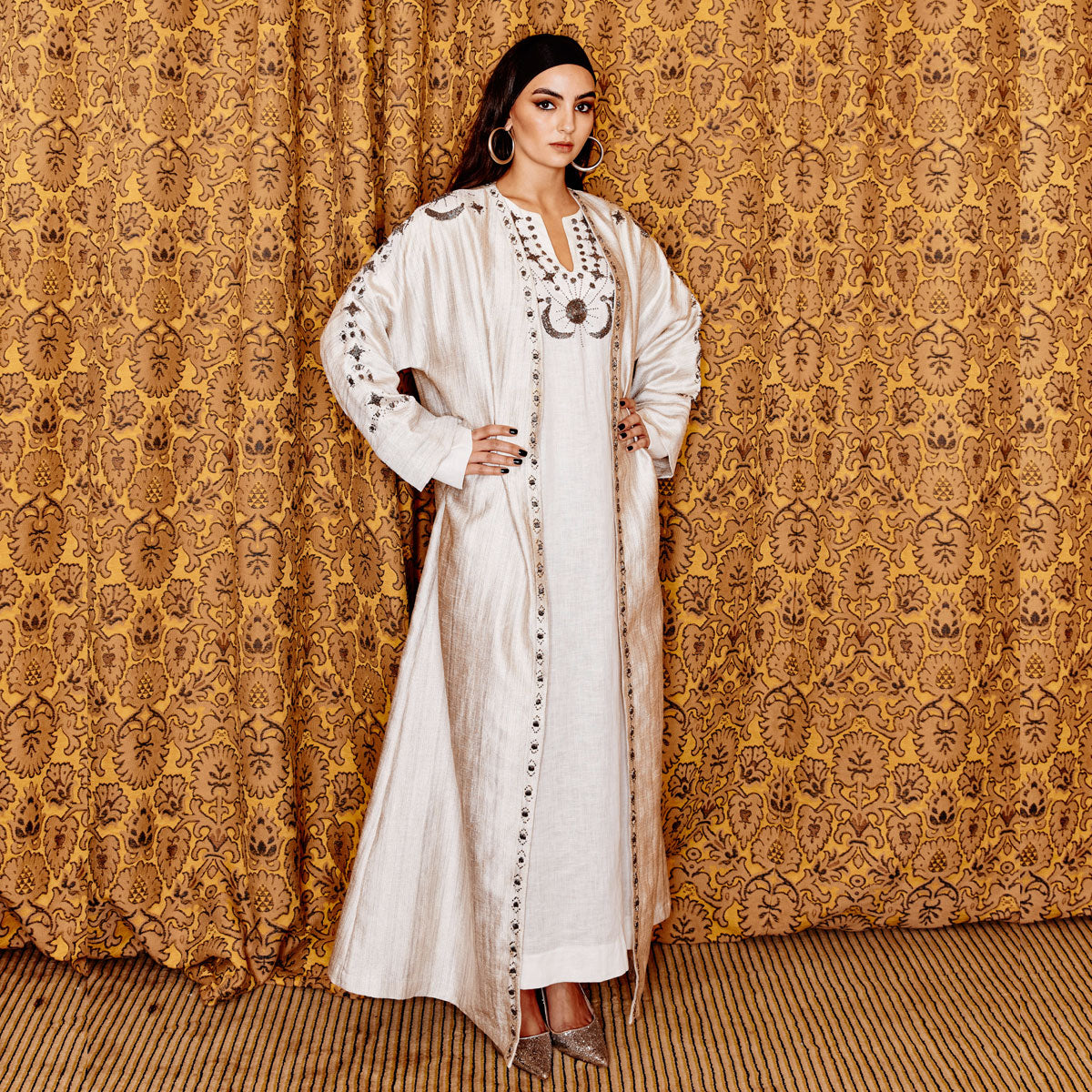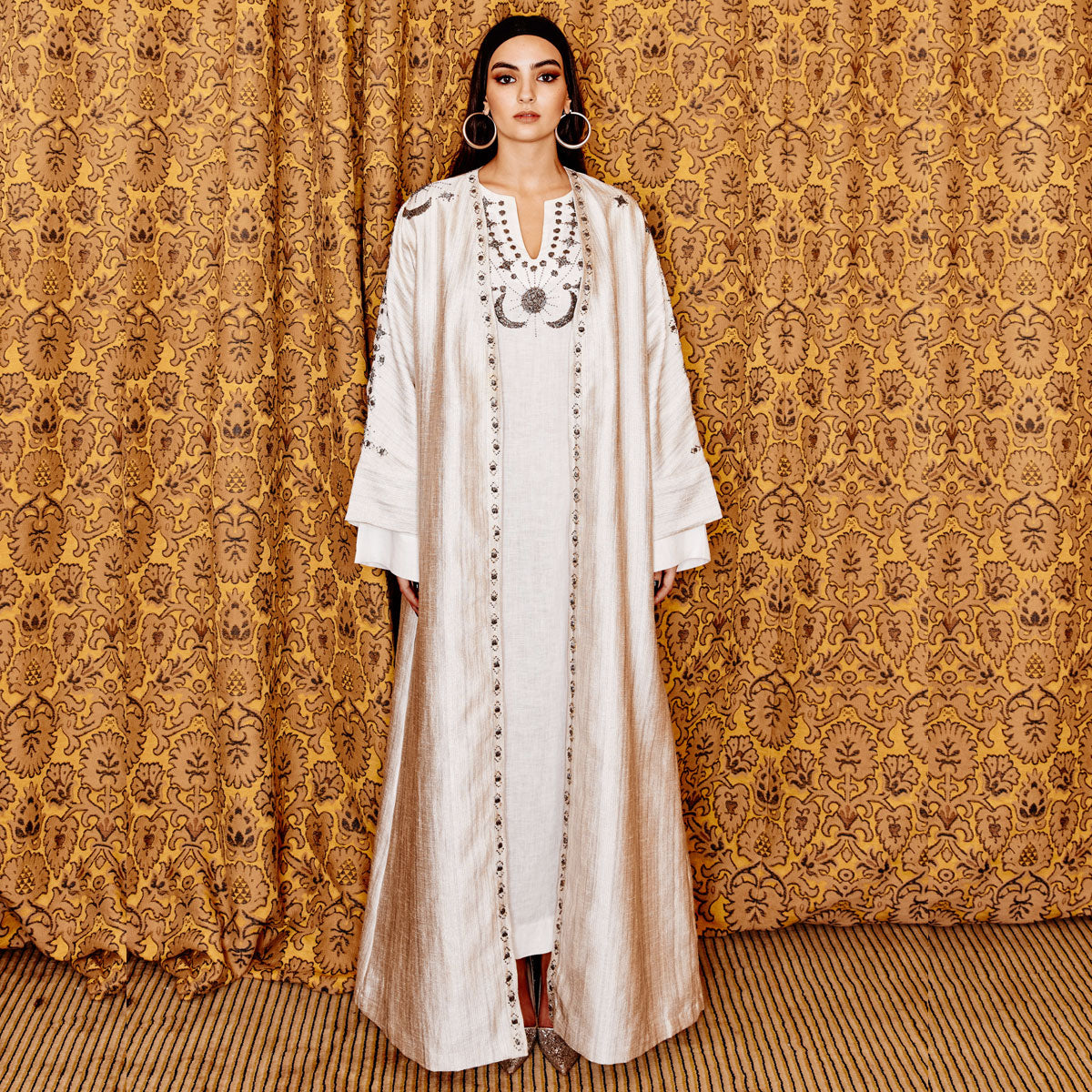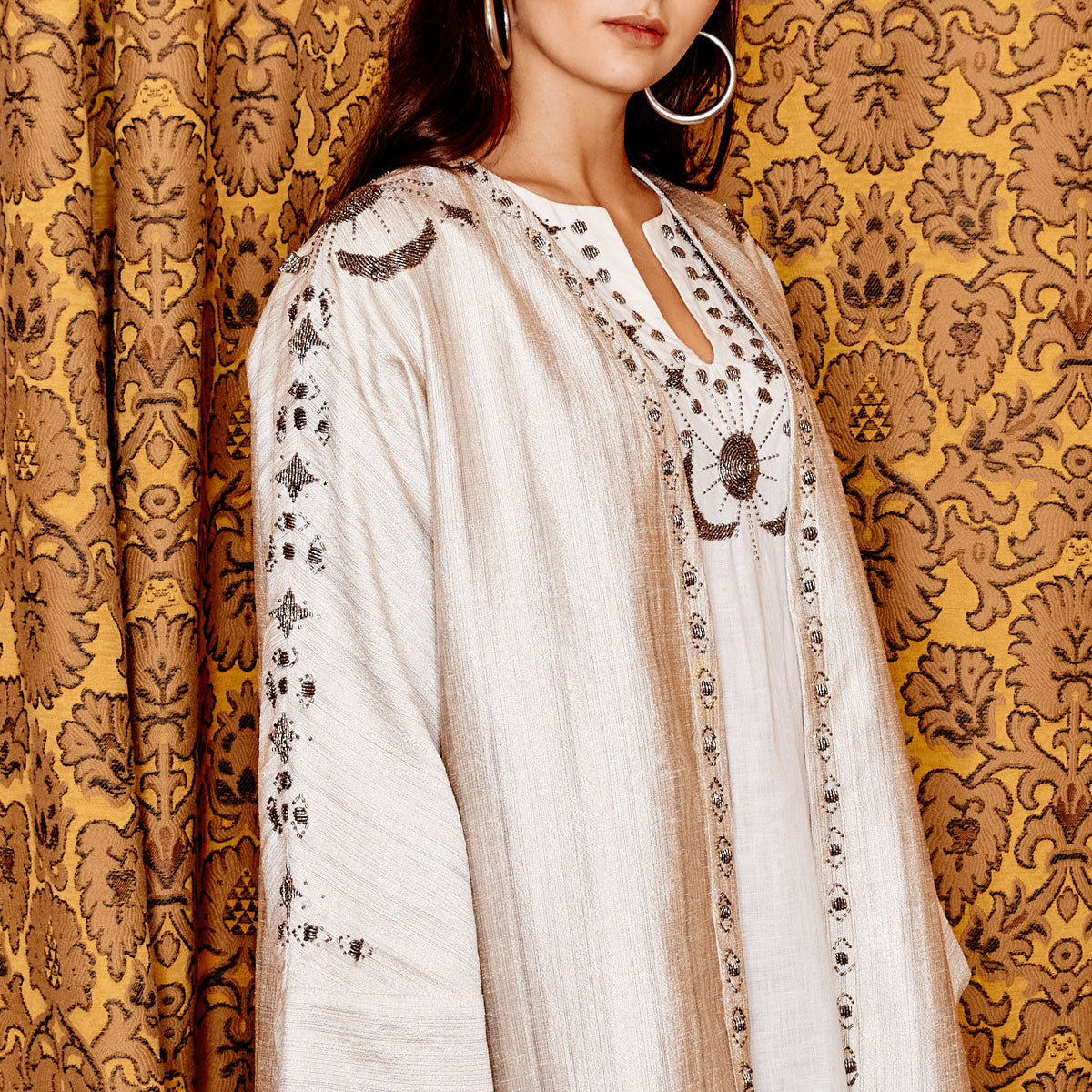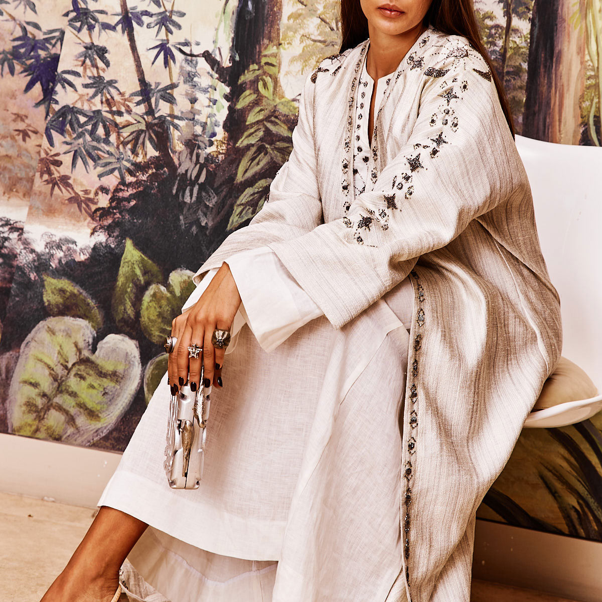 The Rising Moon Sleeve on Sugar Abaya blends celestial elegance with modern sophistication. Hand-beaded anthracite moons, suns, and stars cascade from the shoulders down the sleeves. Crafted from a shimmering pearly-colored raw silk blend, it drapes beautifully in a flowing ankle-length silhouette with full-length sleeves. Whether layered over the matching Rising Moon on White Amal jalabiya or styled with an evening ensemble, this abaya offers versatile styling for Ramadan gatherings and special occasions. Pair it with understated jewelry and heels for an elegant finish.