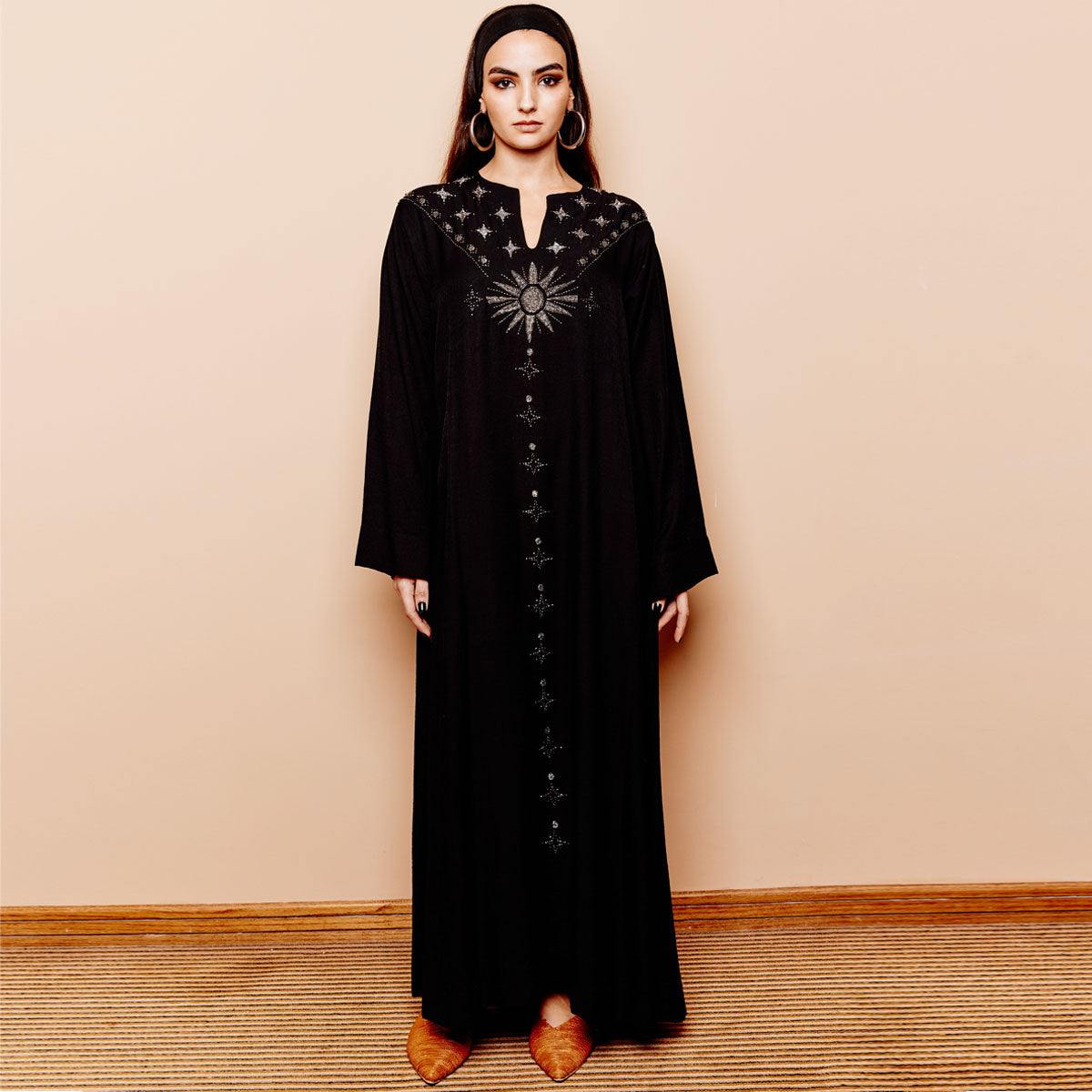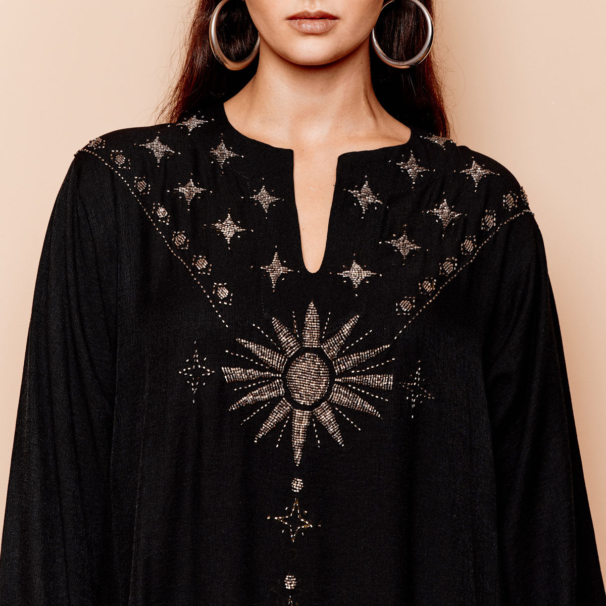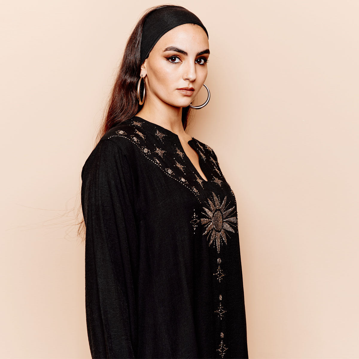 The Rising Sun on Black Amal dress offers a celestial-inspired take on effortless elegance. Crafted from lightweight textured cotton, it features a striking hand-beaded sun in silvery glass beads, surrounded by shimmering stars that reach the shoulders and flow down the length the dress. The relaxed silhouette can be worn as a flowing jalabiya under the coordinating Rising Sun Sleeve on Black Abaya or styled solo as a maxi dress. For a more tailored look, cinch the waist with a statement belt and pair with bold accessories for a sophisticated finish.