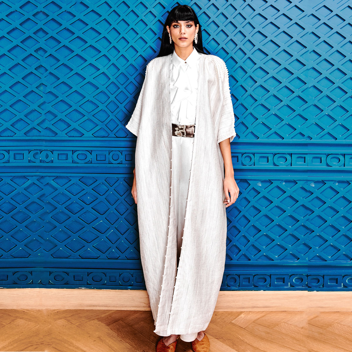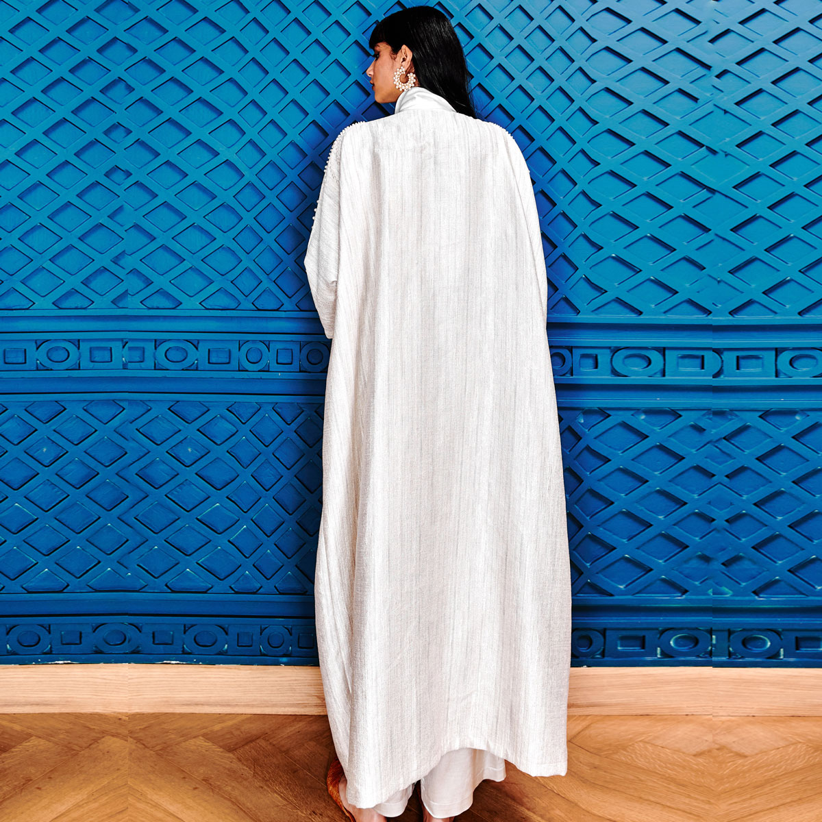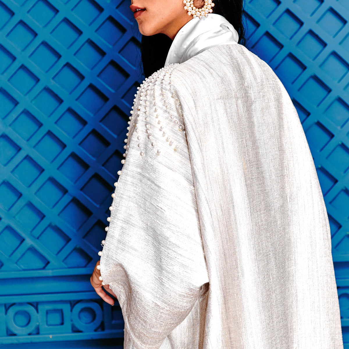 Step into refined elegance with the Swirls of Pearls on Sugar Abaya. Crafted from a shimmering pearly-white raw silk blend, it drapes effortlessly to create a sleek, elongated silhouette. Intricately hand-beaded pearl fronds cascade from the shoulders, flowing down the sleeves and front lapels for a touch of understated glamour. Featuring three-quarter sleeves and an ankle-grazing hem, this versatile piece pairs effortlessly with both flats and heels, making it an ideal choice for elevated evening looks. Complete the ensemble with statement earrings and a signature Sarah’s Bag for a polished finish.