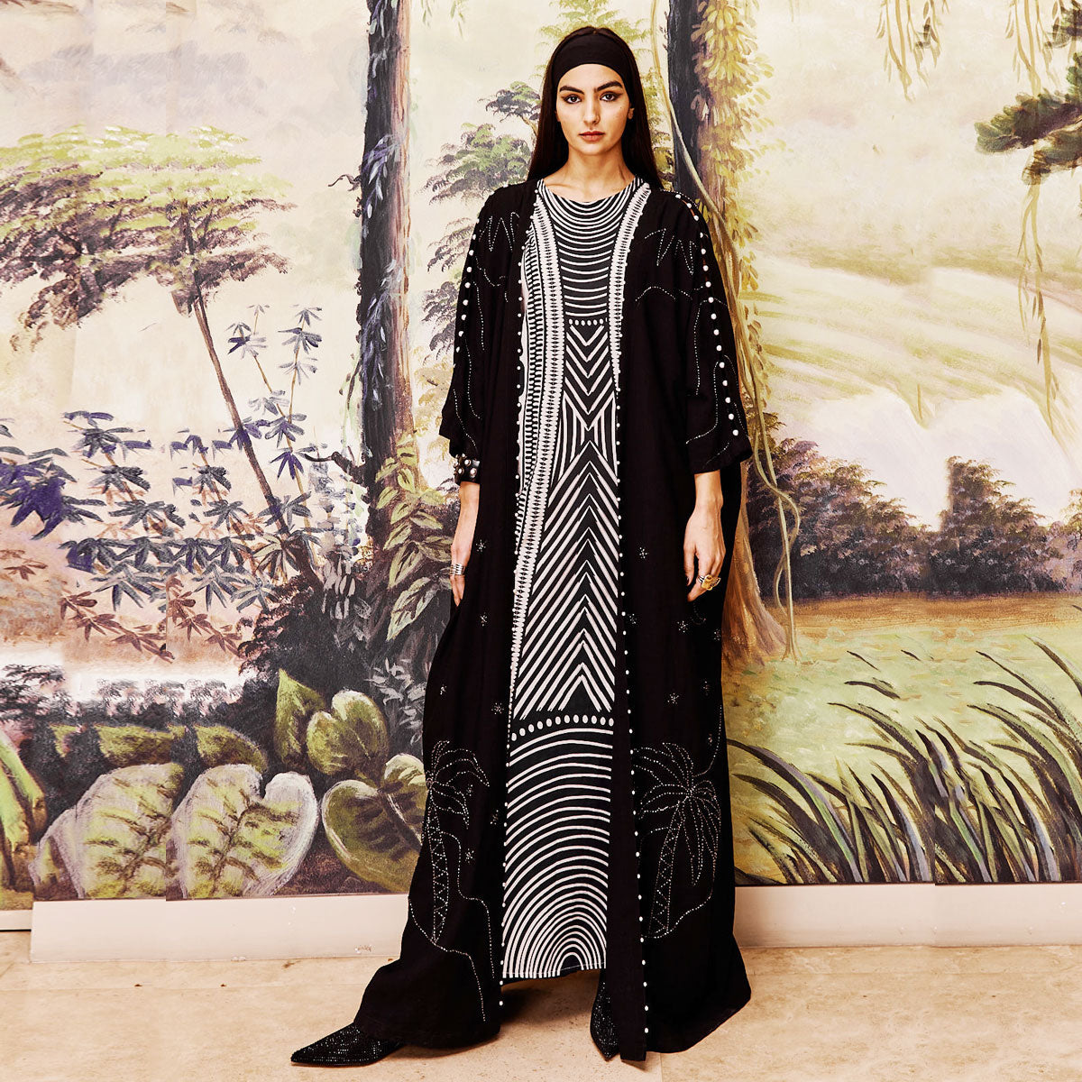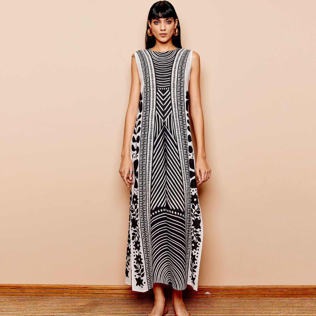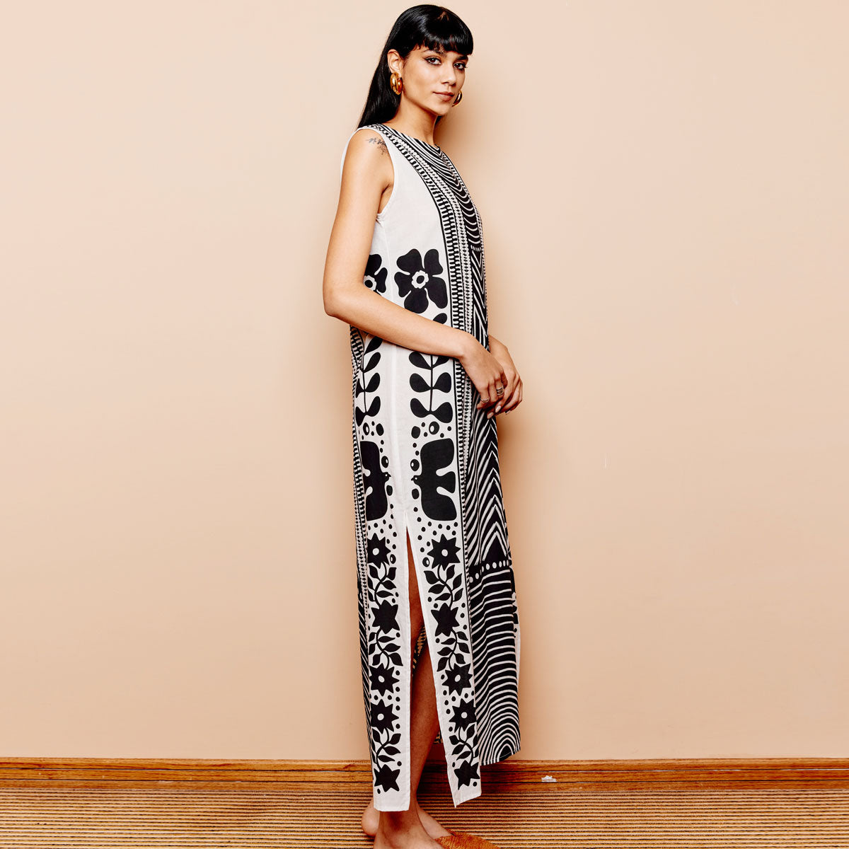 The Tribal Cotton Mono Vanda maxi dress delivers effortless style with its striking black and white geometric and floral motifs. Designed in breathable cotton, the sleeveless silhouette falls elegantly to the ankles with a subtle side slit for fluid movement. Versatile and easy to style, it transitions seamlessly from day to evening—pair it with sandals for a laid-back look or elevate it with a belt, heels and abaya for a refined finish.