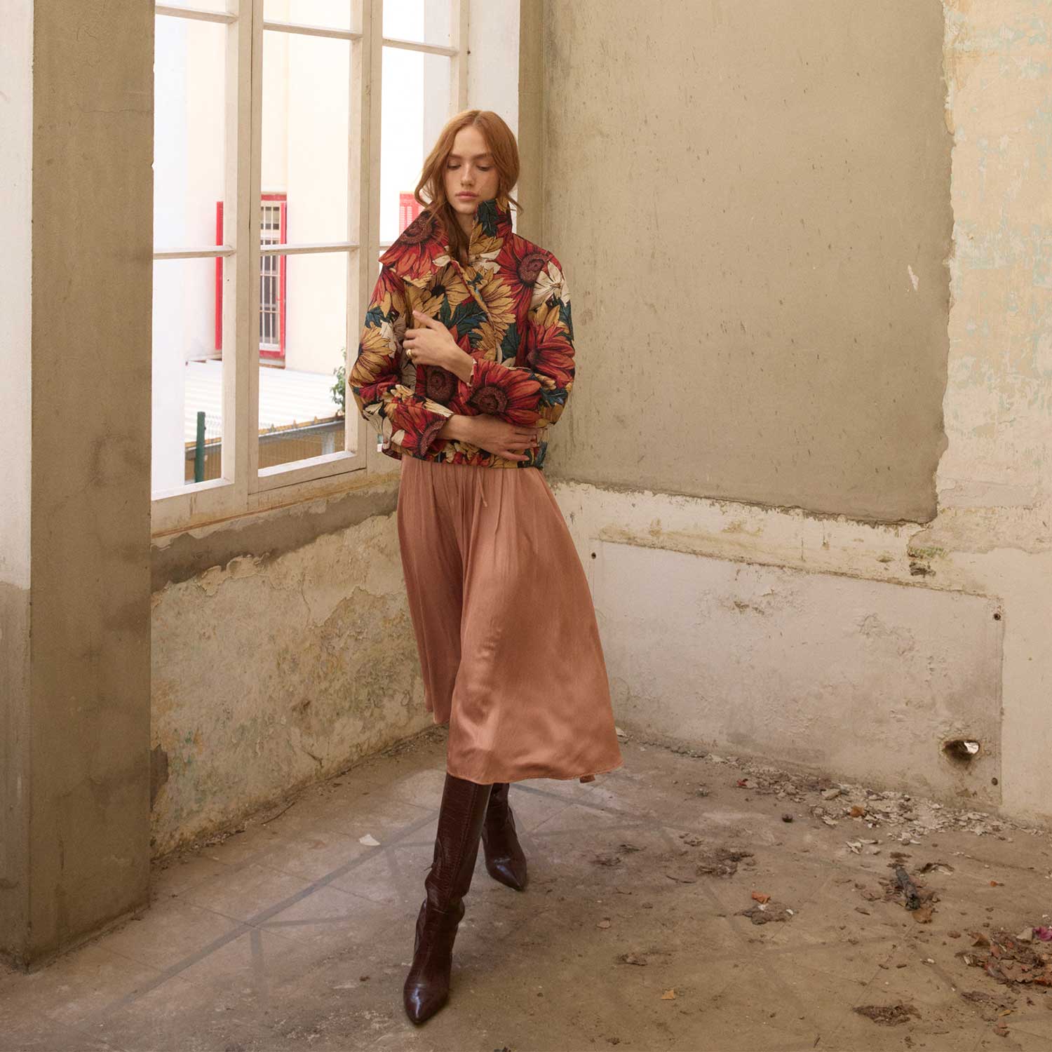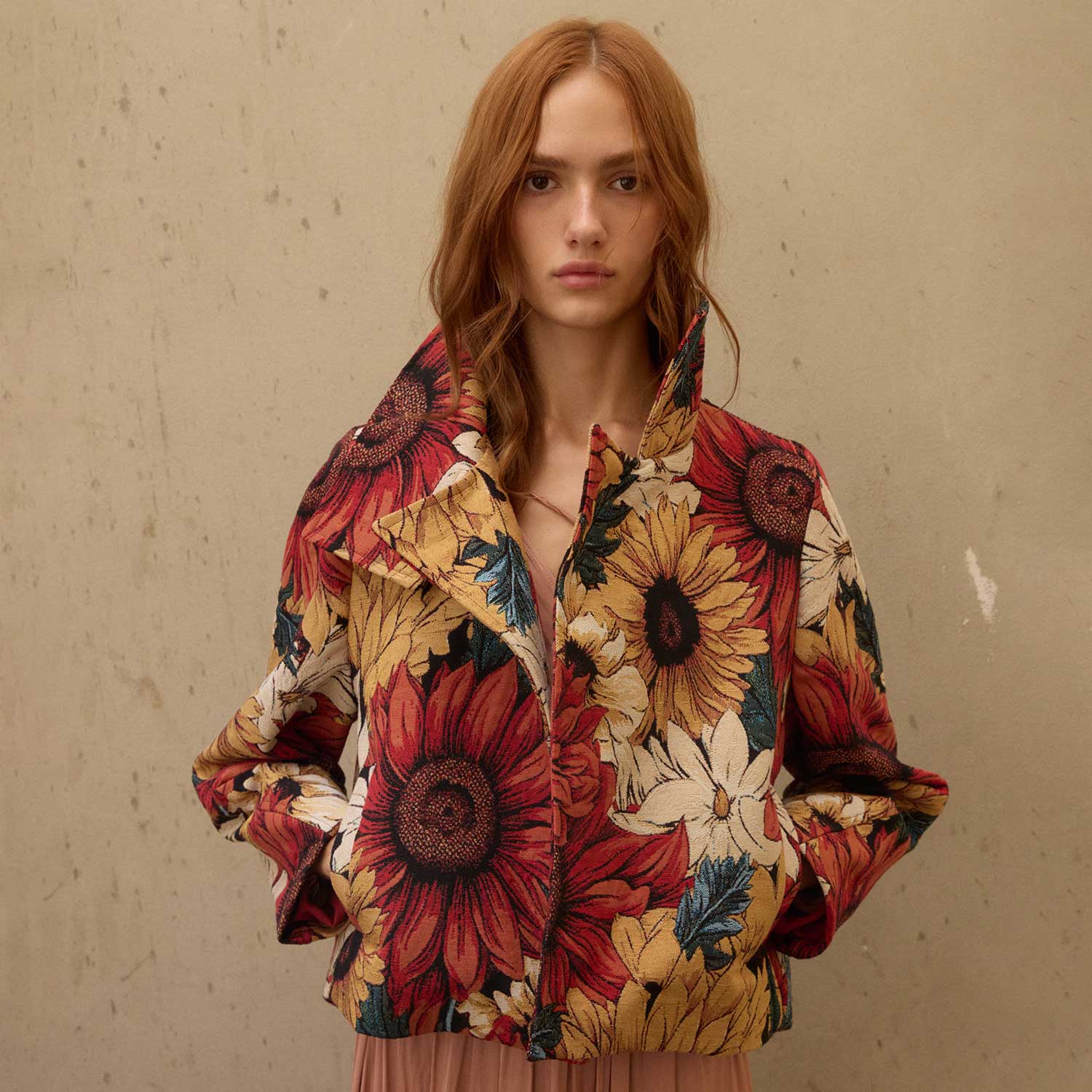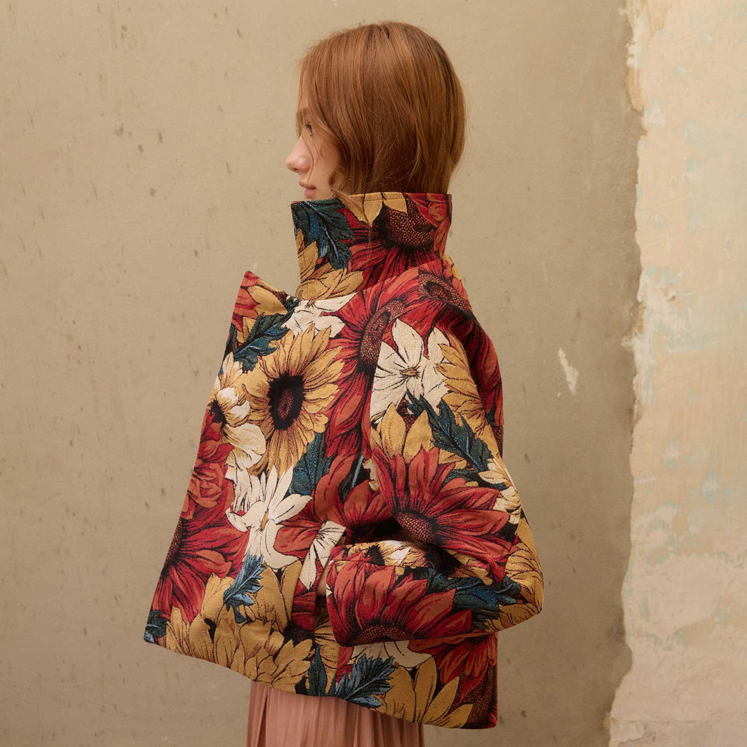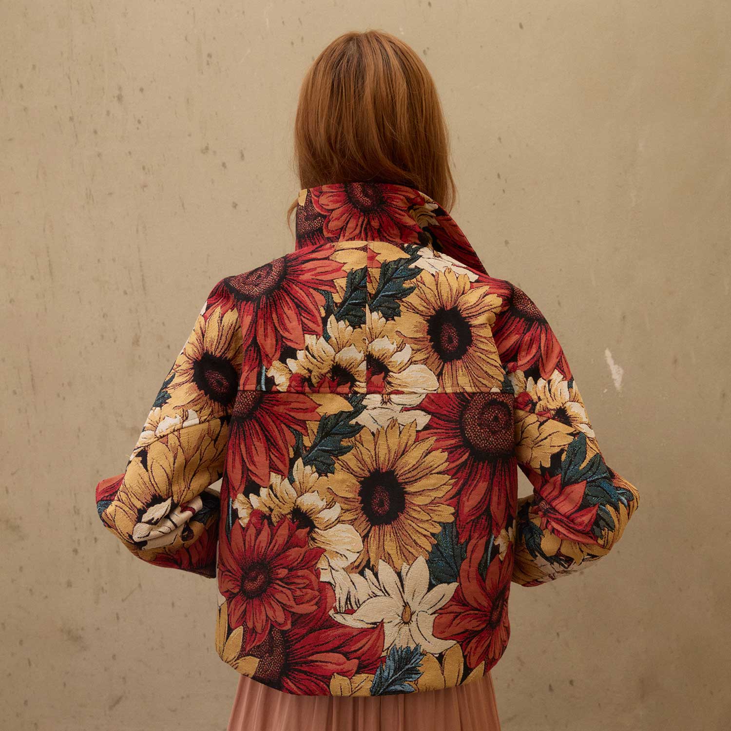 Belonging to The Grounded Collection, the Wild Petals on Yas Jacket bursts with vibrant florals in richly woven jacquard. Sunflowers and daisies bloom across its structured silhouette, blending bold colors with textured depth. Designed with a notched collar and front closure, it’s a versatile statement piece that brings warmth and artistry to cooler seasons.