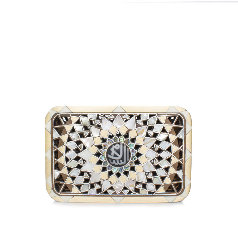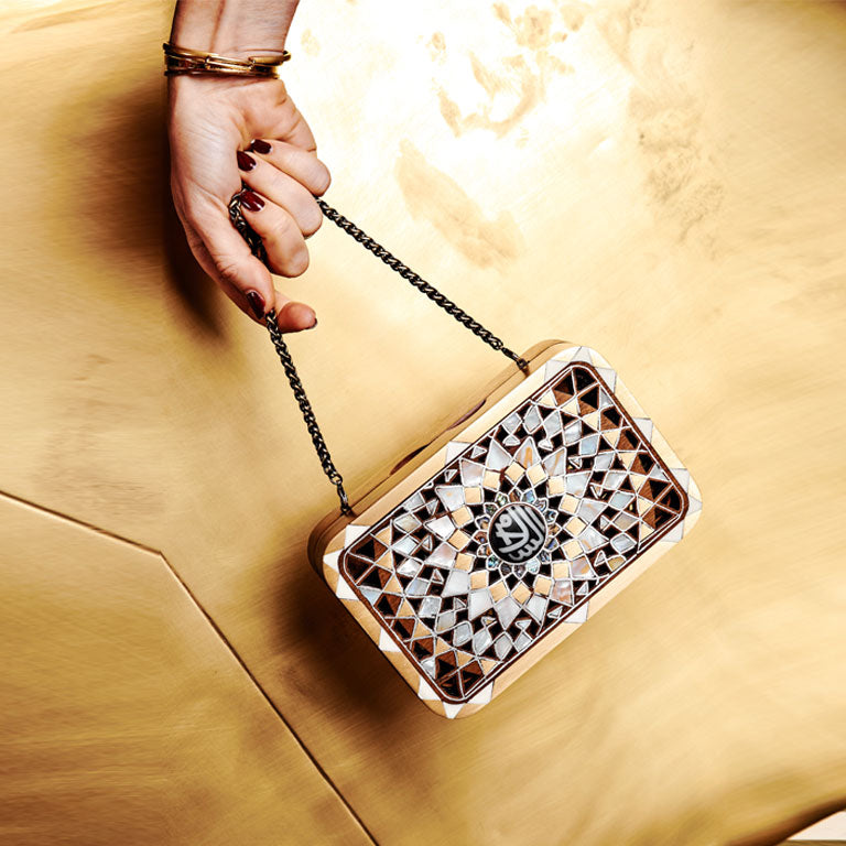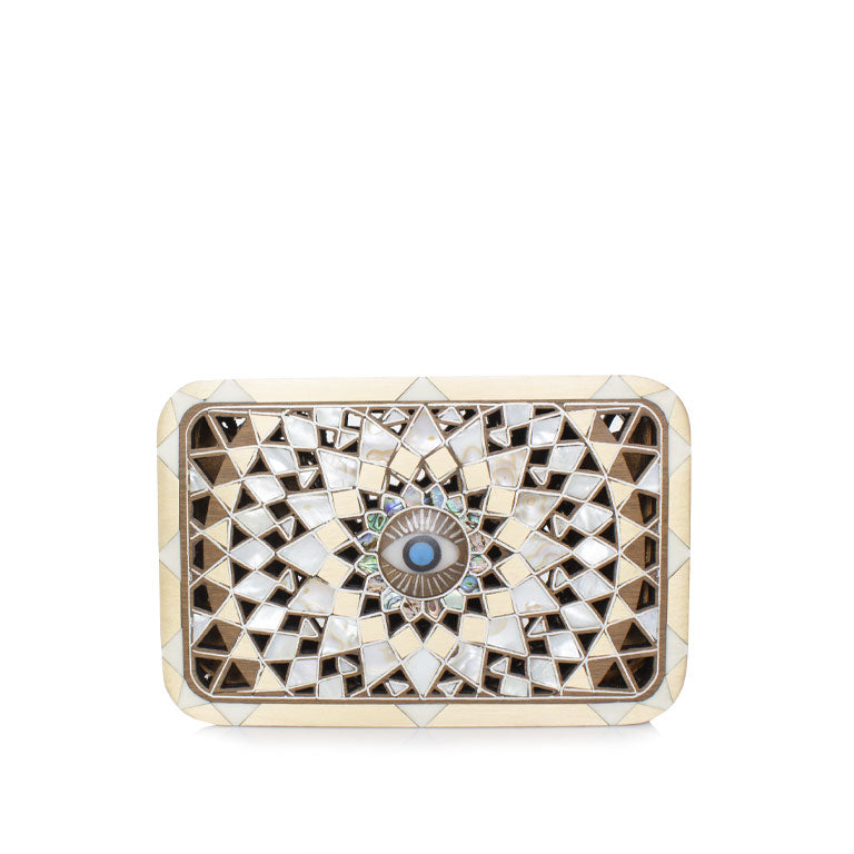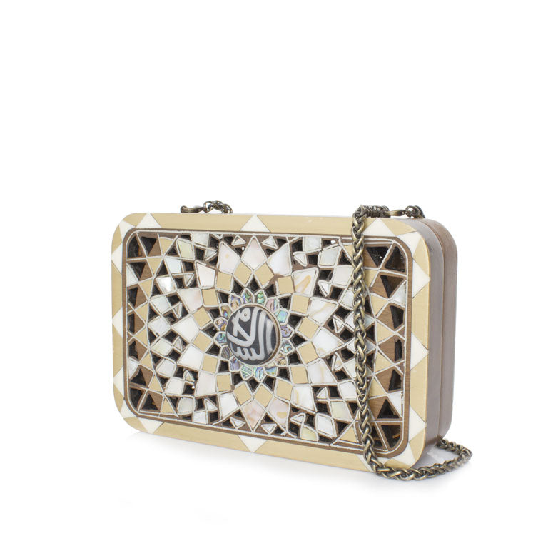 The Gold Mandala clutch, where Mandala intricacy converges with the traditional Levantine art of mother-of-pearl inlay on nude walnut wood. The color palette transitions seamlessly from pearlescent tones to to an evil eye center on one side and "Al Salam " center on the other side, designed for a hassle-free night out, features a stylish brass shoulder chain