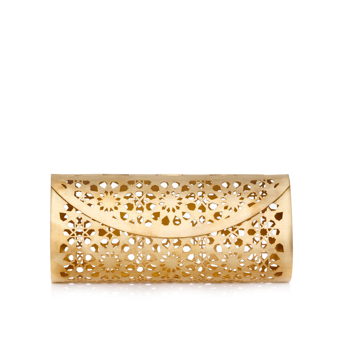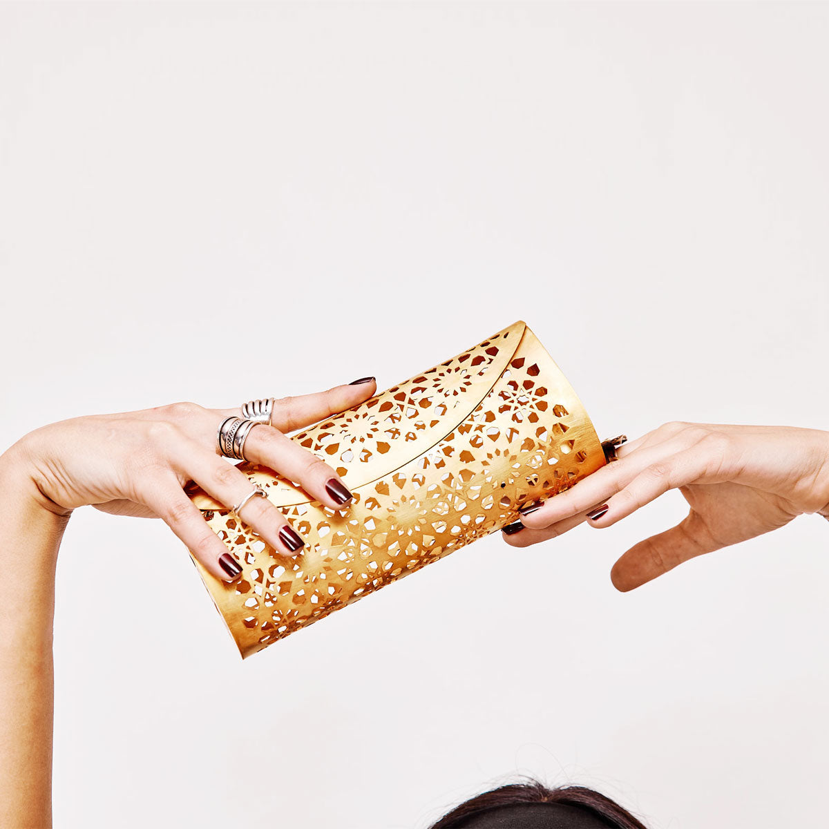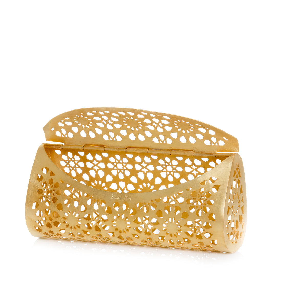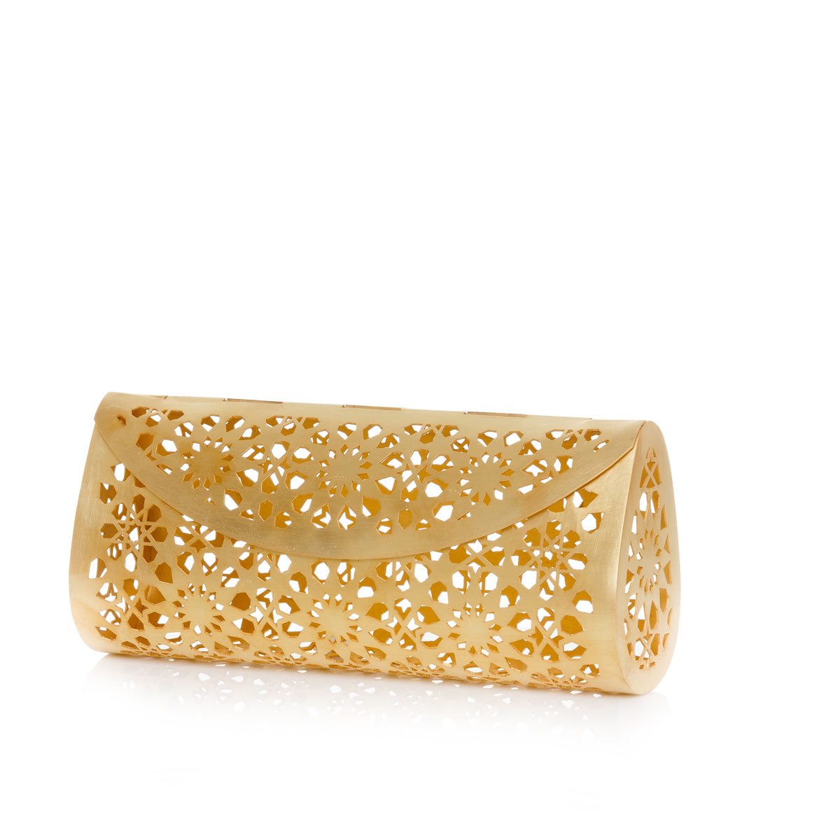 The Gold Moti minaudiere – a sleek and sophisticated accessory. Crafted from gold-toned brass with a delicate Arabesque cutout design, this elegant piece is the perfect addition to elevate any red carpet outfit.