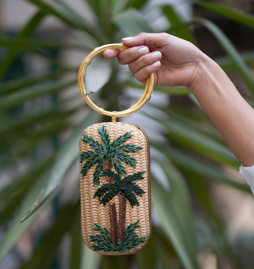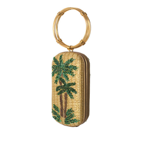 The Green Oasis on Straw Menottes embodies the essence of natural beauty and cultural significance. It showcases a handwoven gold straw base adorned with a vibrant palm tree motif, intricately hand-beaded with shimmering green glass beads symbolizing vitality, progress, and prosperity. This bag is elegantly finished with a twin pair of gold bracelet handles, adding a refined touch.