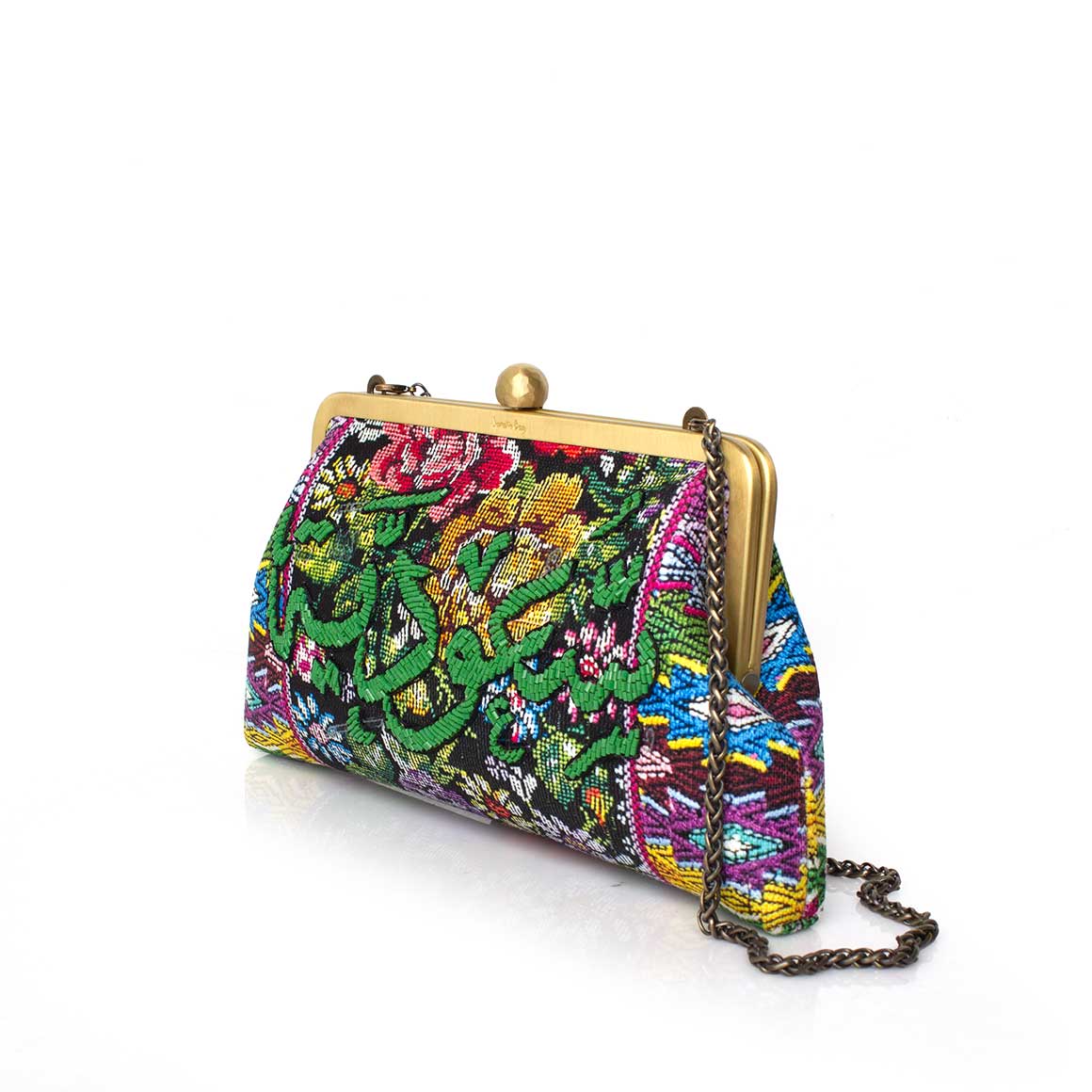 The Green Saoudiyah on Floral Classic Bag features intricate Arabic calligraphy hand-beaded over a richly detailed floral textile. As part of The KSA Capsule collection, the word "Saoudiyah" (سعودية) is boldly embroidered in green.This bag can be carried by hand or worn with a detachable chain for versatile styling.