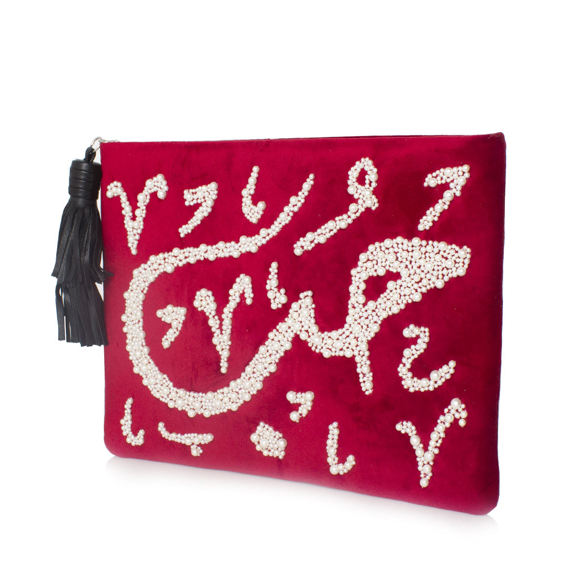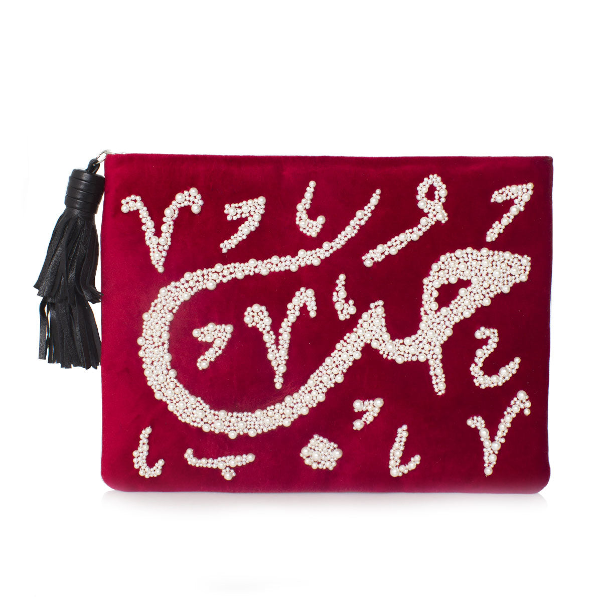 Embrace the sensual allure of red velvet. The Hobb Loulou Pouch inscribes the word “Love” in Arabic calligraphy “Hobb”, in a rich composition of hanbeaded pearls. This zippered pouch is finished with a leather tassel, making it an elegant statement piece for any chic event.