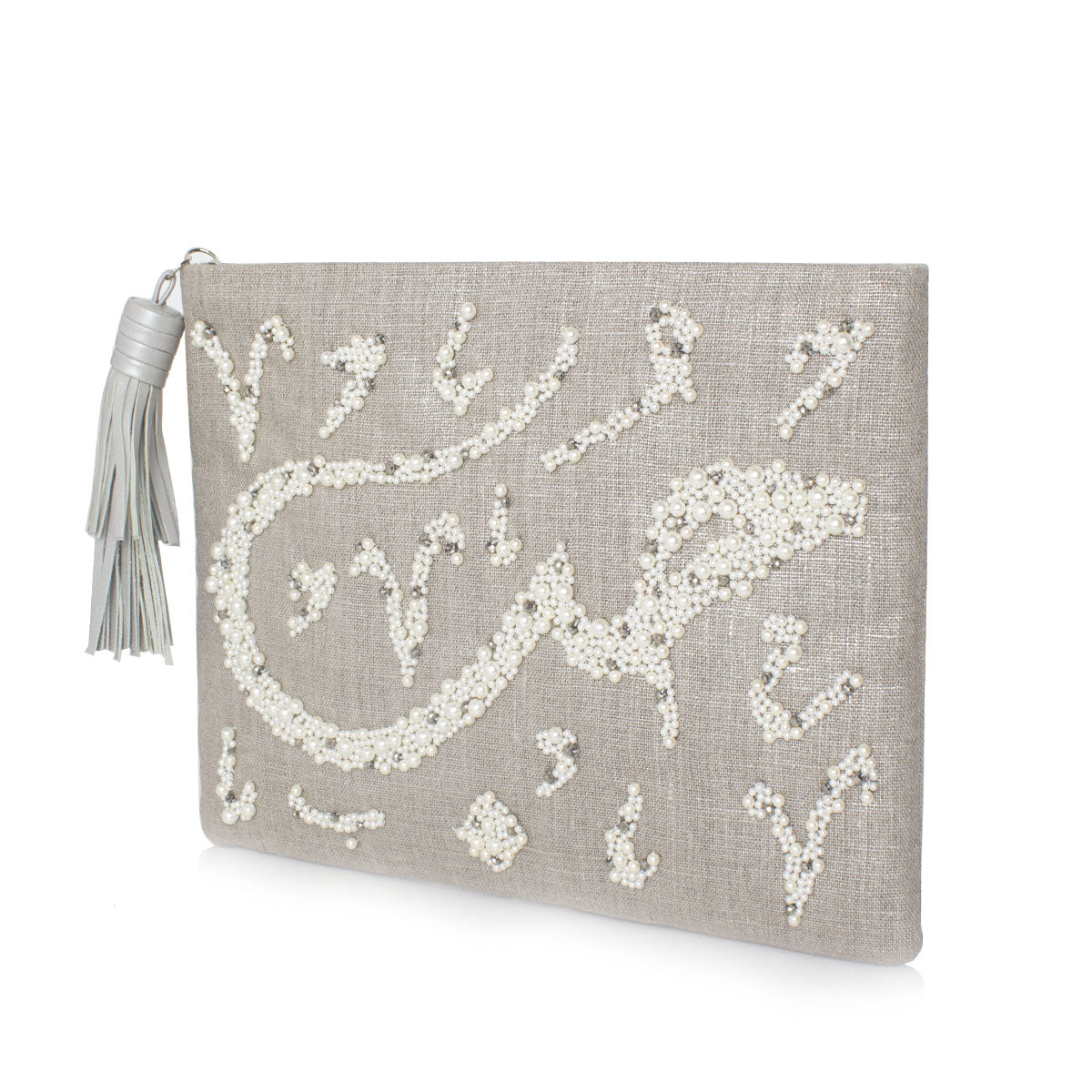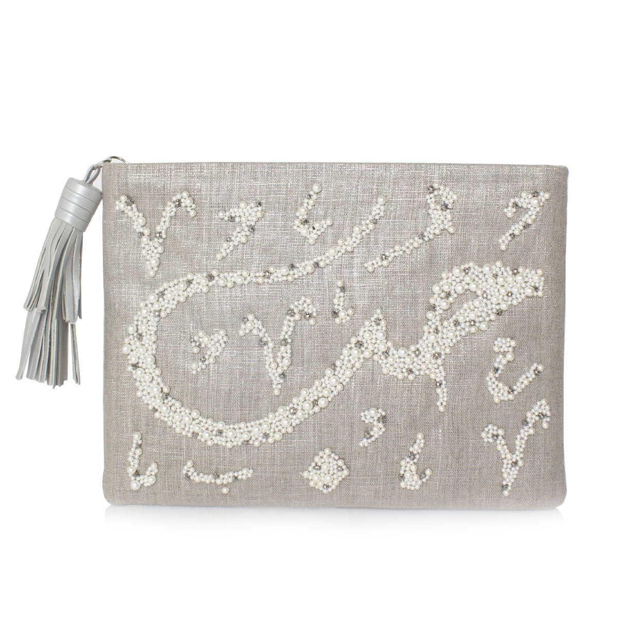 A new take on classic white pearls, this elegant pouch inscribes the word Love in Arabic calligraphy “Hobb” on a glitzy silver background. This zippered pouch contains a small inside pocket, and is finished with a silver leather tassle, making it the perfect companion for any chic event.