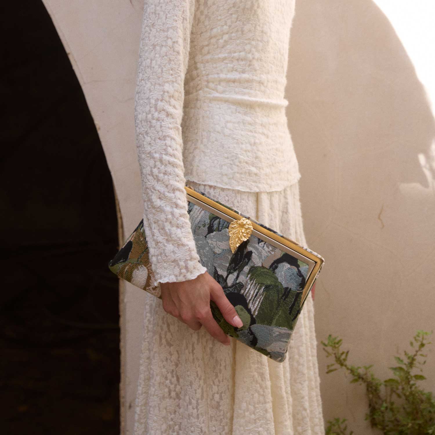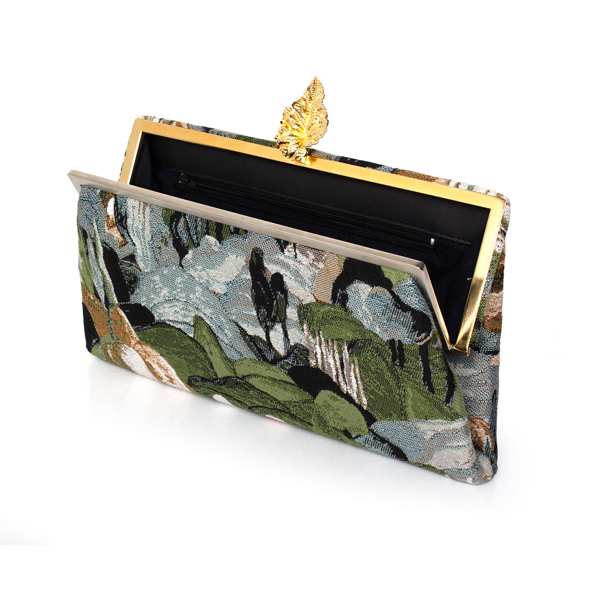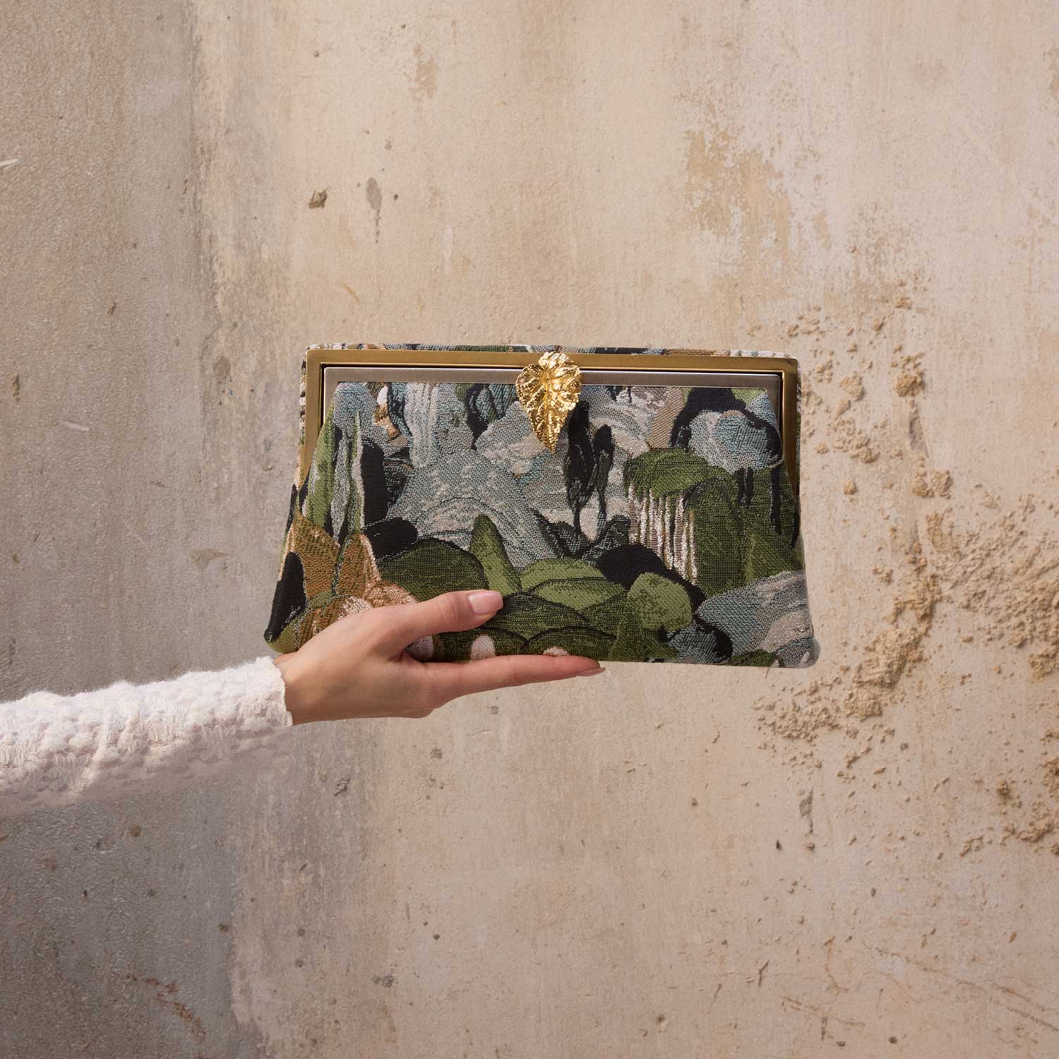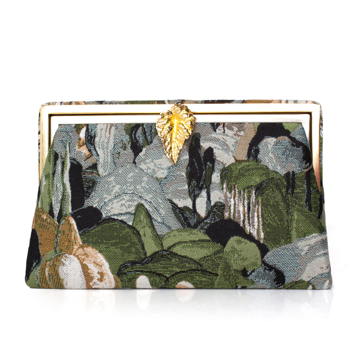 Designed within The Grounded Collection, the Leaf on Pine Forest Grace Clutch captures the tranquility of nature in tapestry form. Crafted from richly woven jacquard, it depicts a serene pine forest scene in earthy greens and muted blues. A sculptural gold leaf clasp crowns the design, symbolizing elegance and renewal. This clutch is perfect for carrying essentials and can be styled for both daytime sophistication and evening refinement.