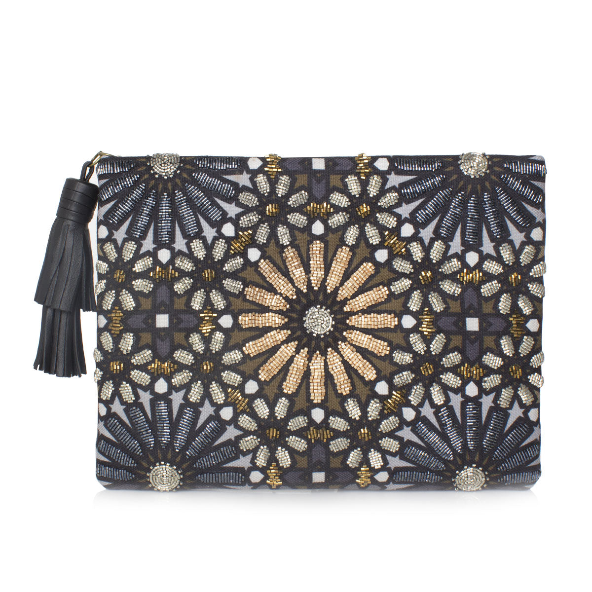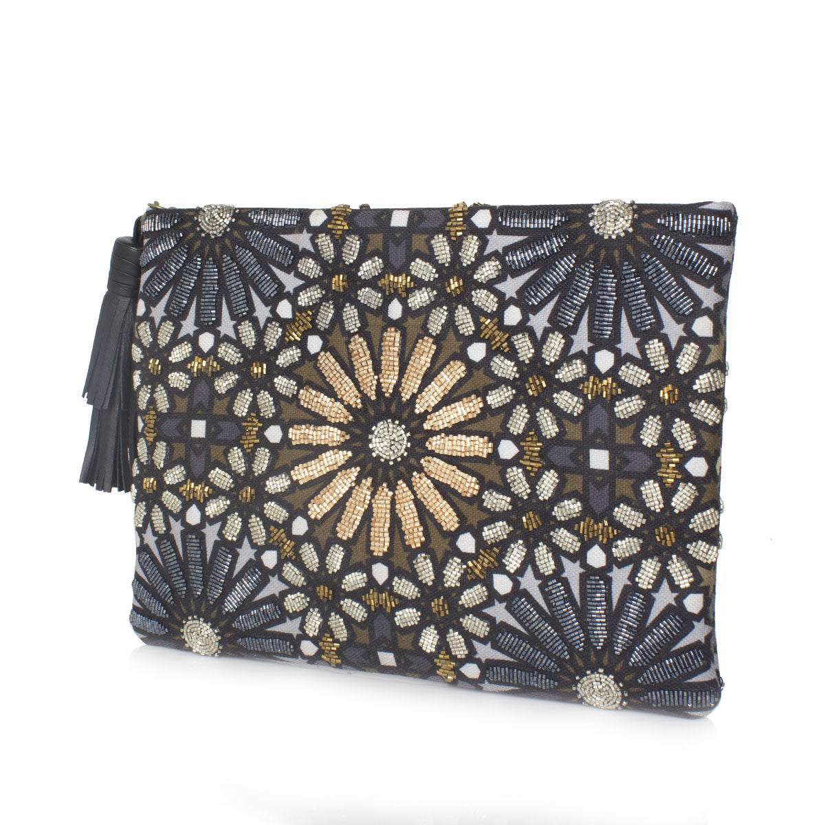 The Moroccan Metallic Pouch is a shimmering blend of luxury and heritage, inspired by the intricate art of Moroccan Zellij mosaic tilework. Meticulously hand-beaded with a glittering mix of silver, gold, and bronze glass beads, this statement piece features a versatile metallic palette that pairs effortlessly with gold, silver, or chic denim outfits. Perfect for day-to-evening elegance, this medium-sized clutch adds a flourishing finish to any look. The compact zippered pouch offers ample space for all your essentials, while a secure zip closure, finished with a large leather tassel, enhances its sophisticated charm.