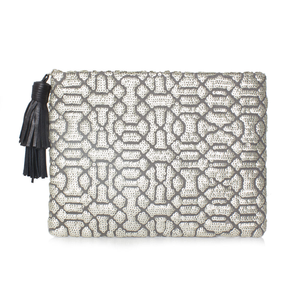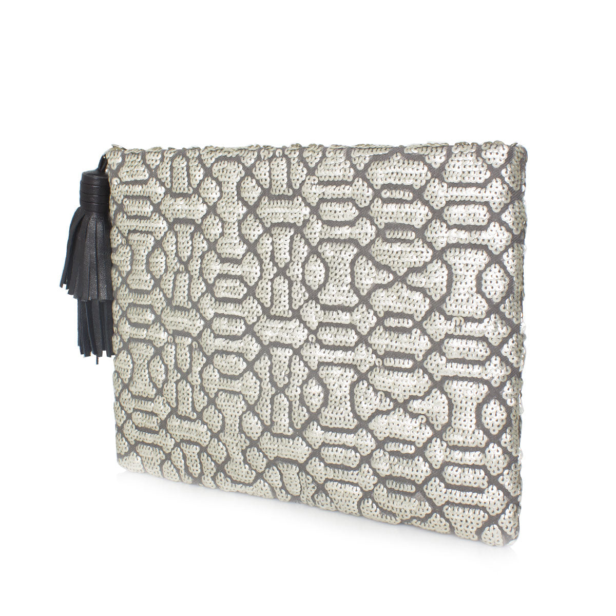 Your go-to metallic evening clutch, this molten silver bag inspired by the opulence of the Ottoman era. It features a modern twist on an Arabesque pattern rendered with a special technique of meticulously stacking sequins to give a rich, embossed effect.