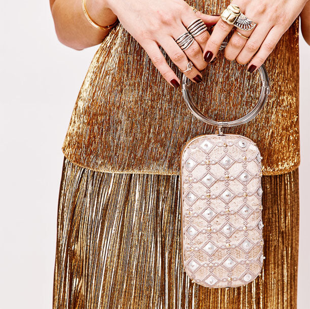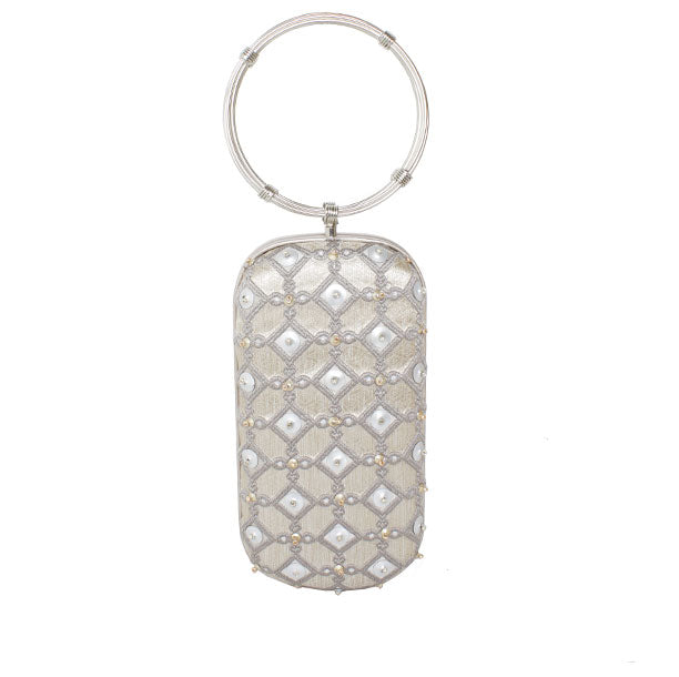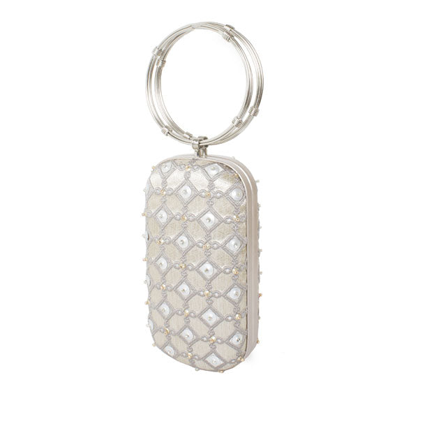 The Shield Menottes — With its elegant oval shape, this evening bag exudes timeless charm that transcends all eras. Highlighting a twin pair of silver bracelet handles, it opens and closes on the side with an internal magnetic fastening system for added convenience. Redefine your style with this enduring and sophisticated accessory.