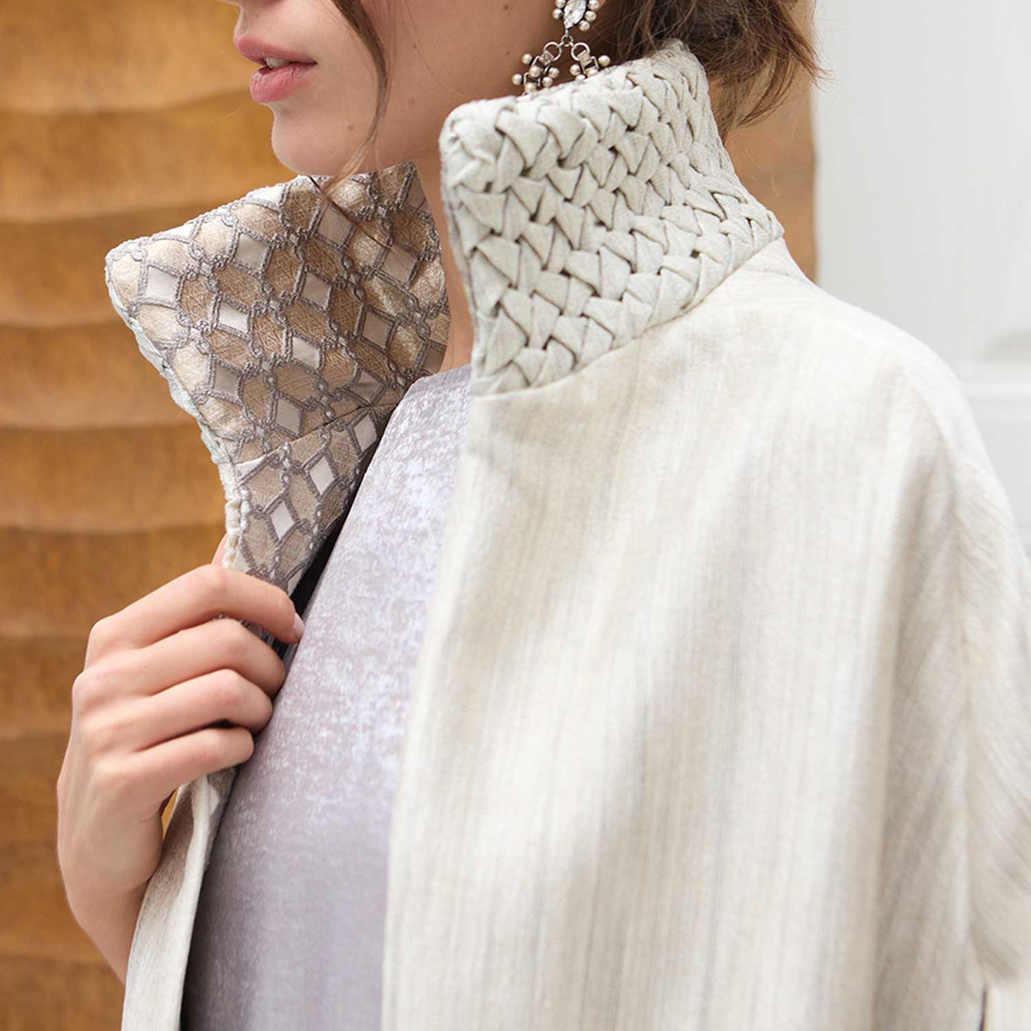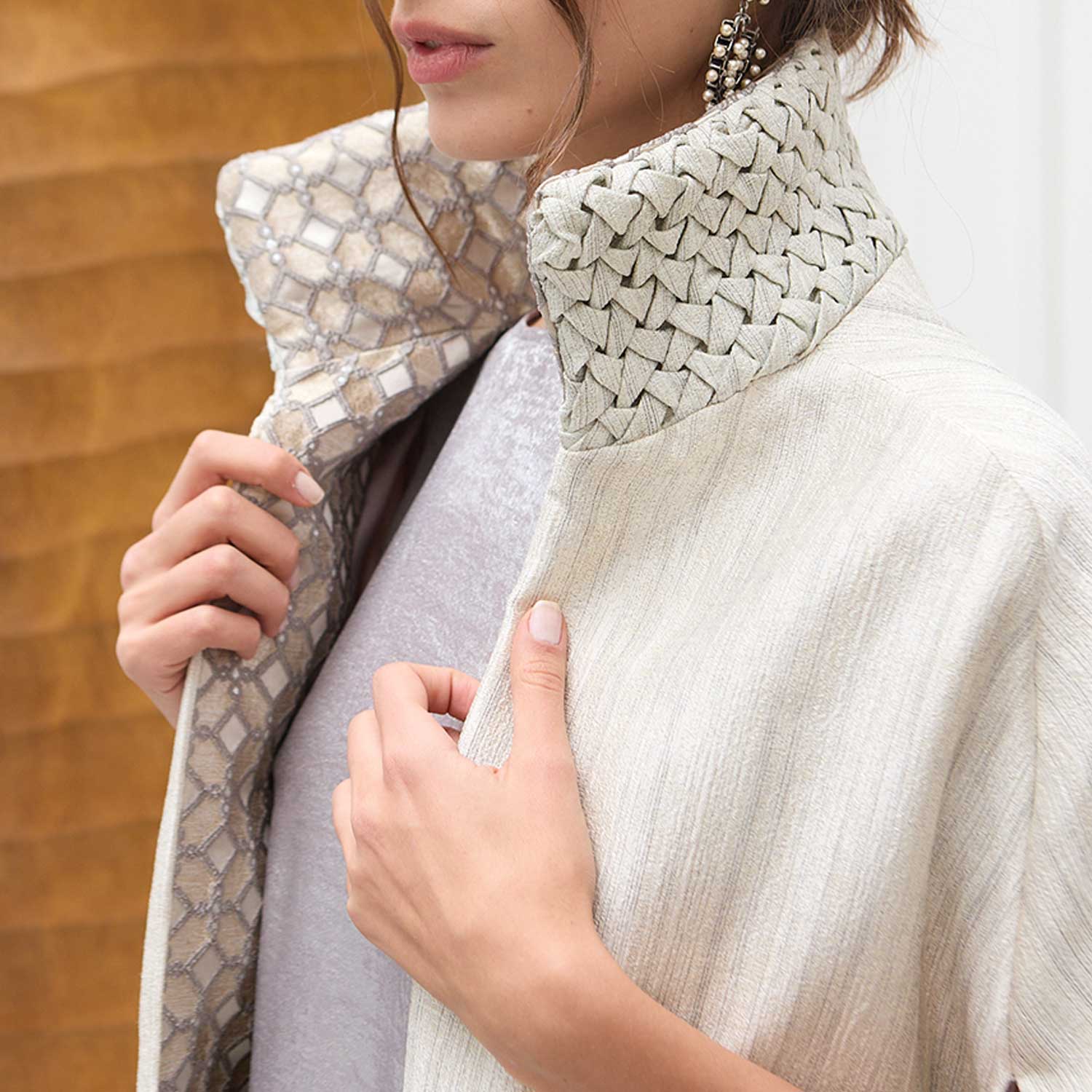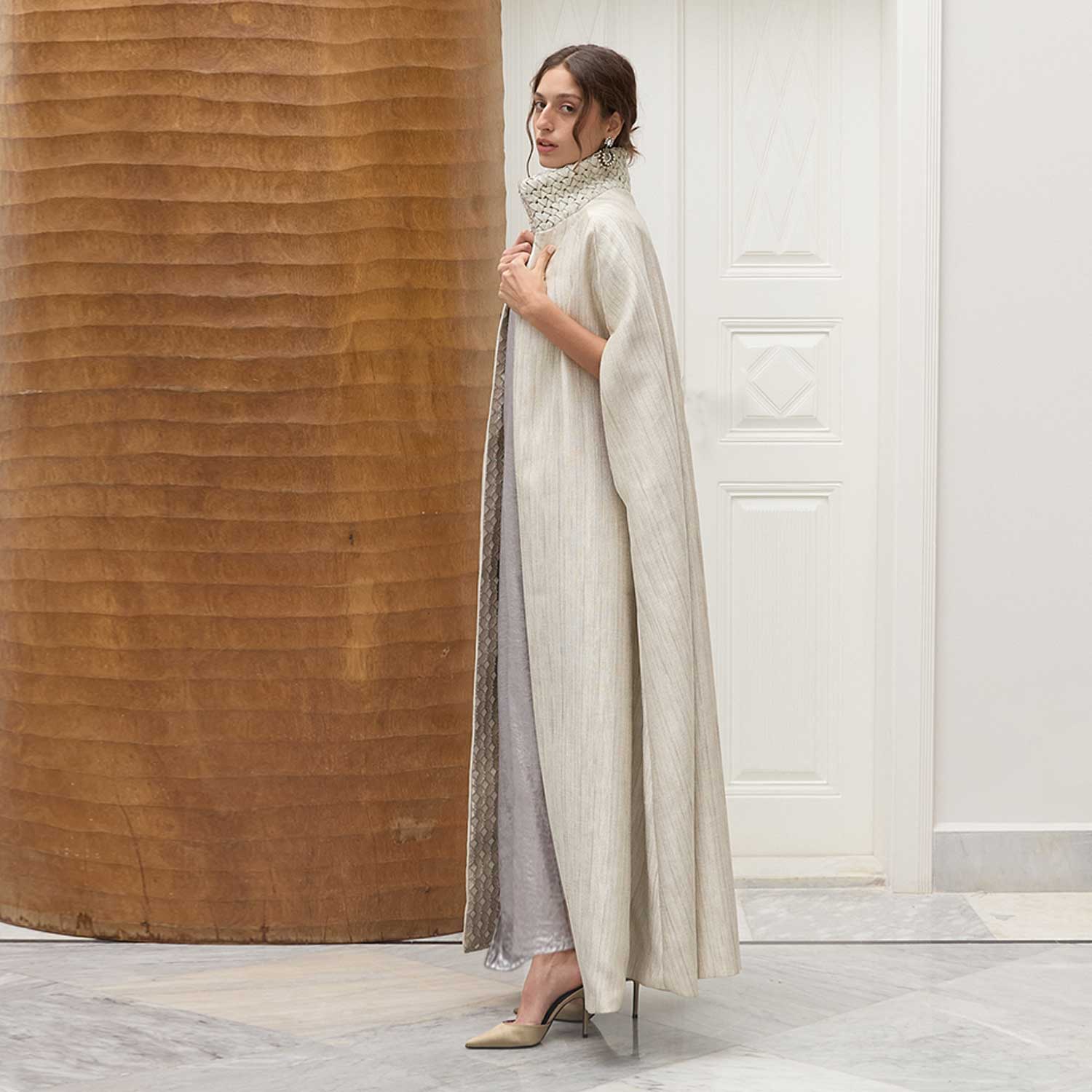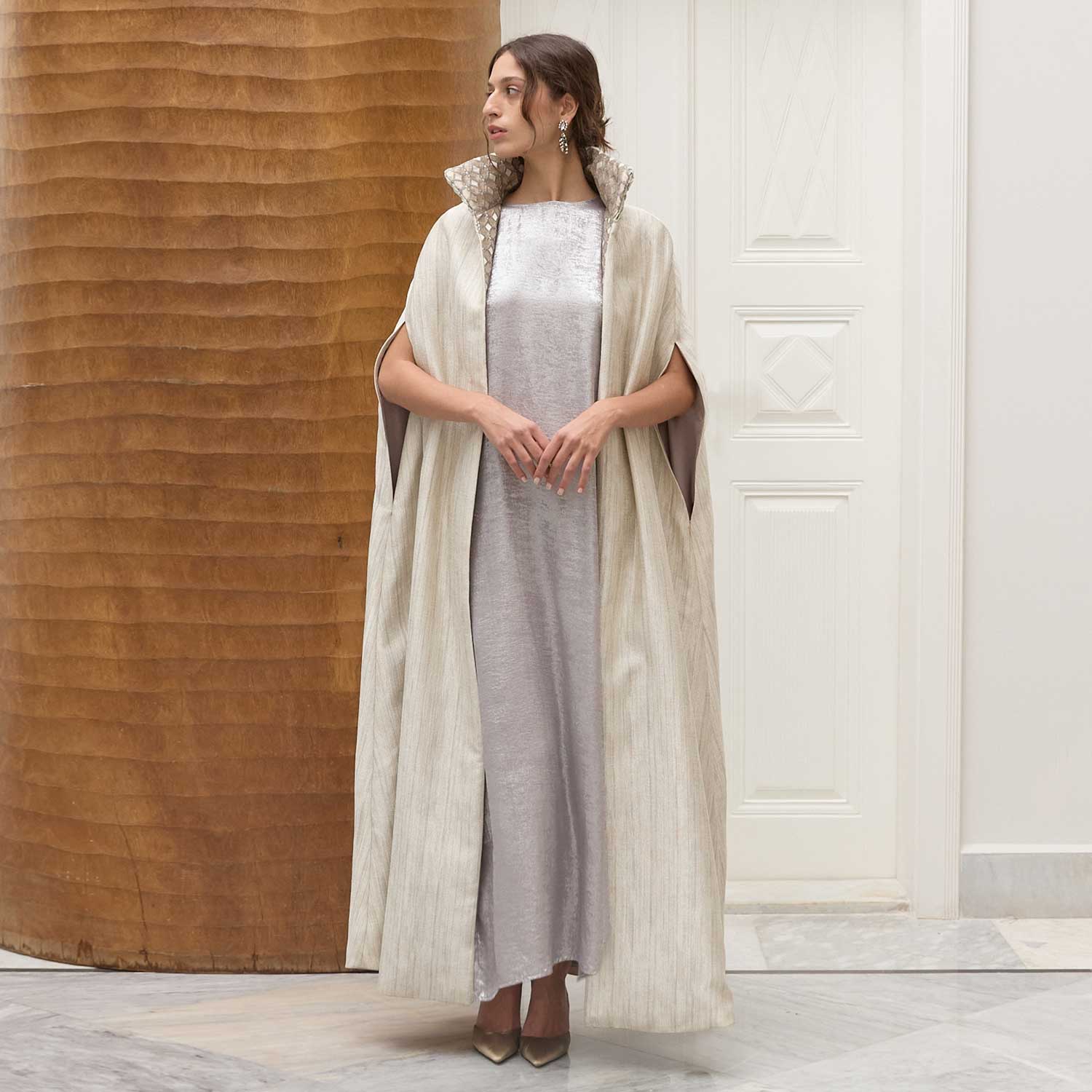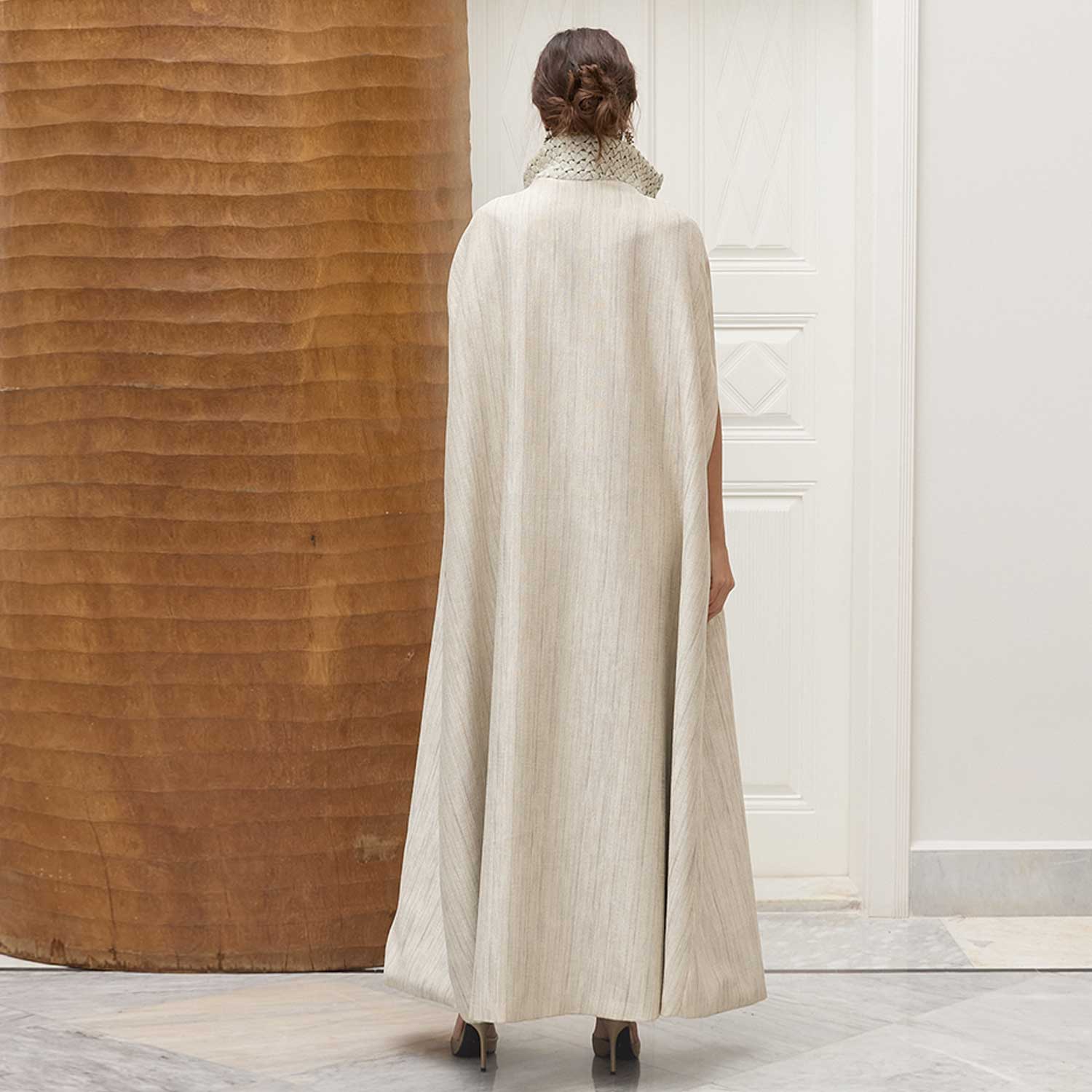 Smocking Sugar Imperial Cape is defined by its sculptural neckline and refined craftsmanship. The outer neck is detailed with hand-smocking that creates a raised, tactile surface, adding depth and character to the design. Inside, the neckline is finished with a patterned fabric that offers visual interest and a subtle play of texture when revealed. The long, fluid cut allows the cape to fall naturally over the body, making it an elegant layering piece for evening and occasion dressing.
