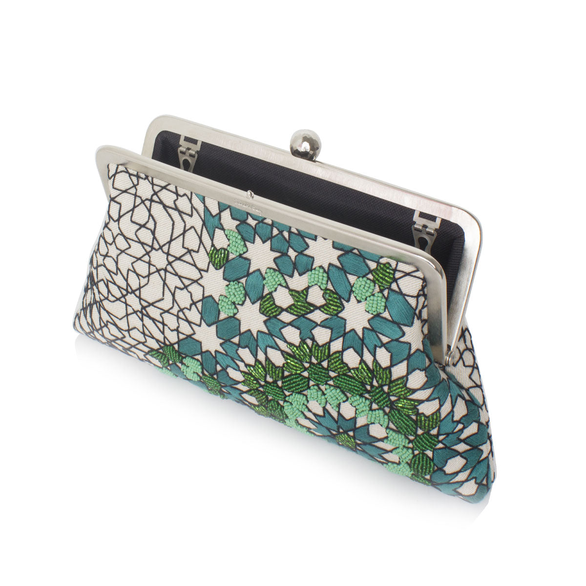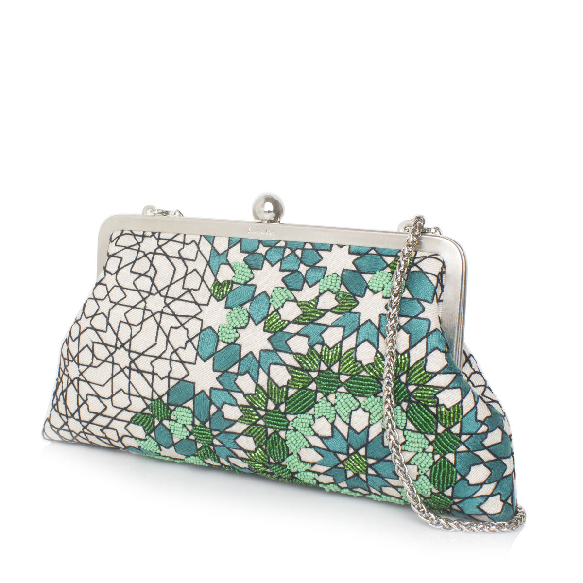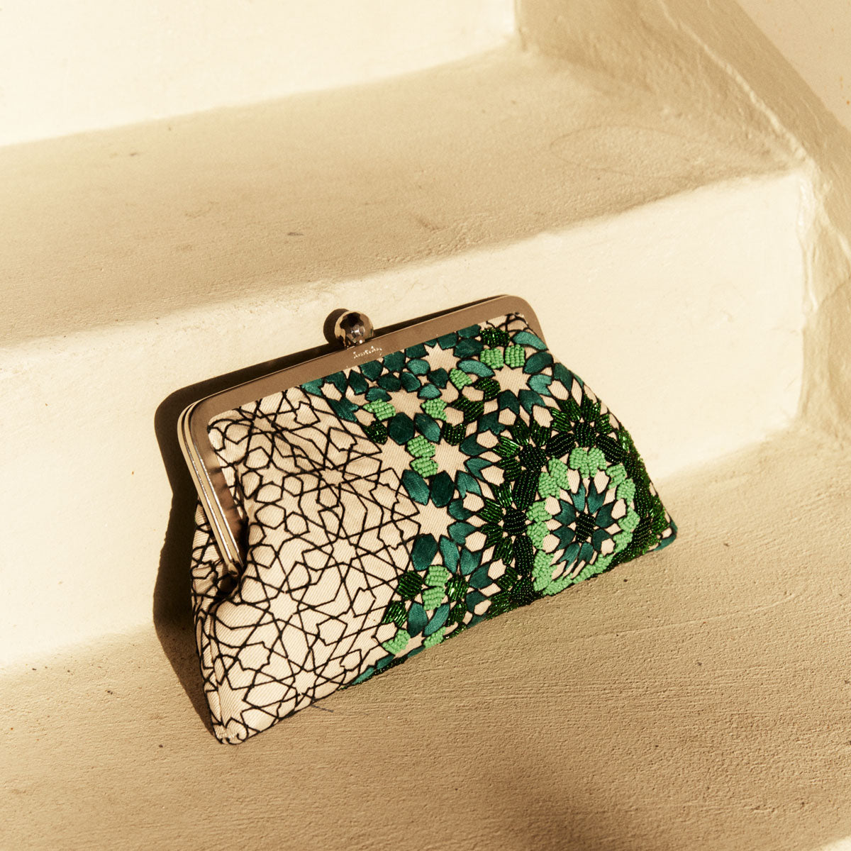 Introducing the Classic Emerald Bag, featuring a traditional oriental pattern, and meticulously hand-beaded in rich emerald green hues adding elegance and beauty to the design. The bag comes with a chain, so it can be slung over the shoulder for a hands-free outing, guaranteeing its elegance can accompany you on any occasion.