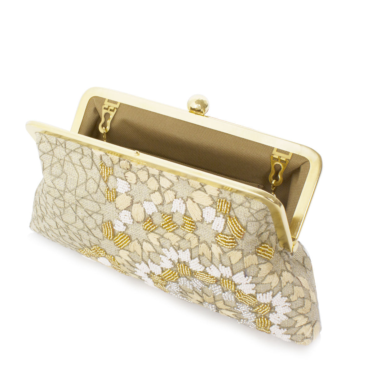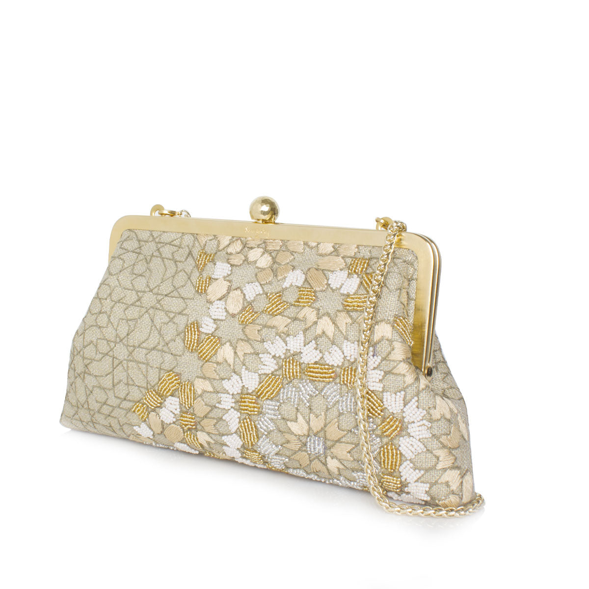 The Arabesque Gold Classic represents timeless design and precise craftsmanship, expertly combining different techniques for an excellent finish. The surface is adorned with a traditional oriental pattern that has been carefully hand-embellished with beads and thread. This combination of techniques creates an elevated accessory and the included chain enables for clutch or shoulder design.