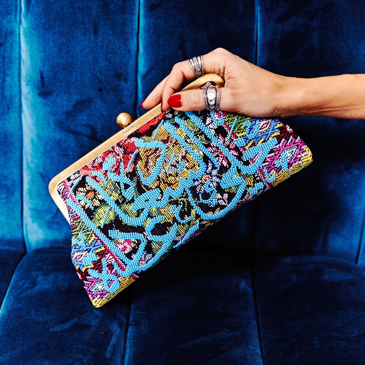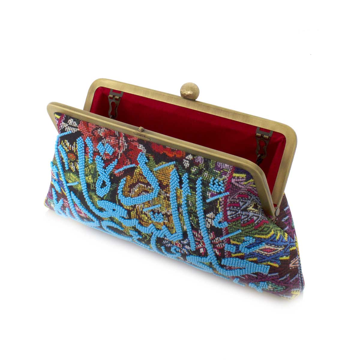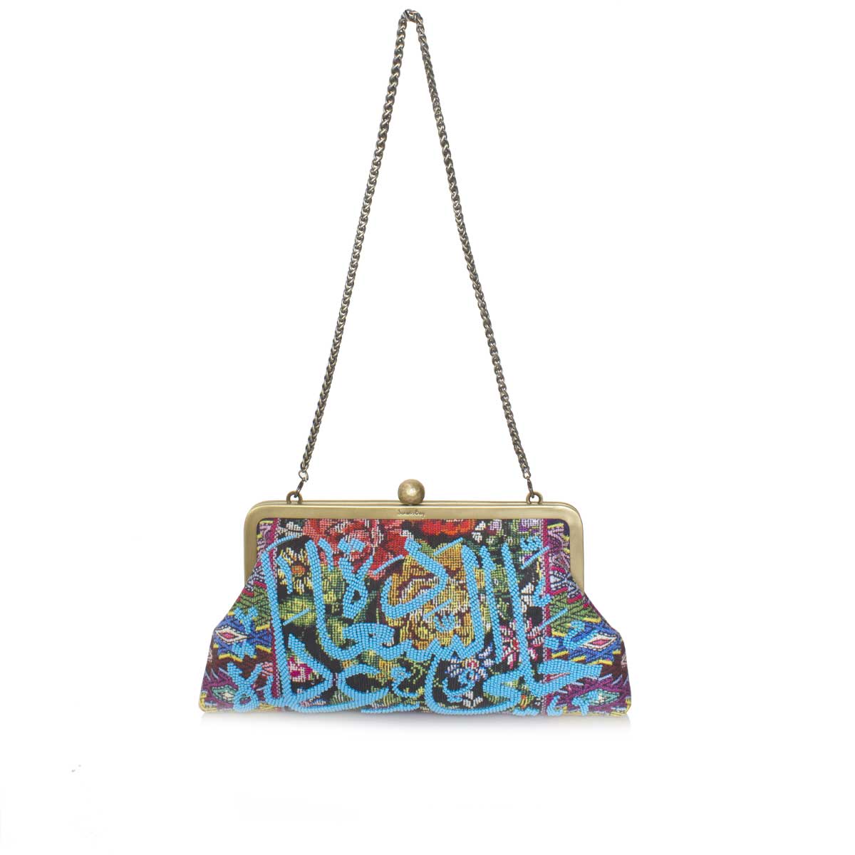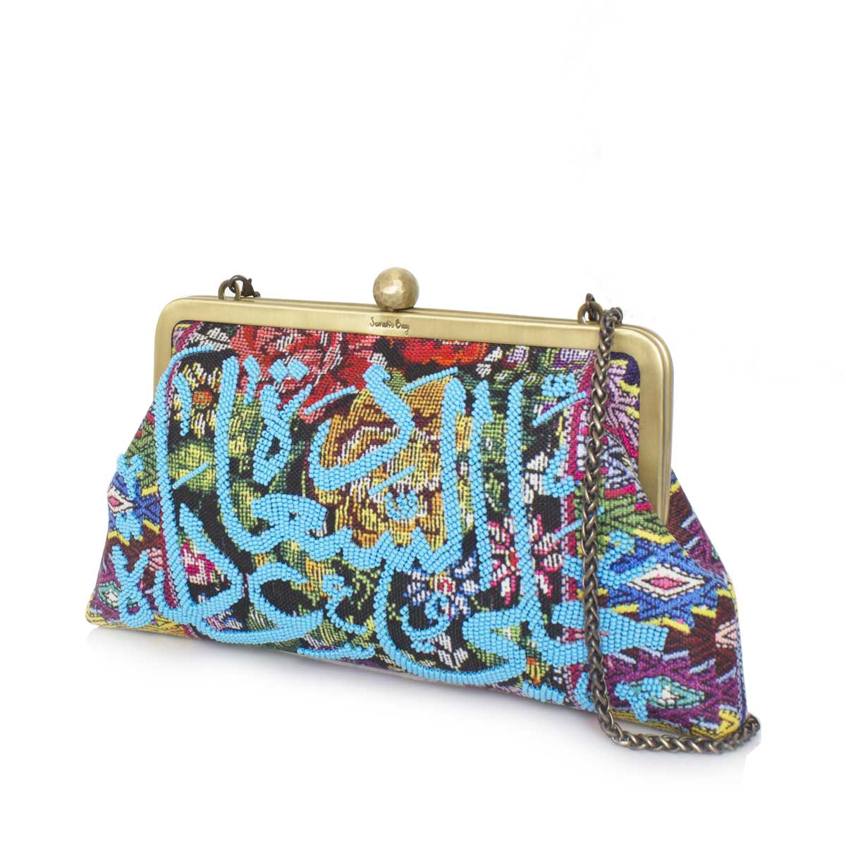 Introducing The hapiness blue on mexican floral Classic bag, a breathtaking testament to joy. At its heart lies a profound quote: “Make happiness a habit” In Arabic calligraphy. Delicately hand-beaded with eye-catching blue glass beads, it embodies the power within us to cultivate happiness. The clutch is crafted with flowery canvas base, symbolizing the beauty that blooms from a mindset of positivity. With a versatile chain strap, it offers both elegance and practicality, empowering you to carry happiness wherever your journey takes you.