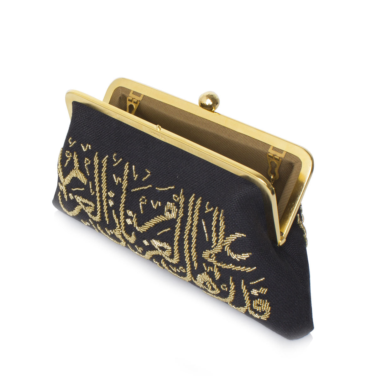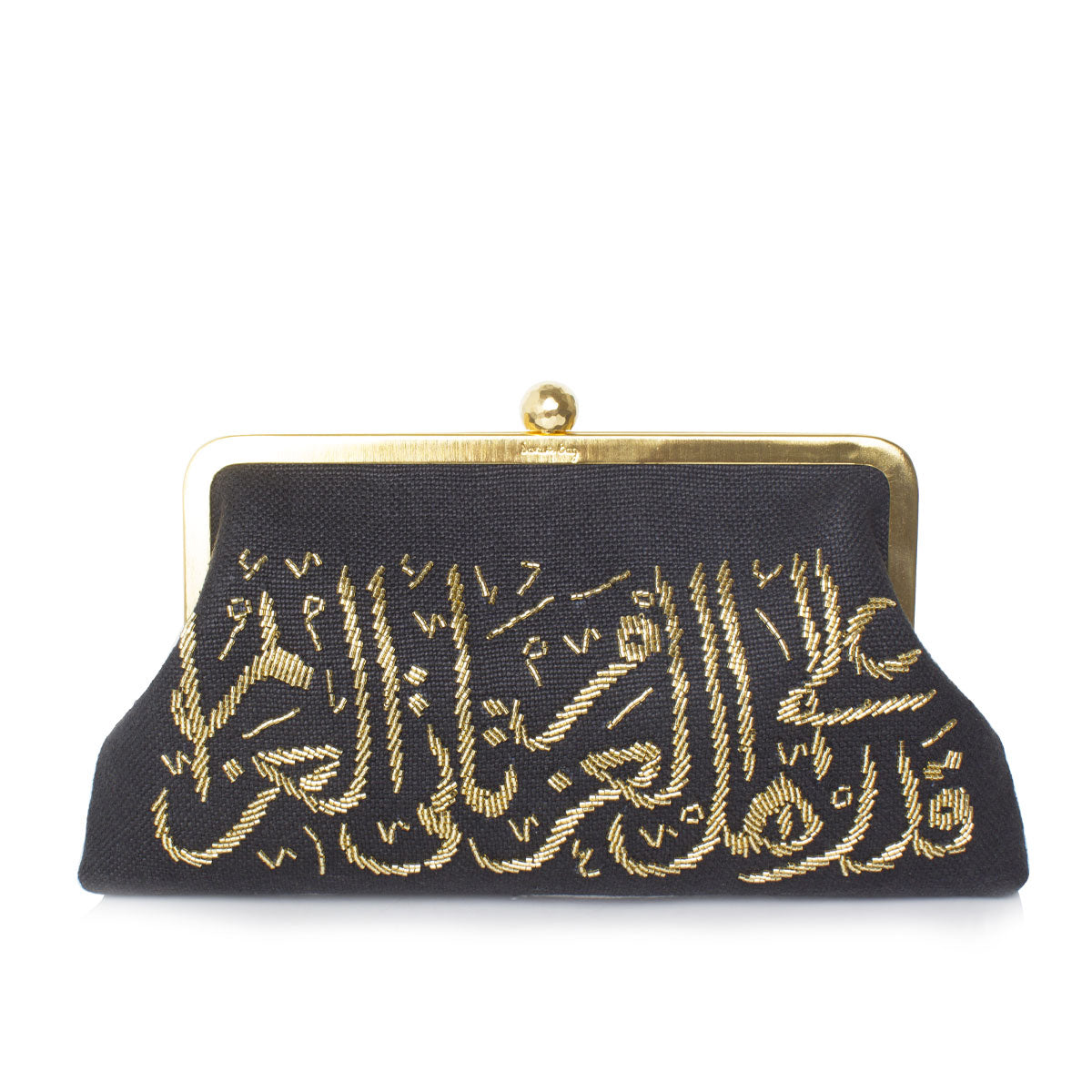Unveil the Calligraphy Gold on Black Classic, a Sarah’s bag evening classic featuring the profound words of Arabic poet Al Mutanabbi, "Life’s invitations come to those with determination," delicately rendered in graphic Arabic calligraphy and meticulously hand-beaded with golden glass beads. This clutch transcends mere accessory status, serving as a bold declaration of unwavering resolve. With a versatile chain included, offering versatility and adaptability.