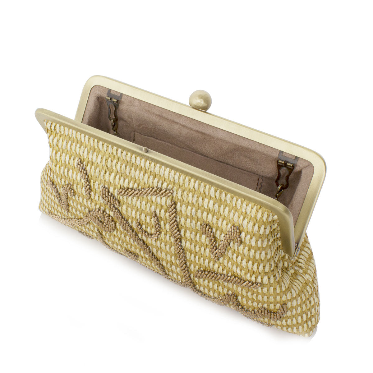 The Salam Gold Classic, “Peace” in Arabic. Peace rendered in flowing Arabic calligraphy that is meticulously hand-beaded in gold glass beads. A chain is included, allowing the clutch to be carried as a shoulder bag when needed. Its refined design offers versatile carrying options – hold it as a clutch or drape it over the shoulder with the provided chain.
