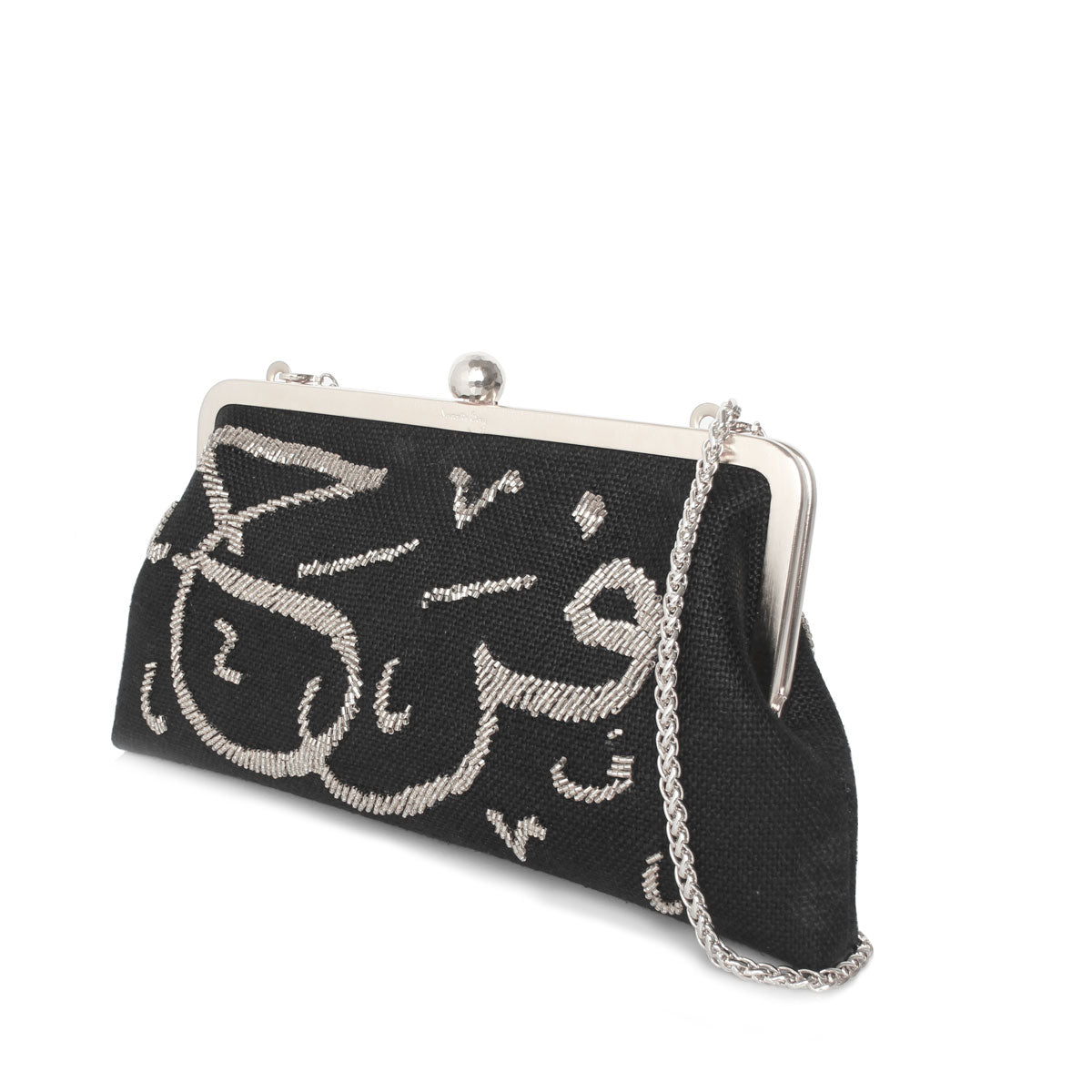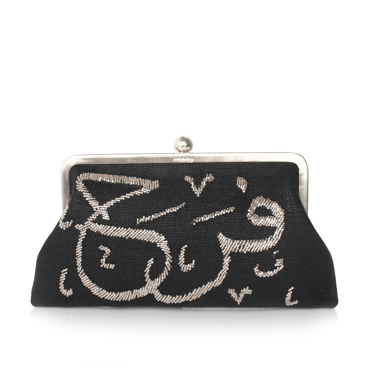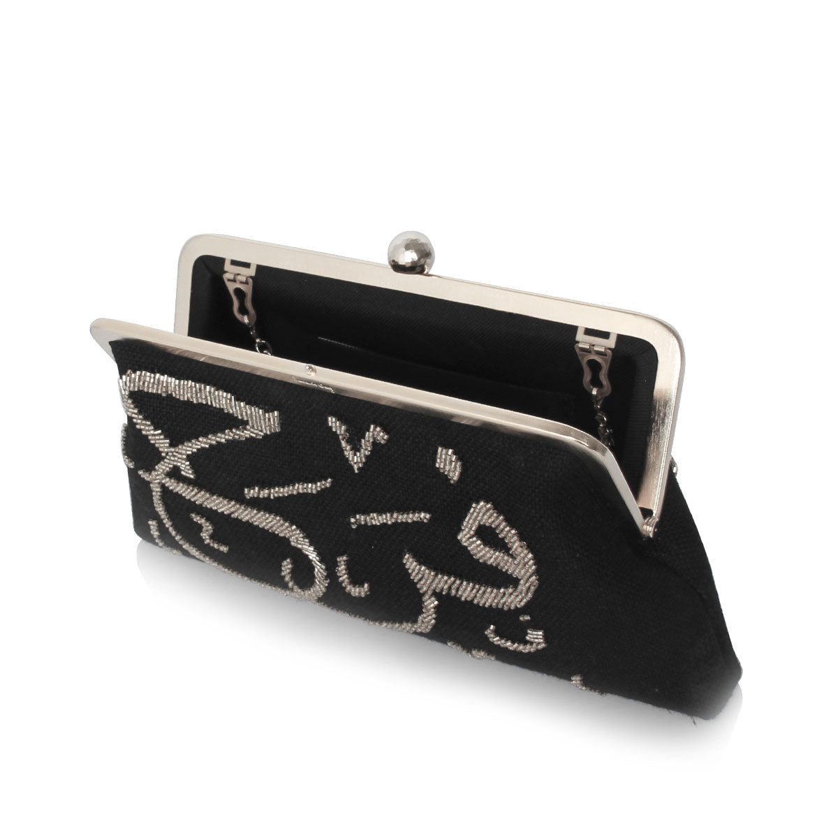 Surprise her with a customized bag adorned with her name in Delicate Arabic calligraphy using hand-embroidered elegant silver glass beads on a black background.