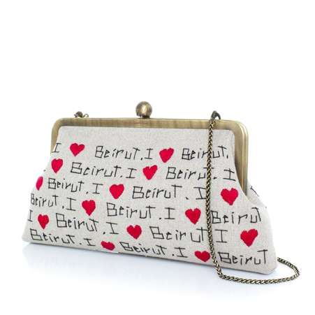 A message of love to our city, Beirut. This clutch is intricately hand-stitched with cotton thread on both sides. The beige canvas makes it an ideal “passe-partout bag” that goes easily with any outfit. It is the perfect gift for any friend that is missing home. These medium-sized classic bags can be held as a clutch or slung on the shoulder using the detachable chain provided.