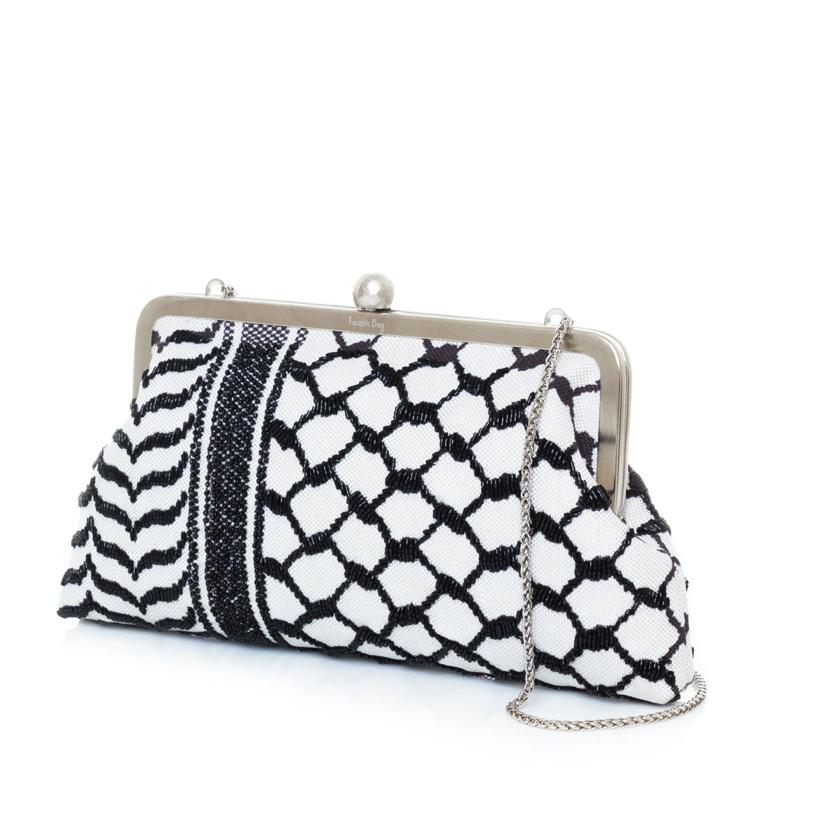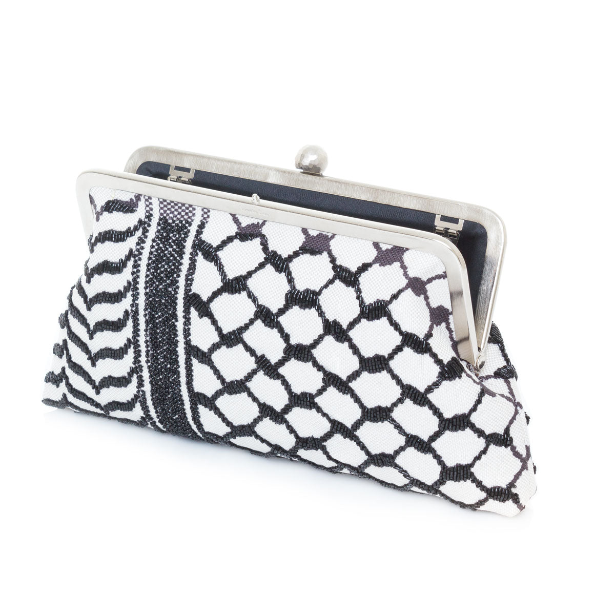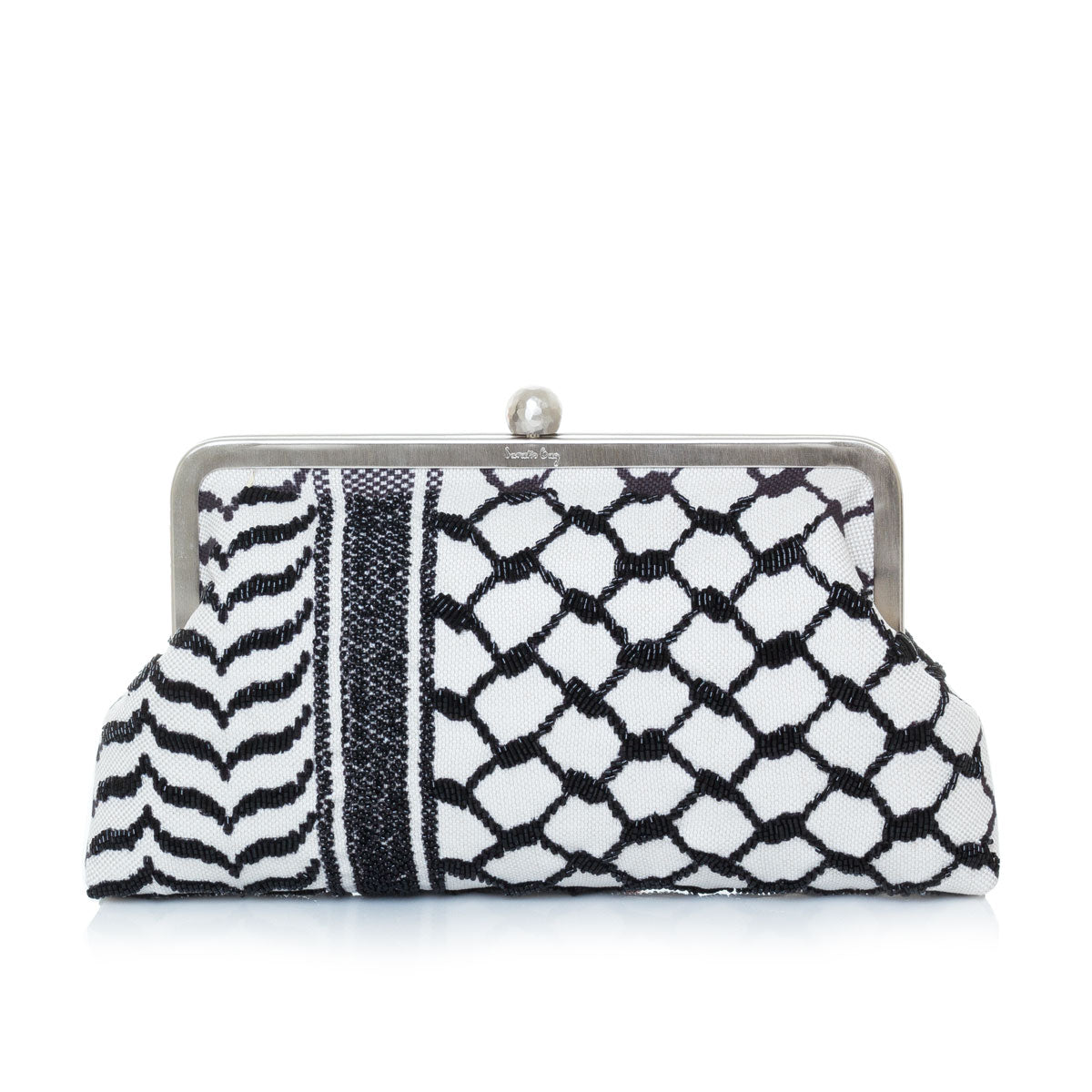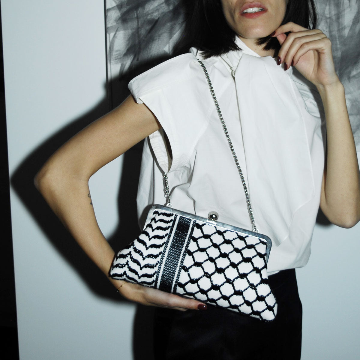 The Keffiyeh Black Classic inspired by the traditional Keffiyeh, symbolizing freedom, heritage and resilience. This bag is carefully hand-embellished with glass beads. Whether carried as handbag or drape it over shoulder, it is a tribute to courage and determination.