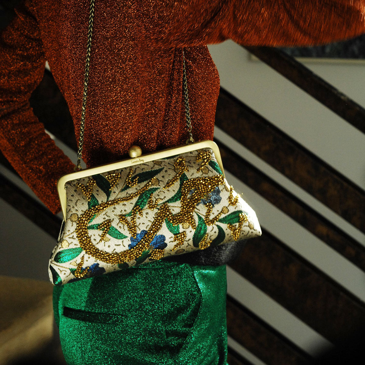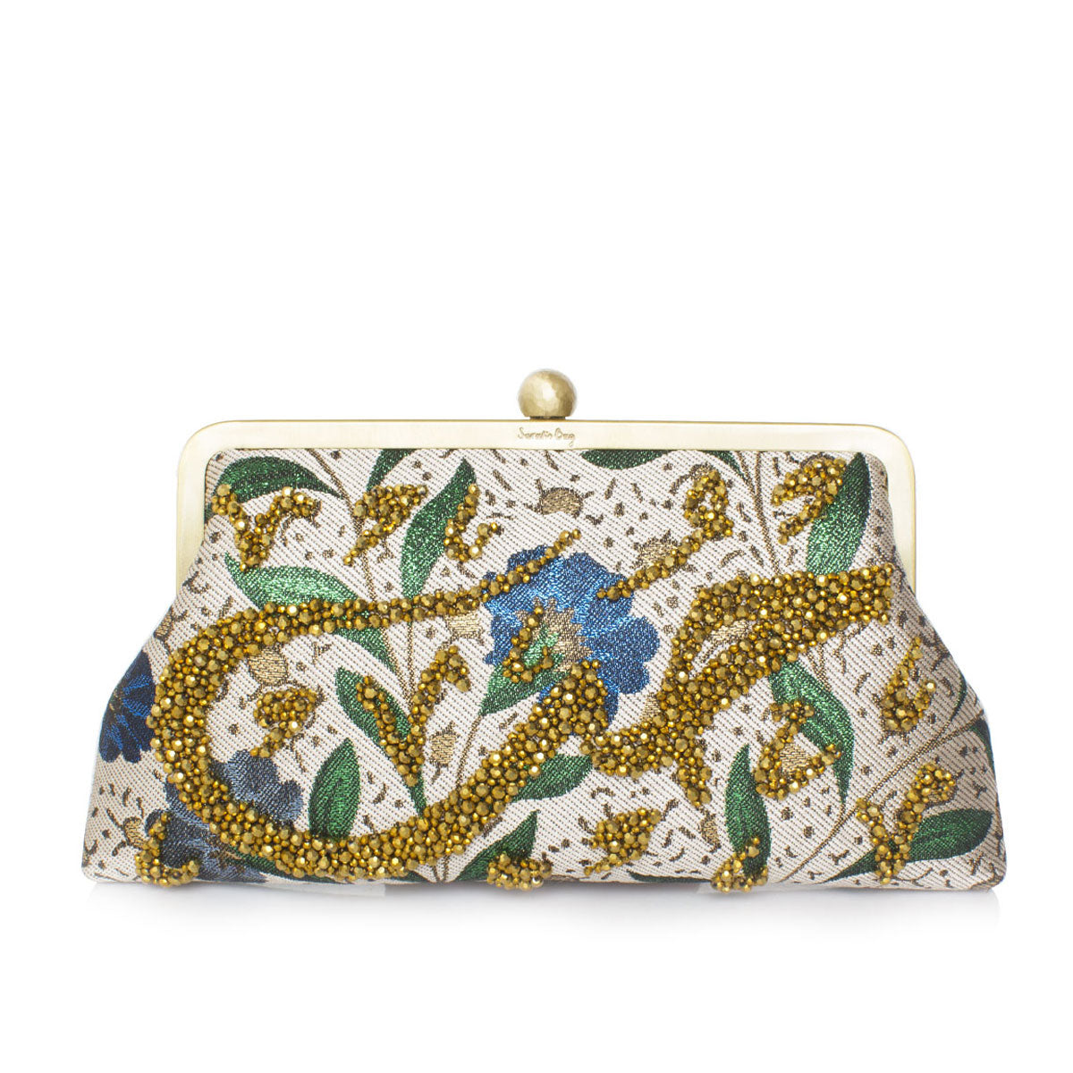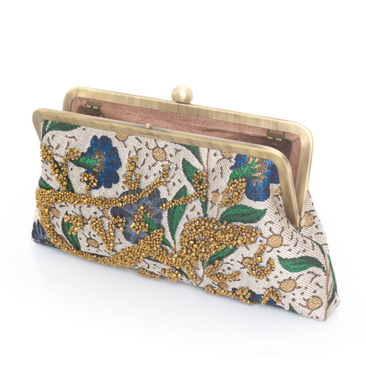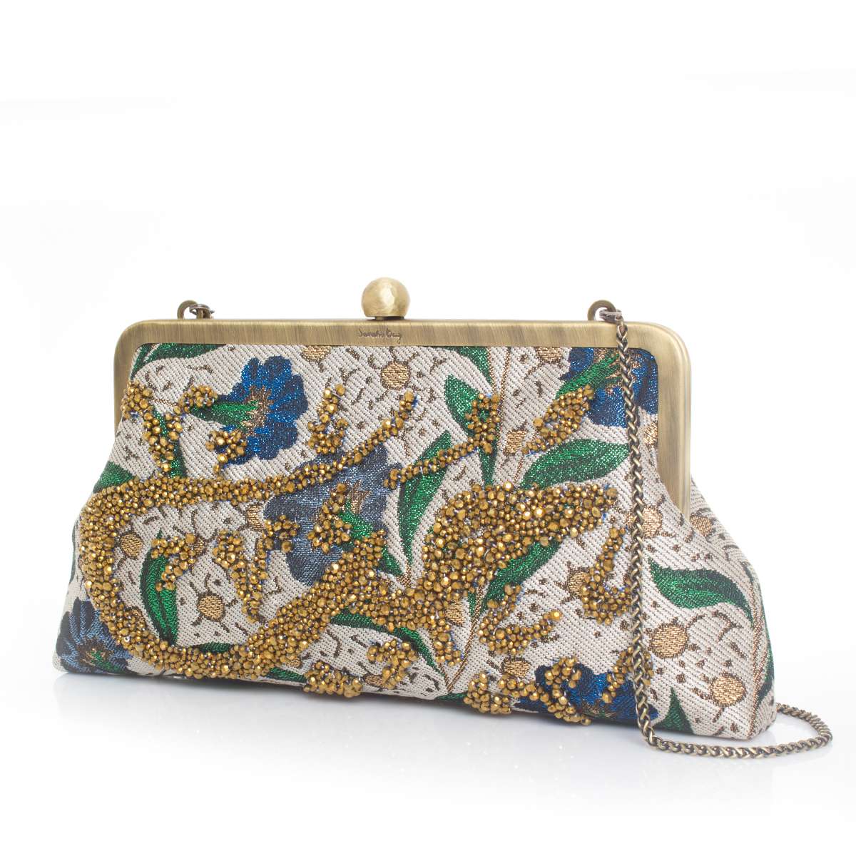 The Lys Hobb Classic showcases the Arabic calligraphy term "Hobb," translating to "love." Delicate glass beads, expertly handcrafted by our talented artisans, embellish the woven fabric adorned with Lys flowers, symbolizing purity and nobility in rich hues of blues and greens. This classic clutch represents not only elegance but also a profound emotional resonance, embodying the concepts of love and purity. Carry it as a clutch or sling it over your shoulder with the included chain.