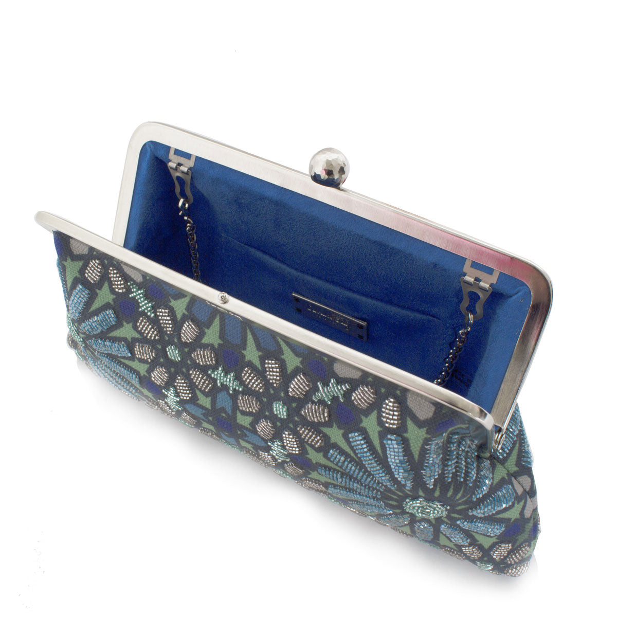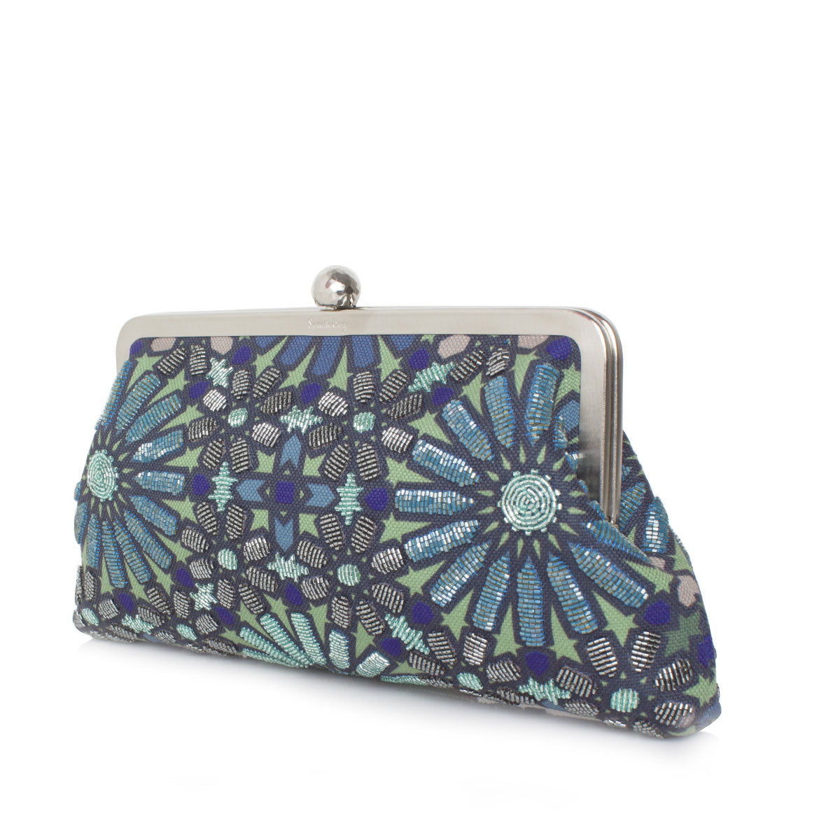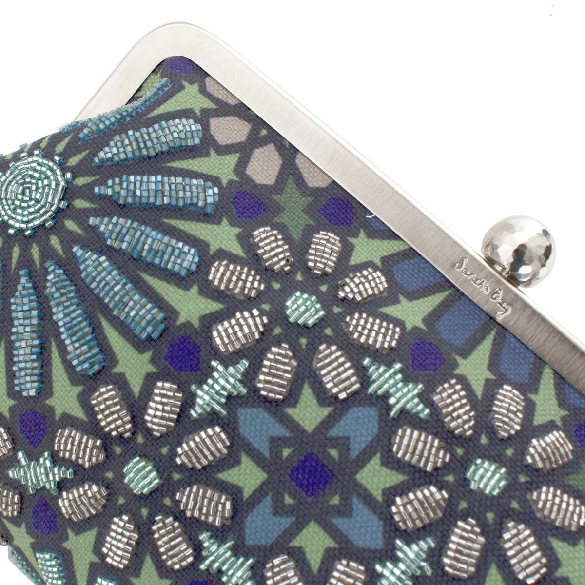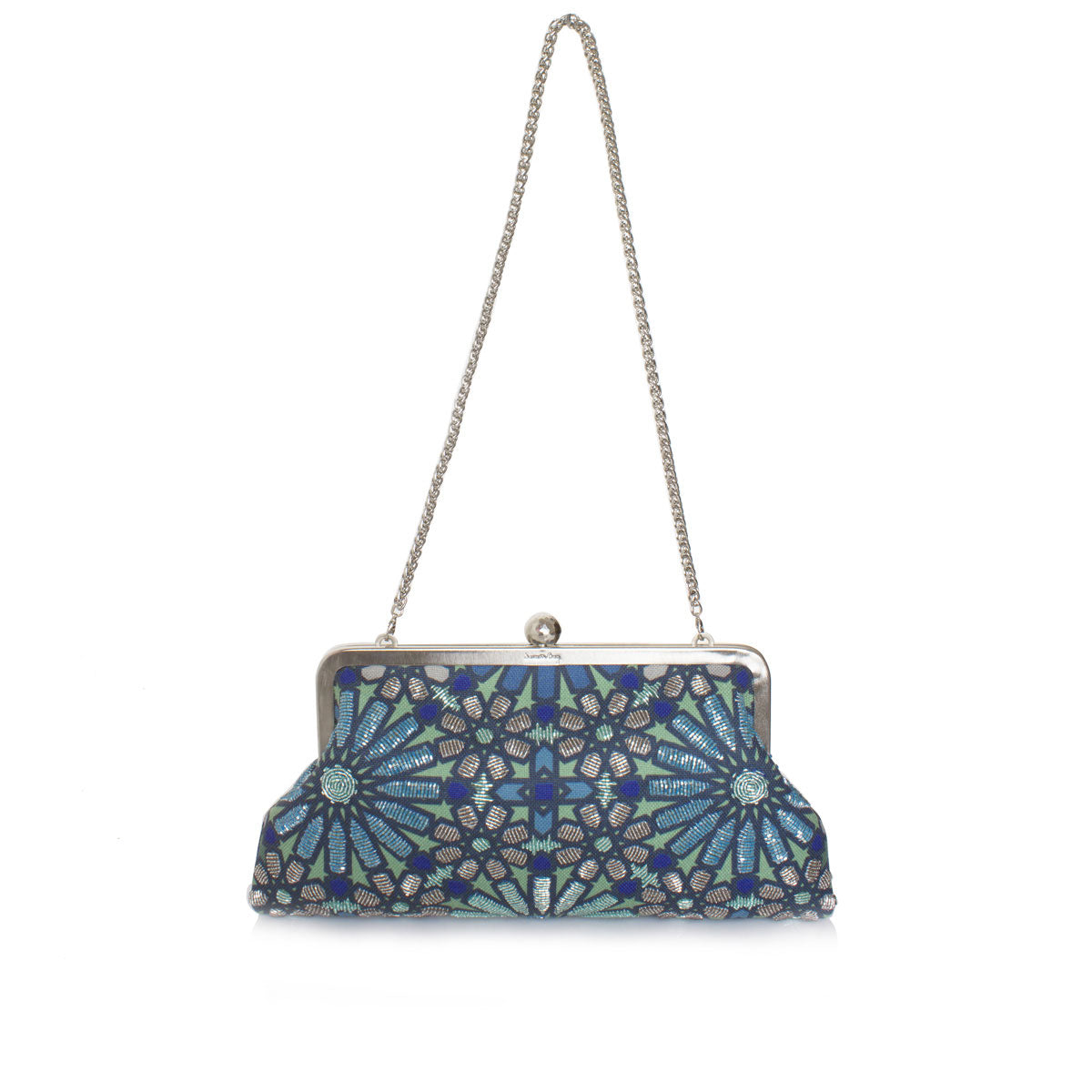 Inspired by Moroccan Zellij mosaic tilework, the Moroccan Aqua Classic brings tradition into a modern, luxurious design. Handcrafted with geometric motifs using glass beads in a shimmering palette of aquamarine, icy blue, lapis lazuli, and metallic hues, this clutch enhances both day and evening looks. A true statement piece, it effortlessly elevates a casual jeans outfit or adds the perfect finishing touch to an evening edit. Designed with versatility in mind, it features an optional chain, allowing it to transform from a clutch to a chic shoulder bag. Medium-sized and complete with a brass push clasp, it combines style with ample room for all your essentials.