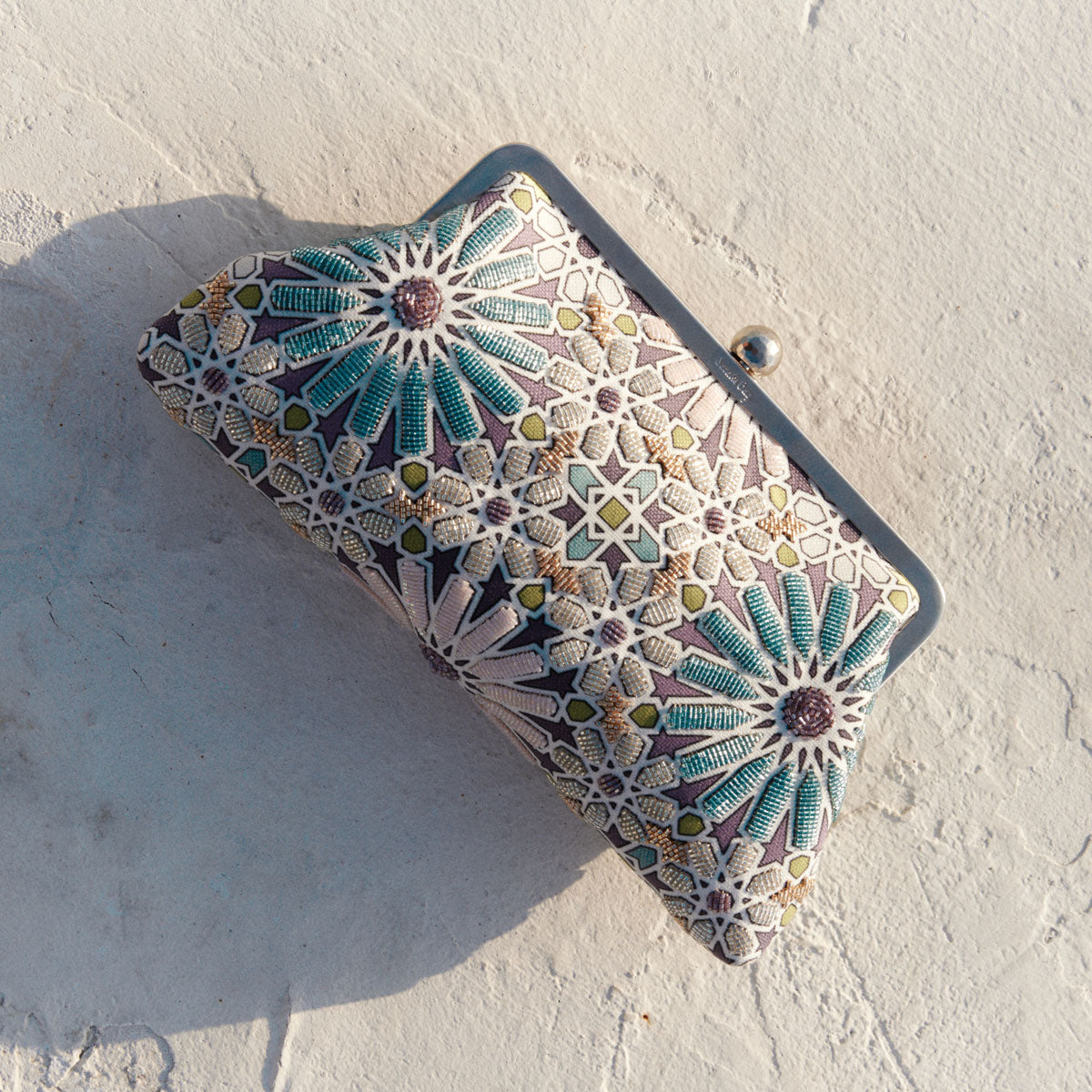 The Moroccan Pastel Classic Clutch is an elegant tribute to the intricate art of Moroccan Zellij mosaic tilework, blending modern sophistication with cultural artistry. Intricately hand-embellished with glass beads in a serene palette of pastel blue and metallic hues, this clutch adds a soft, luminous accent to any day or evening look. Designed for versatility, this statement piece features an optional chain, allowing it to transition effortlessly from a clutch to a shoulder bag while offering ample room for essentials.