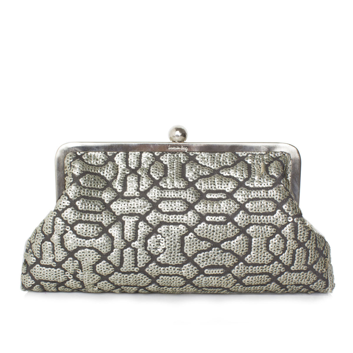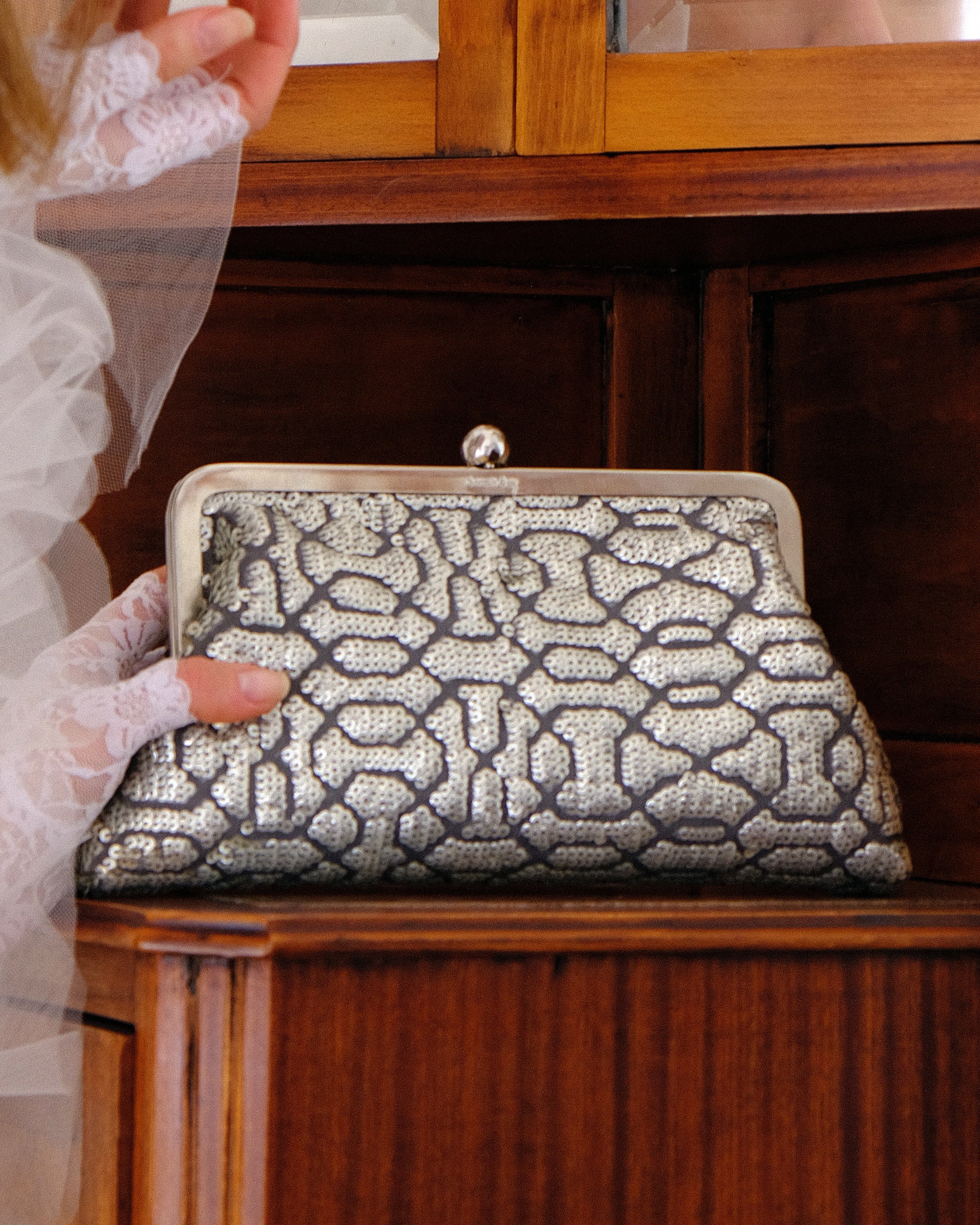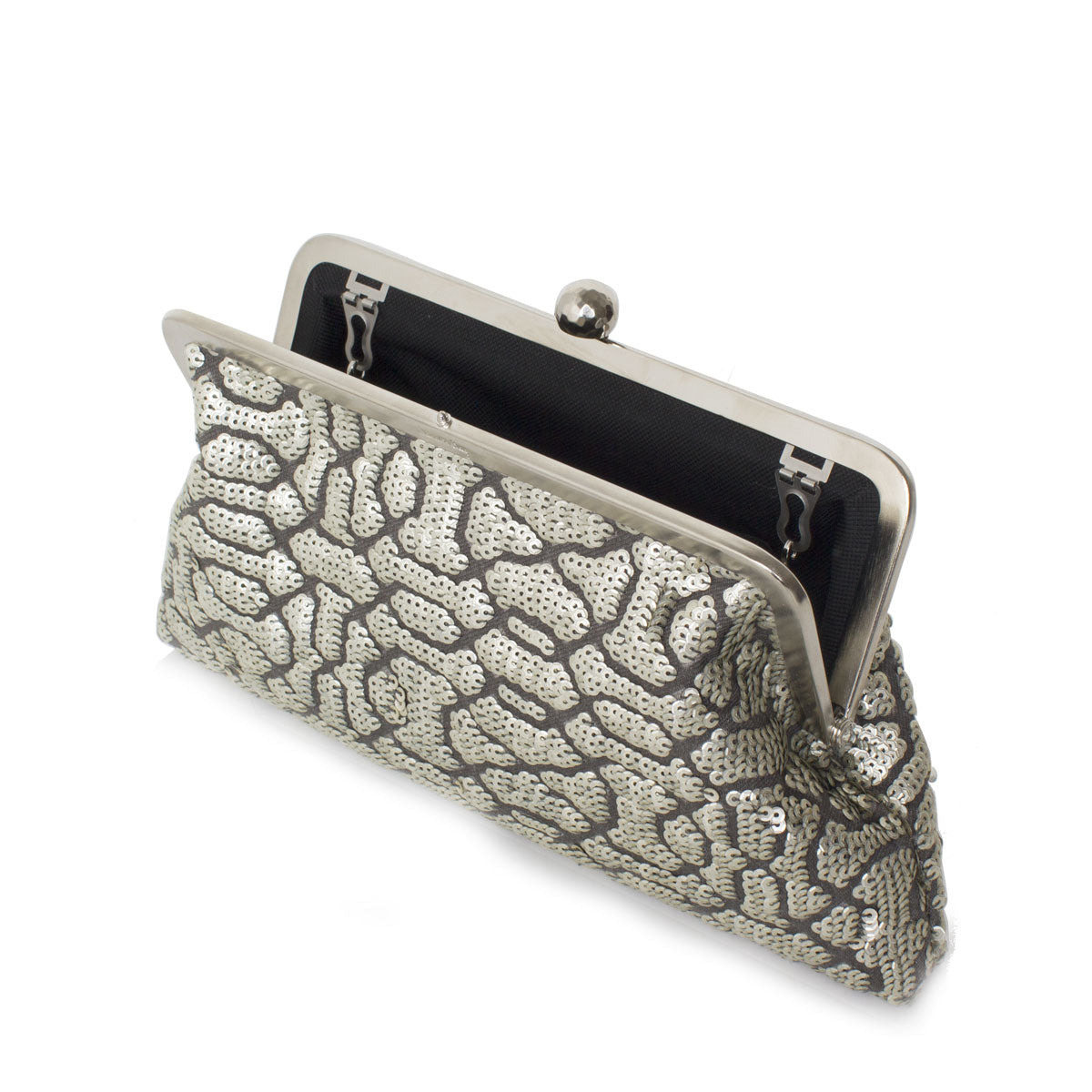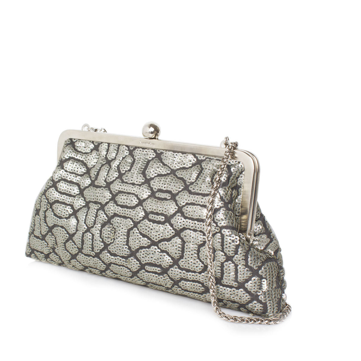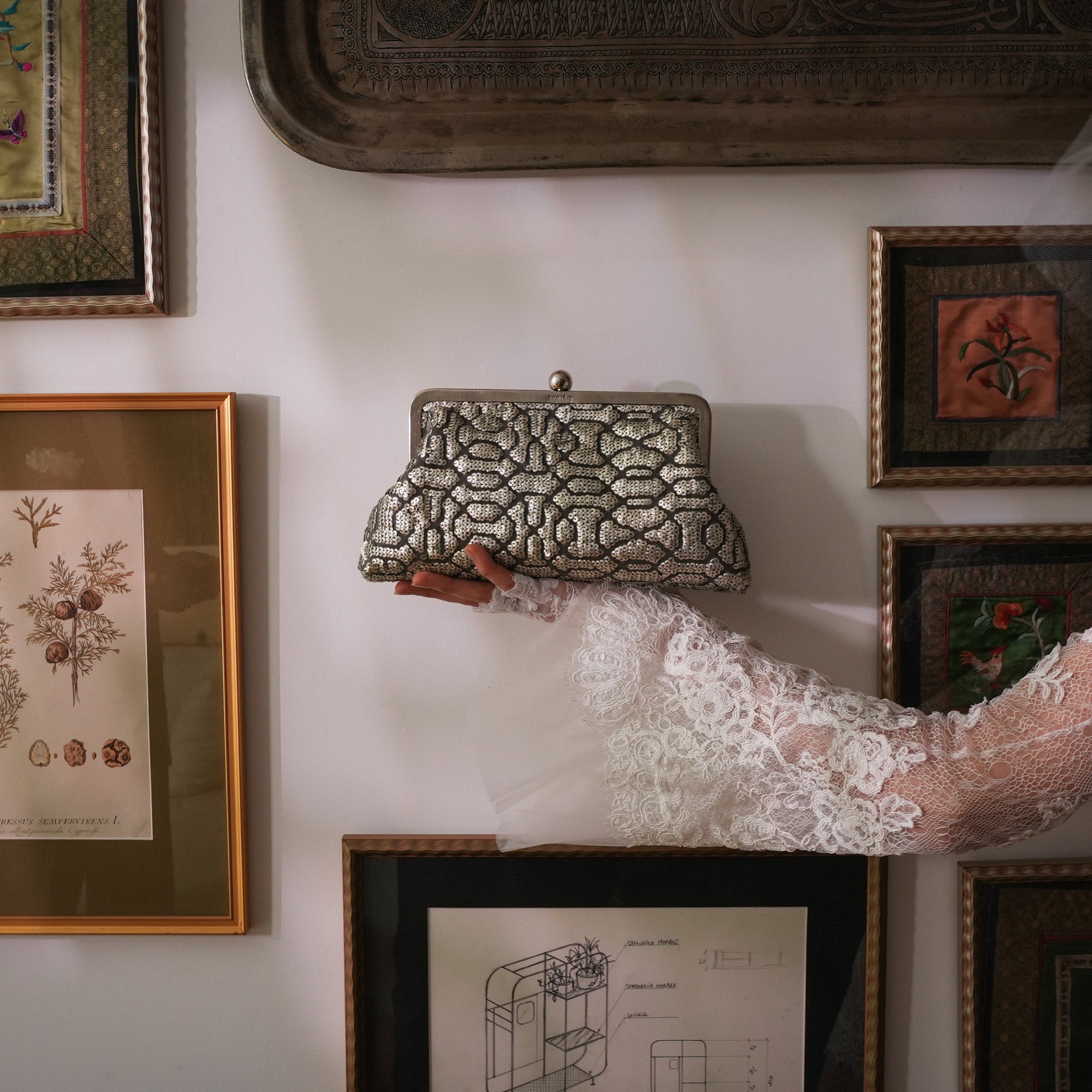 Your go-to metallic evening clutch, this molten silver bag inspired by the opulence of the Ottoman era. It features a modern twist on an Arabesque pattern rendered with a special technique of meticulously stacking sequins to give a rich, embossed effect. Our versatile, medium-sized classic bags can be held as a clutch or slung on as a shoulder bag using the chain provided.