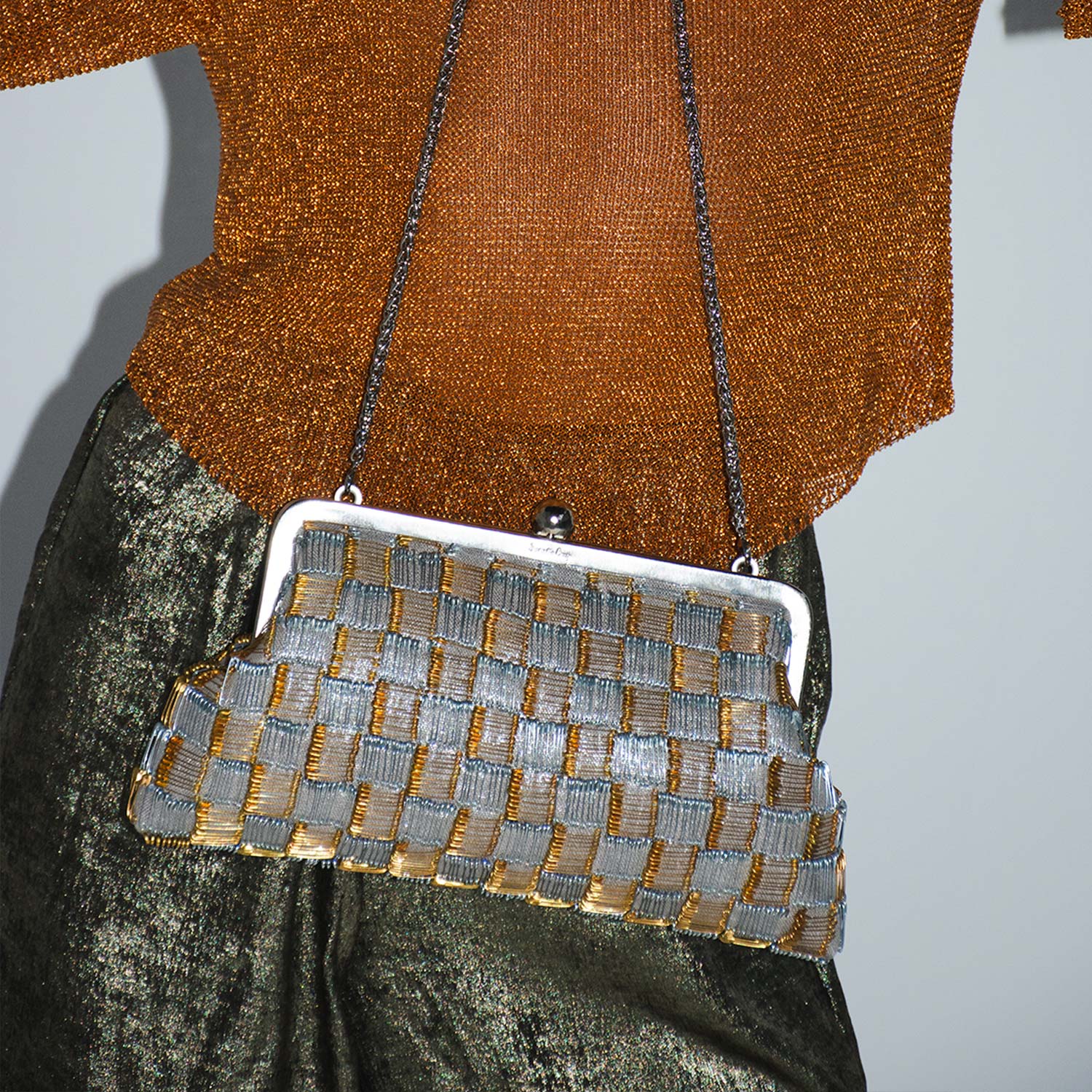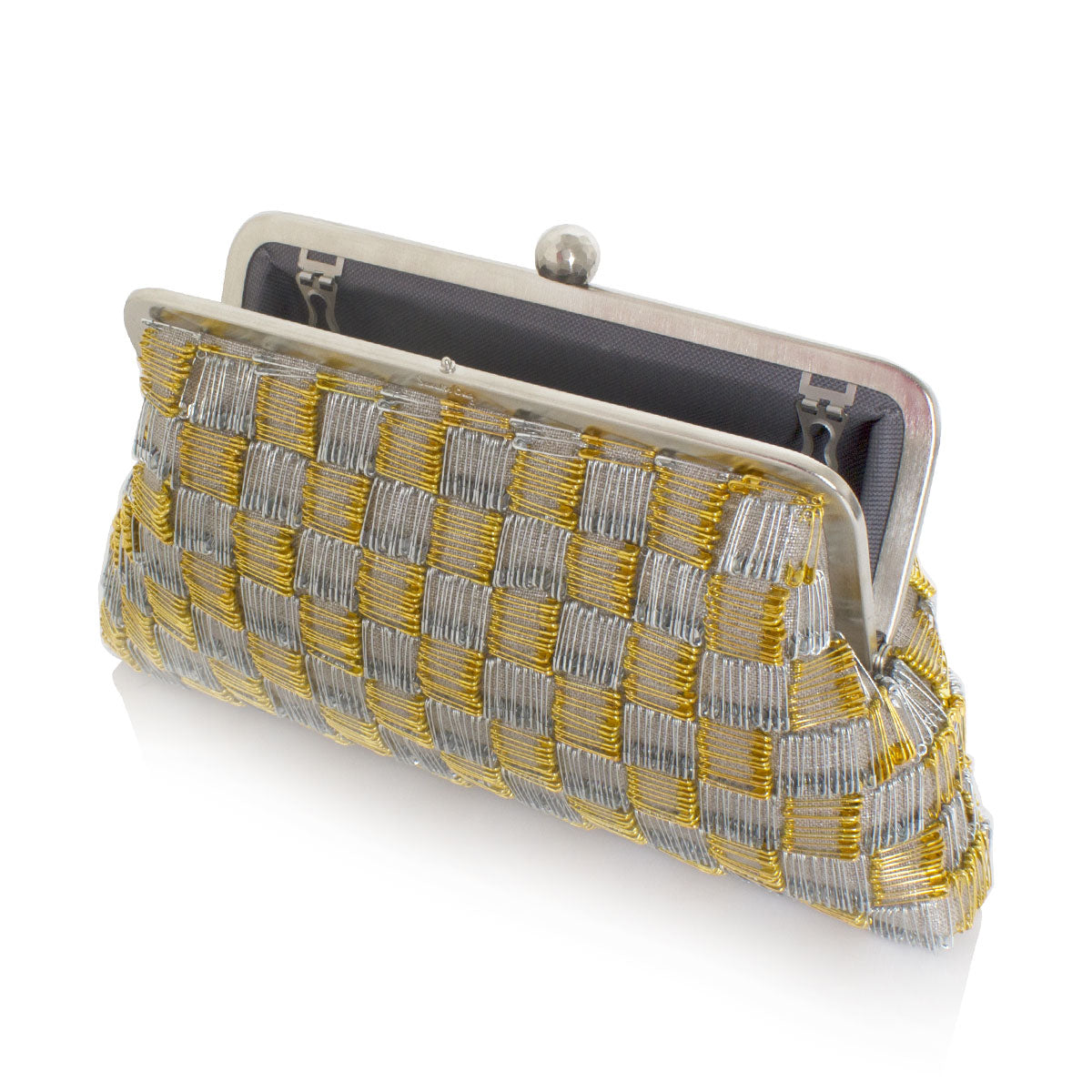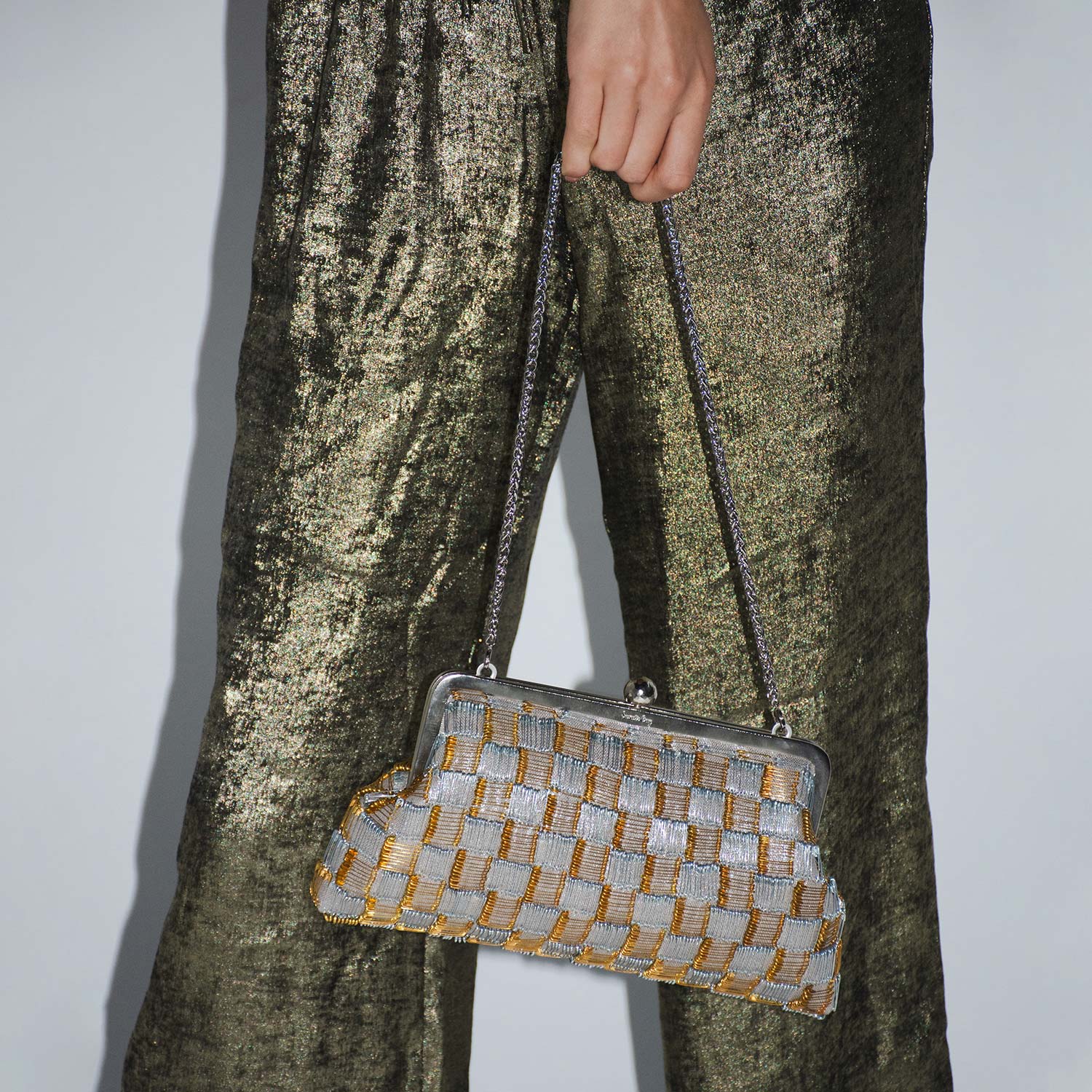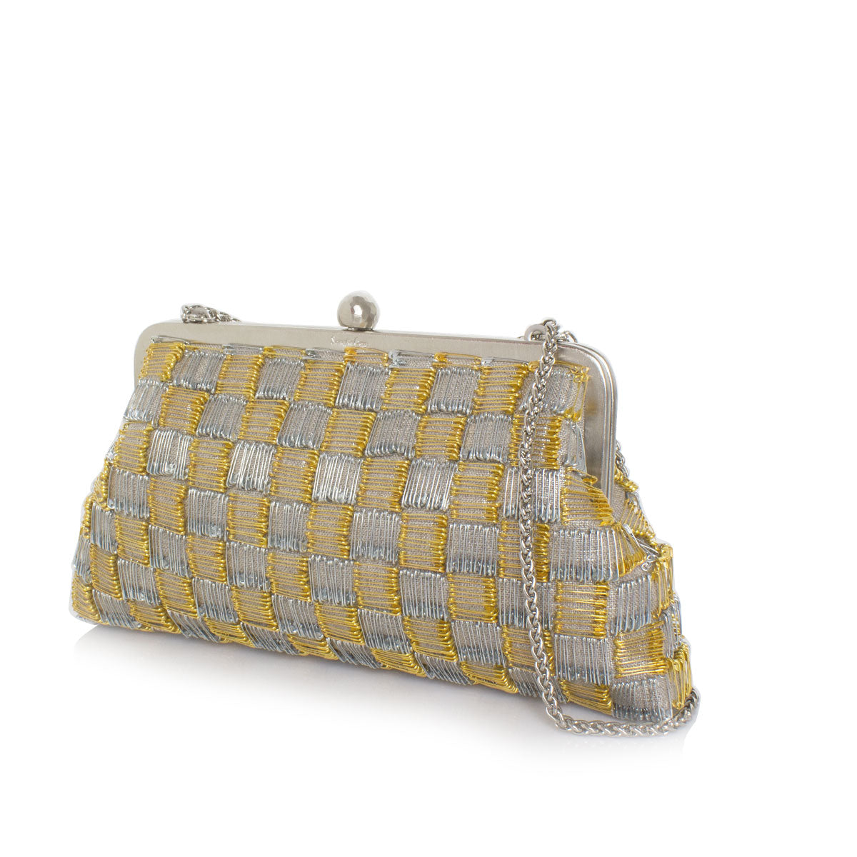 The Pins Gold Silver Classic is a special-occasion evening clutch designed to elevate any look. Crafted with care and precision, it features 950 gold and silver pins individually placed by hand on a shimmering silvery base, exuding sophistication and impeccable attention to detail. The glistening metallic design makes it a versatile choice to complement both gold and silver outfits. This medium-sized bag offers dual functionality: carry it as a sleek clutch for understated glamour or attach the included chain to wear it as a shoulder bag.