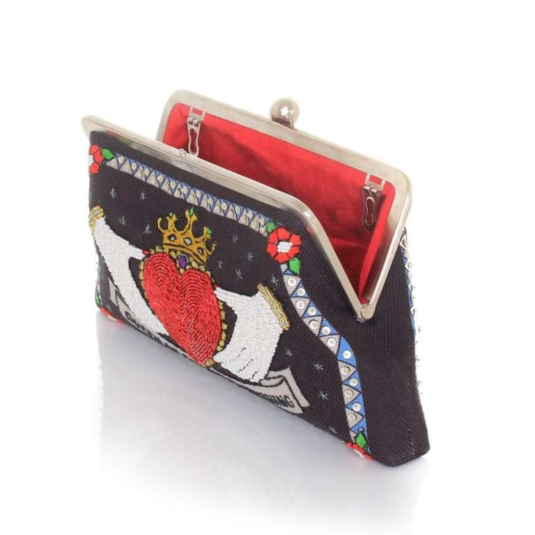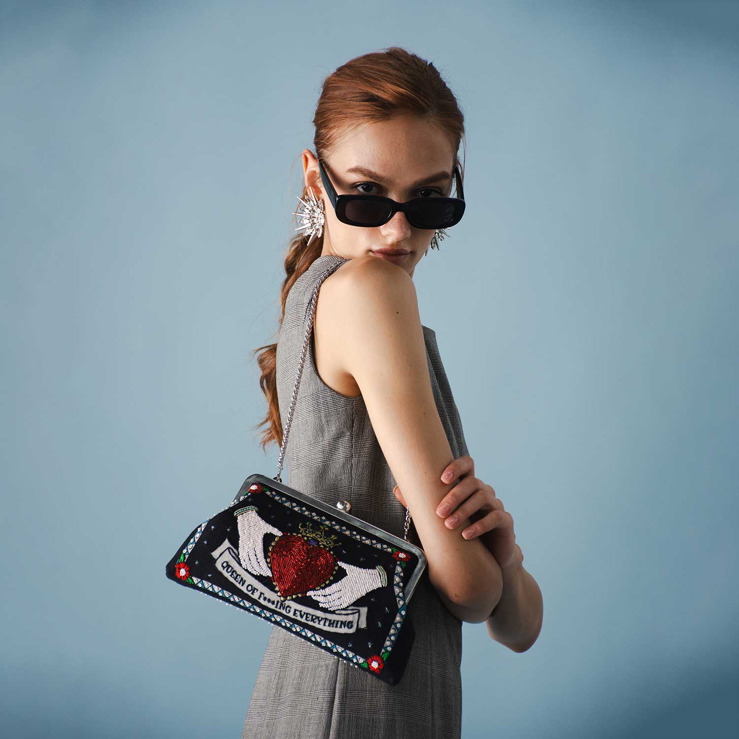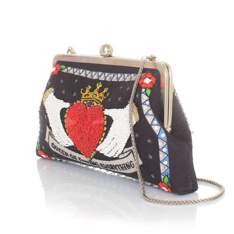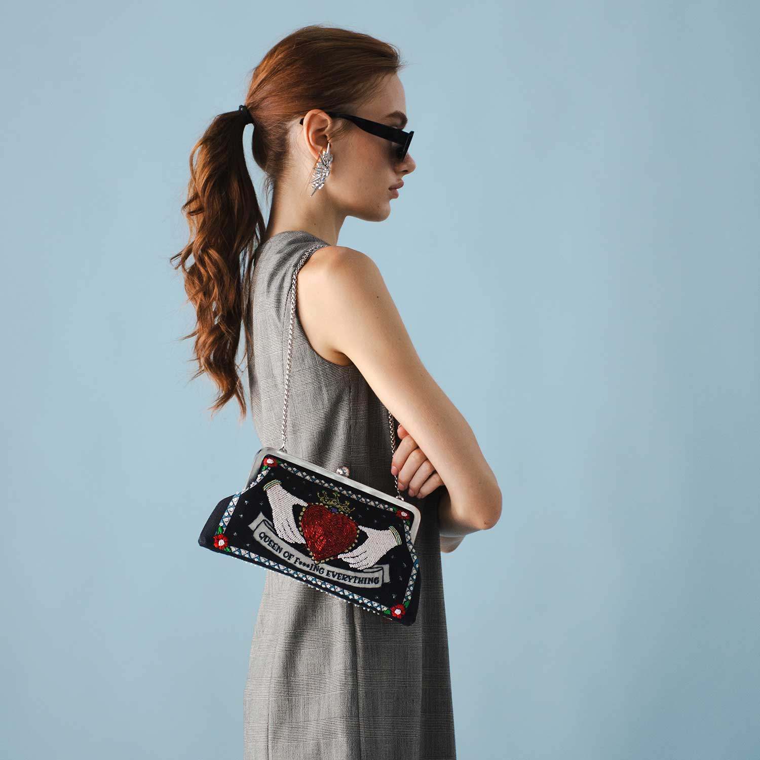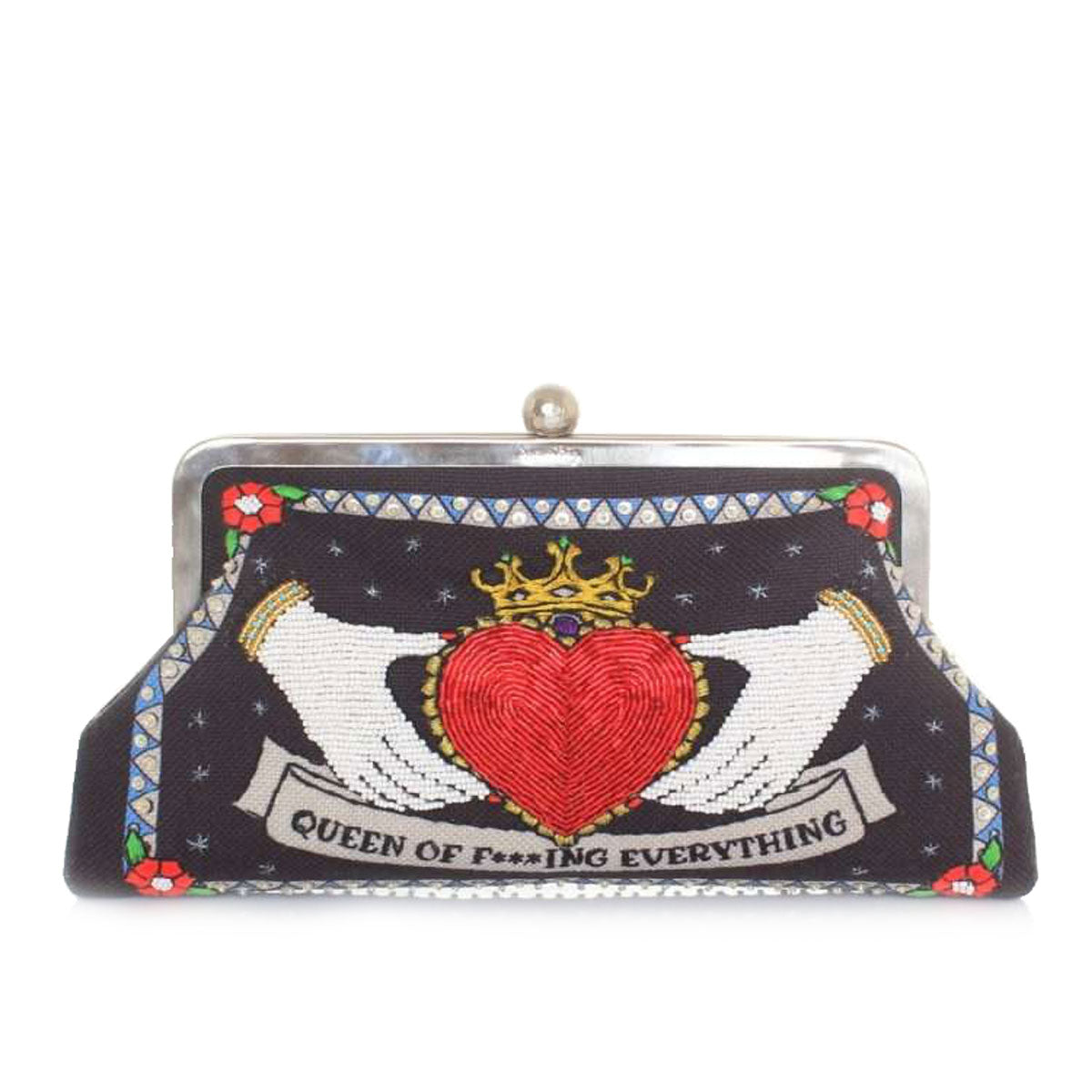 Stand back and make way for the queen! Let this show-stopping statement bag be the centerpiece of any party-worthy look with its dazzling colors, flawlessly intricate hand-beading and a feisty, lighthearted slogan proclaiming you the Queen of f#$%@ everything! This sparkly, medium-sized bag can be carried as a clutch, or use the optional chain provided for a hands-free night on the town!