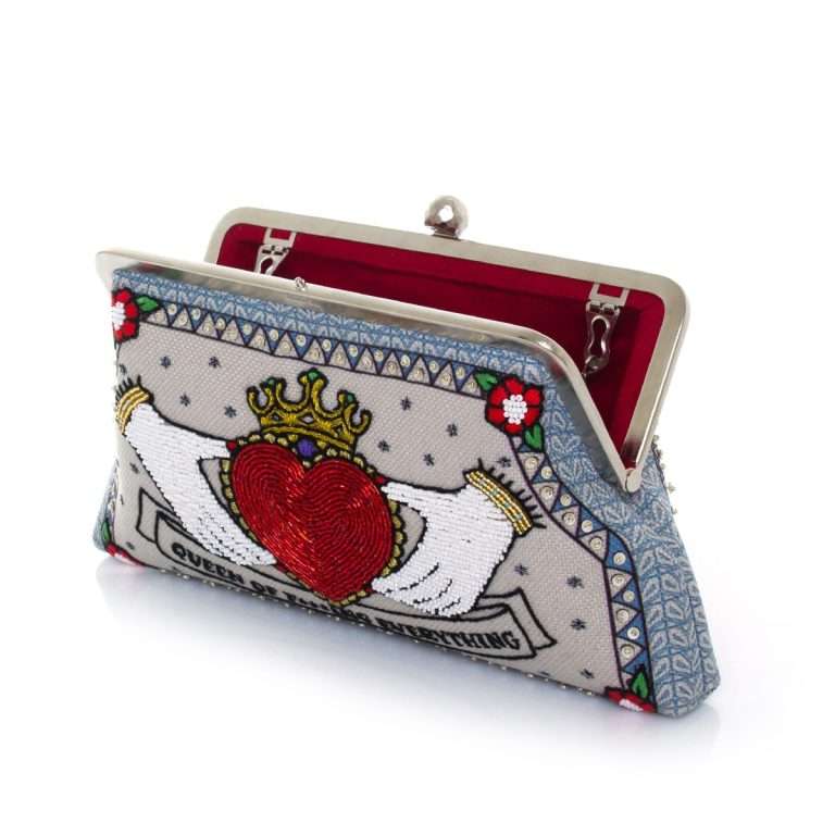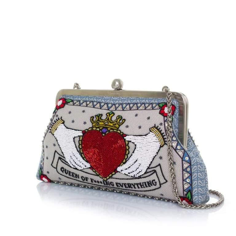 Stand back and make way for the queen! Let this show-stopping statement bag be the centerpiece of any party-worthy look with its dazzling colors, flawlessly intricate hand-beading and a feisty, lighthearted slogan proclaiming you the Queen of f#$%@ everything! This sparkly, medium-sized bag can be carried as a clutch, or use the optional chain provided for a hands-free night on the town!