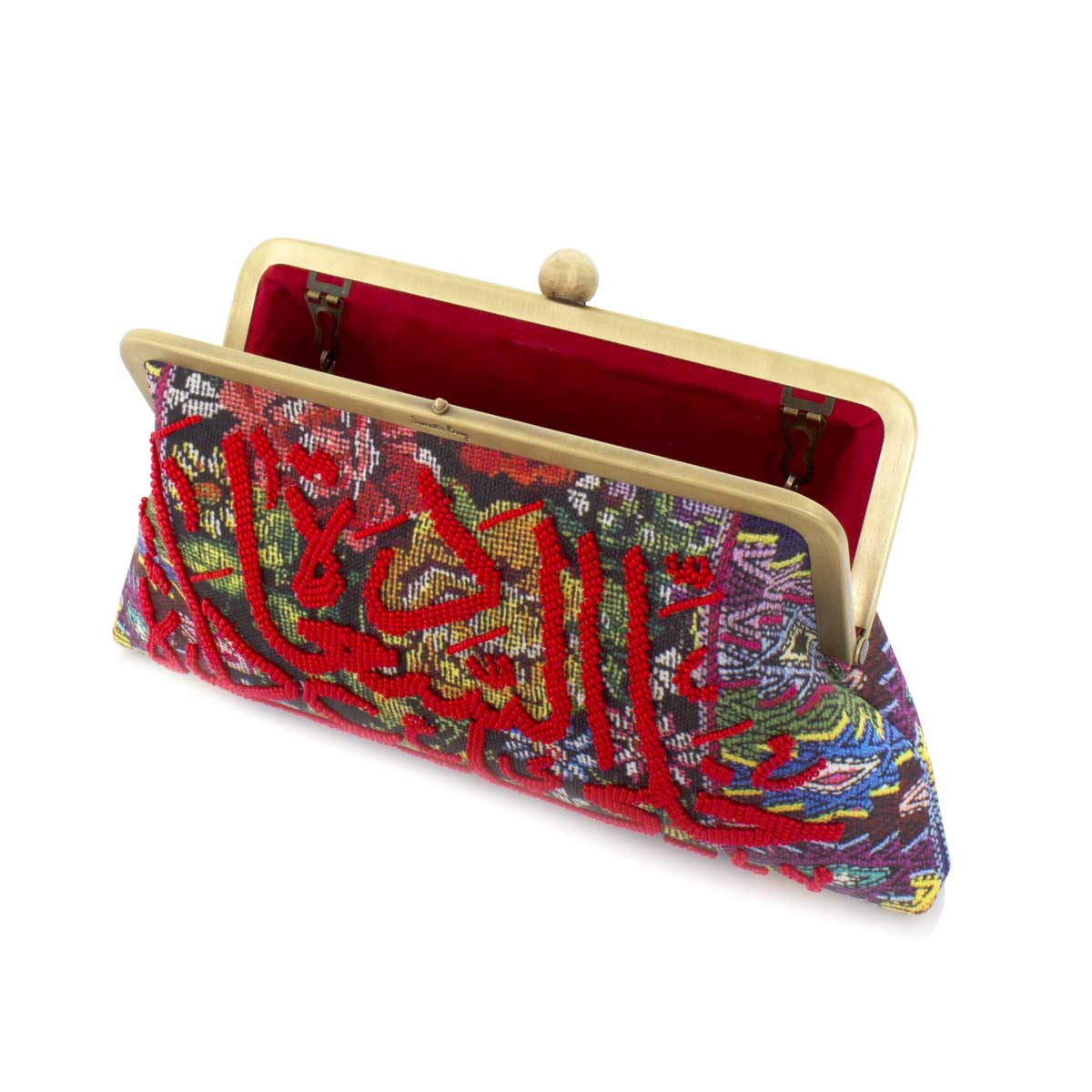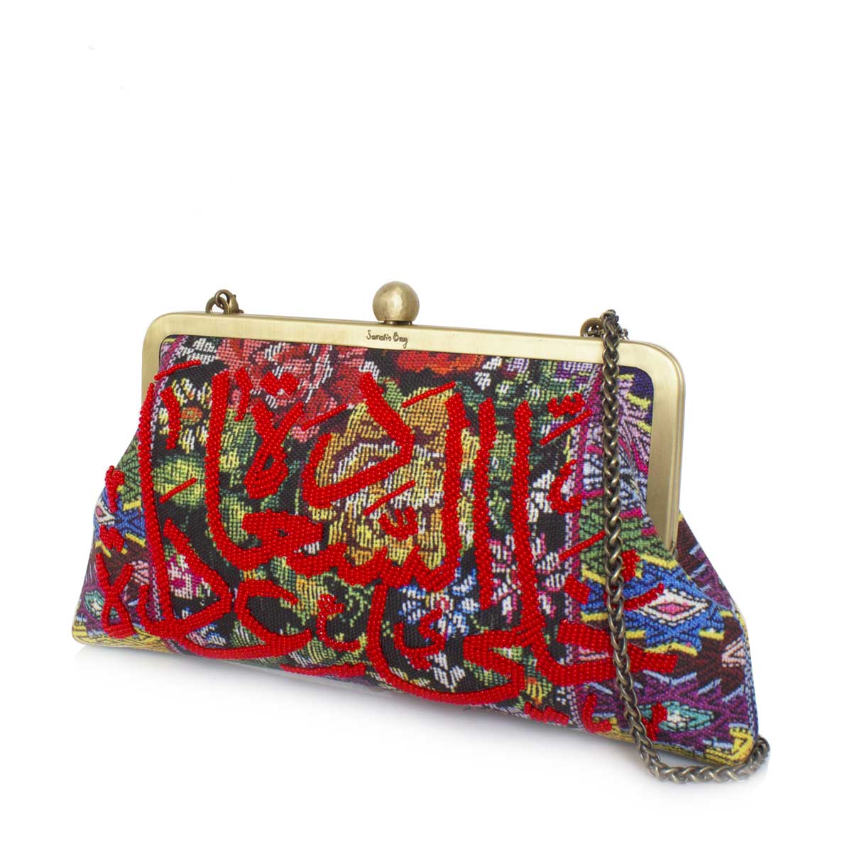 The Hapiness red on mexican floral classic bag by Sarah’s Bag – is an exquisite addition to the Oriental collection. This stunning evening clutch features an eloquent Arabic calligraphy quote that reads “Make happiness a habit,” meticulously hand-beaded with sparkling red glass beads. The intricate craftsmanship and vibrant colors add a touch of cultural refinement to this versatile accessory. The clutch is skillfully crafted with a woven flowery canvas base, making it perfect for any occasion. It comes with a detachable chain strap that allows you to carry it as a shoulder bag or a clutch. With its elegant design and rich color palette, the Hapiness red on mexican floral classic is sure to make a statement wherever you go.