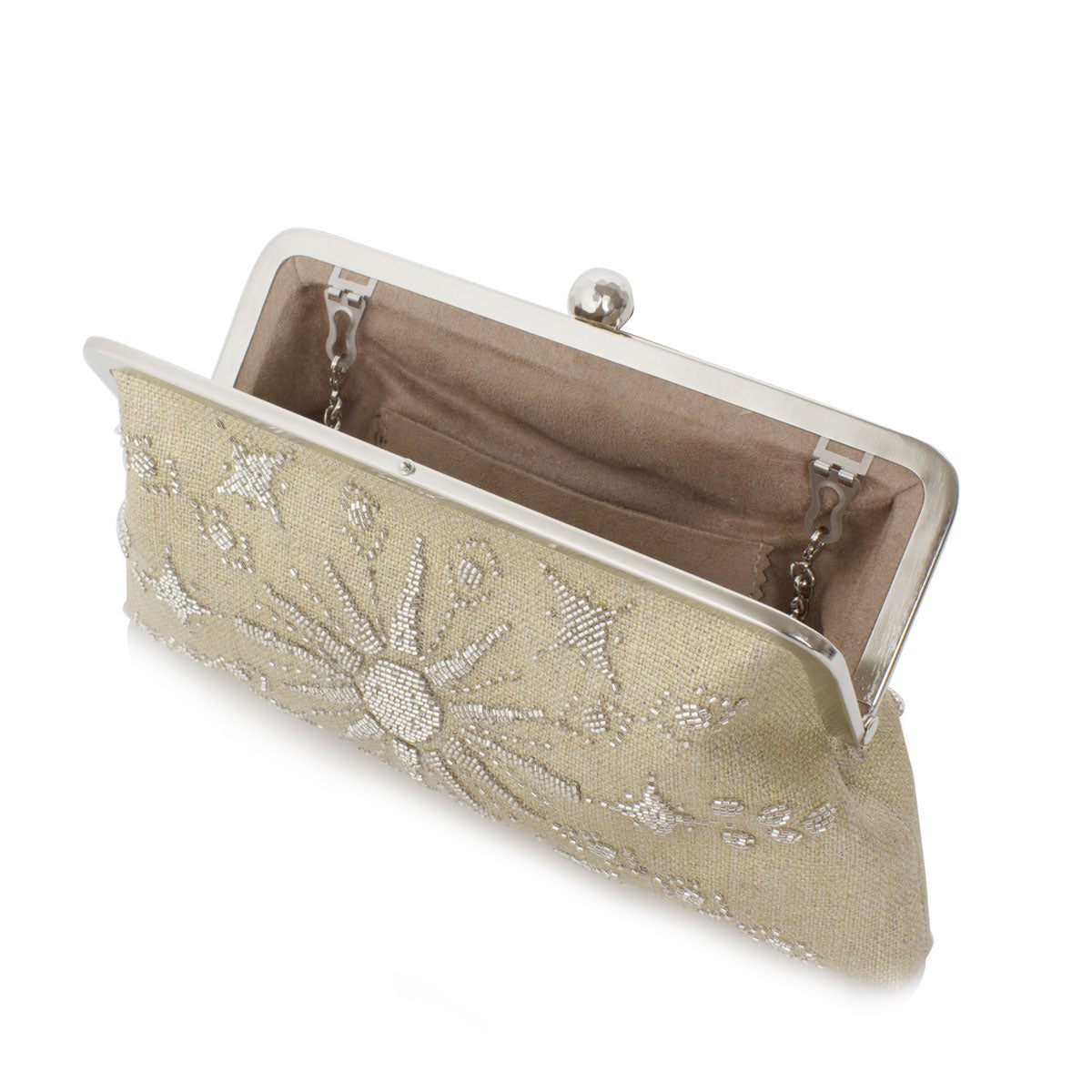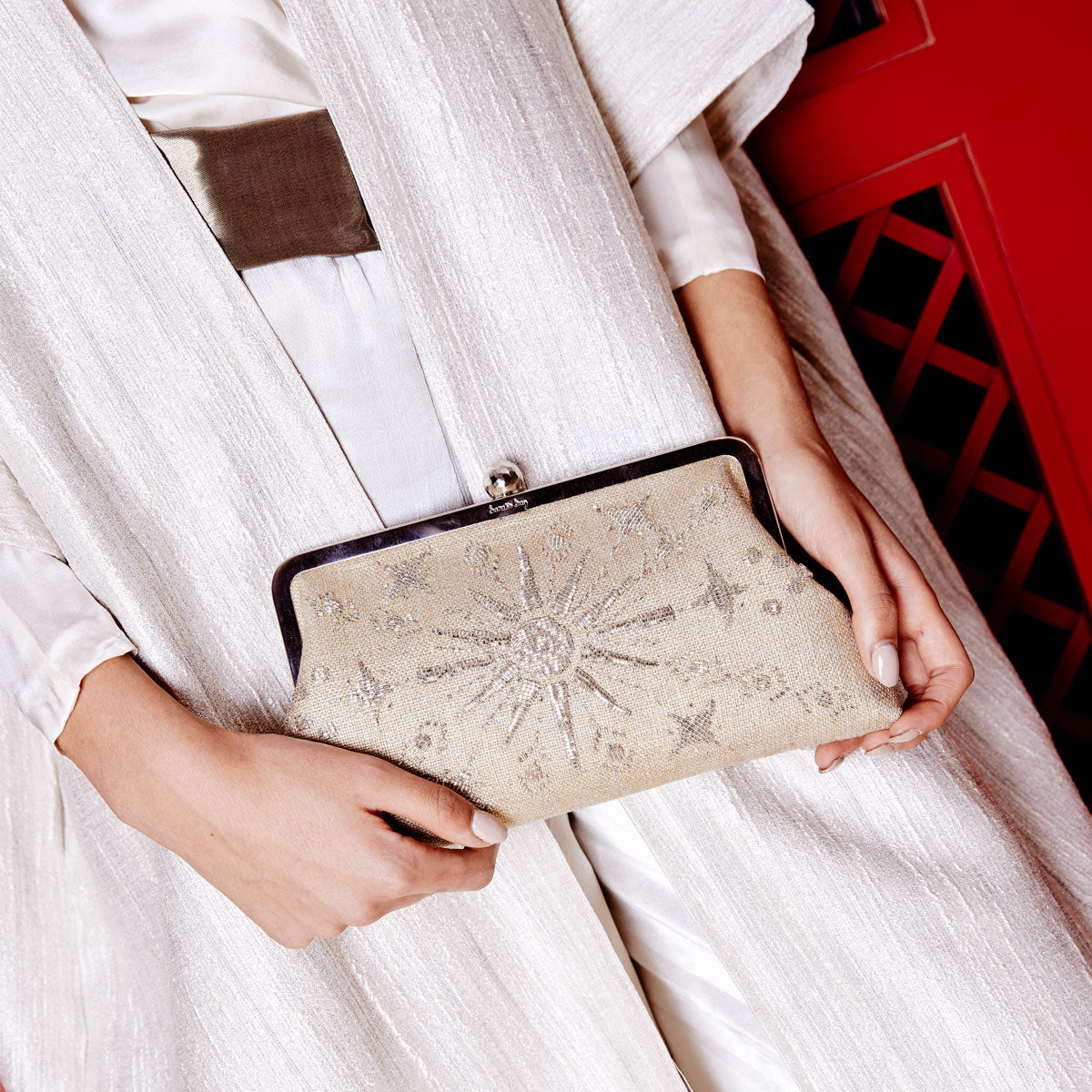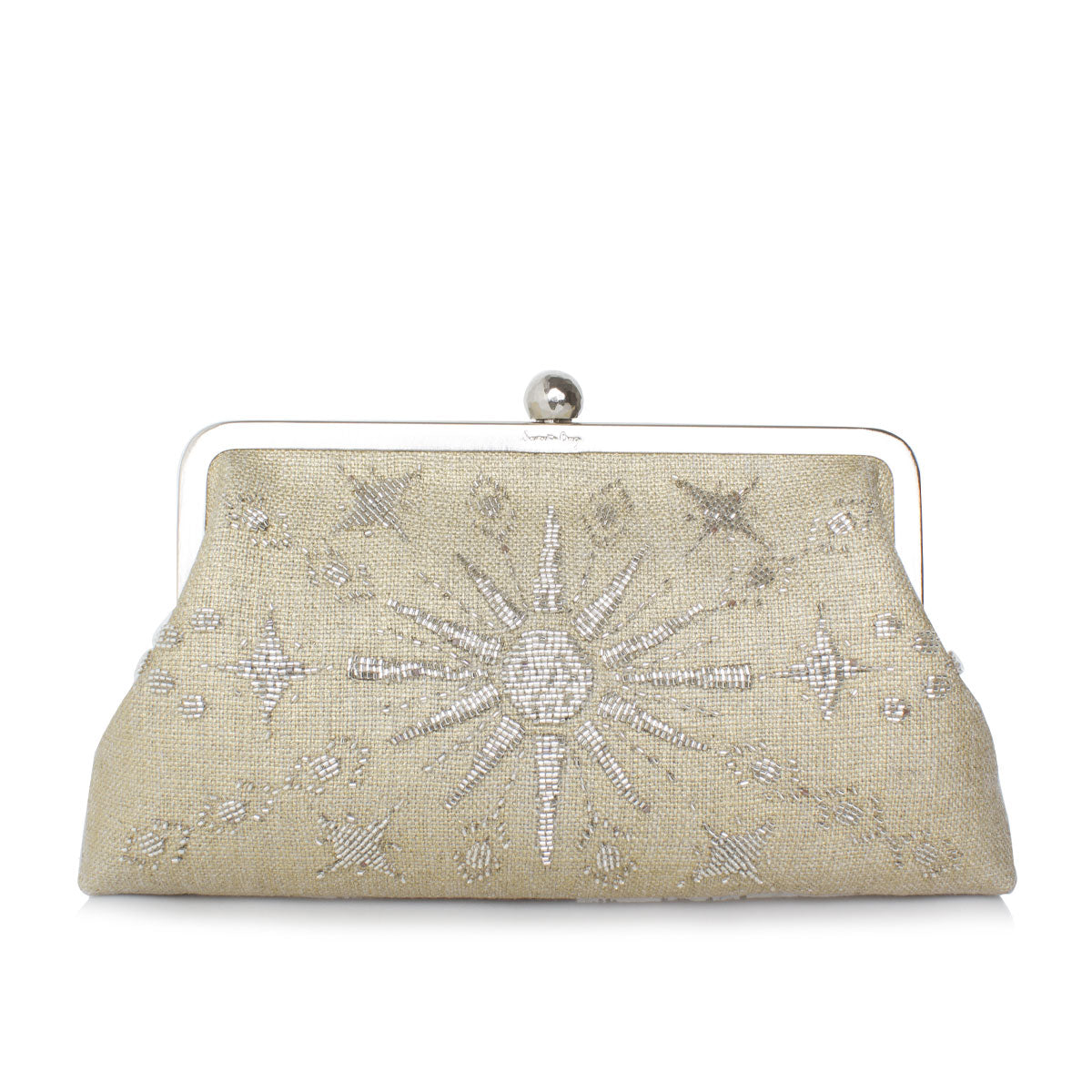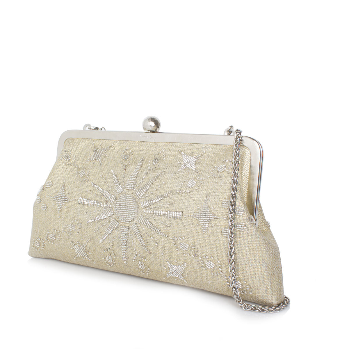 The Rise GoldClassic bag is crafted with meticulous attention to detail, combining timeless design with the unique touch of a radiant sun motif in glass bead embroidery. This versatile medium-sized accessory seamlessly transitions from a clutch to a shoulder bag with the included chain, adding an extra layer of versatility to its stylish appeal.