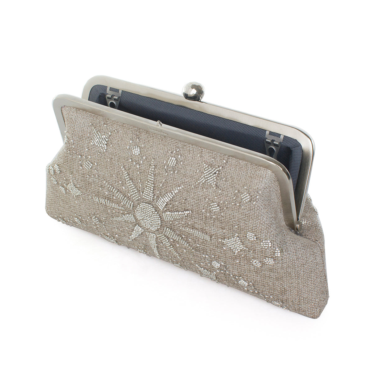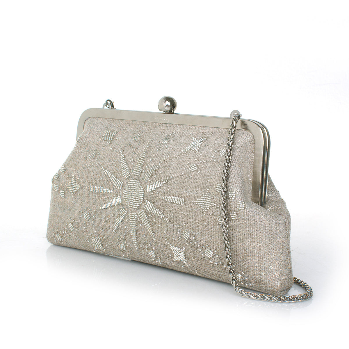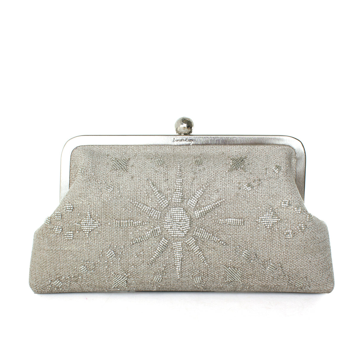 The Rising Sun Silver Classic Clutch features a structured form wrapped in soft silver-toned fabric, hand-embroidered with a radiant sun motif and geometric accents. Subtle metallic threadwork adds dimension and a gentle shimmer. Finished with a classic metal clasp, it includes a detachable chain for refined day-to-night styling.