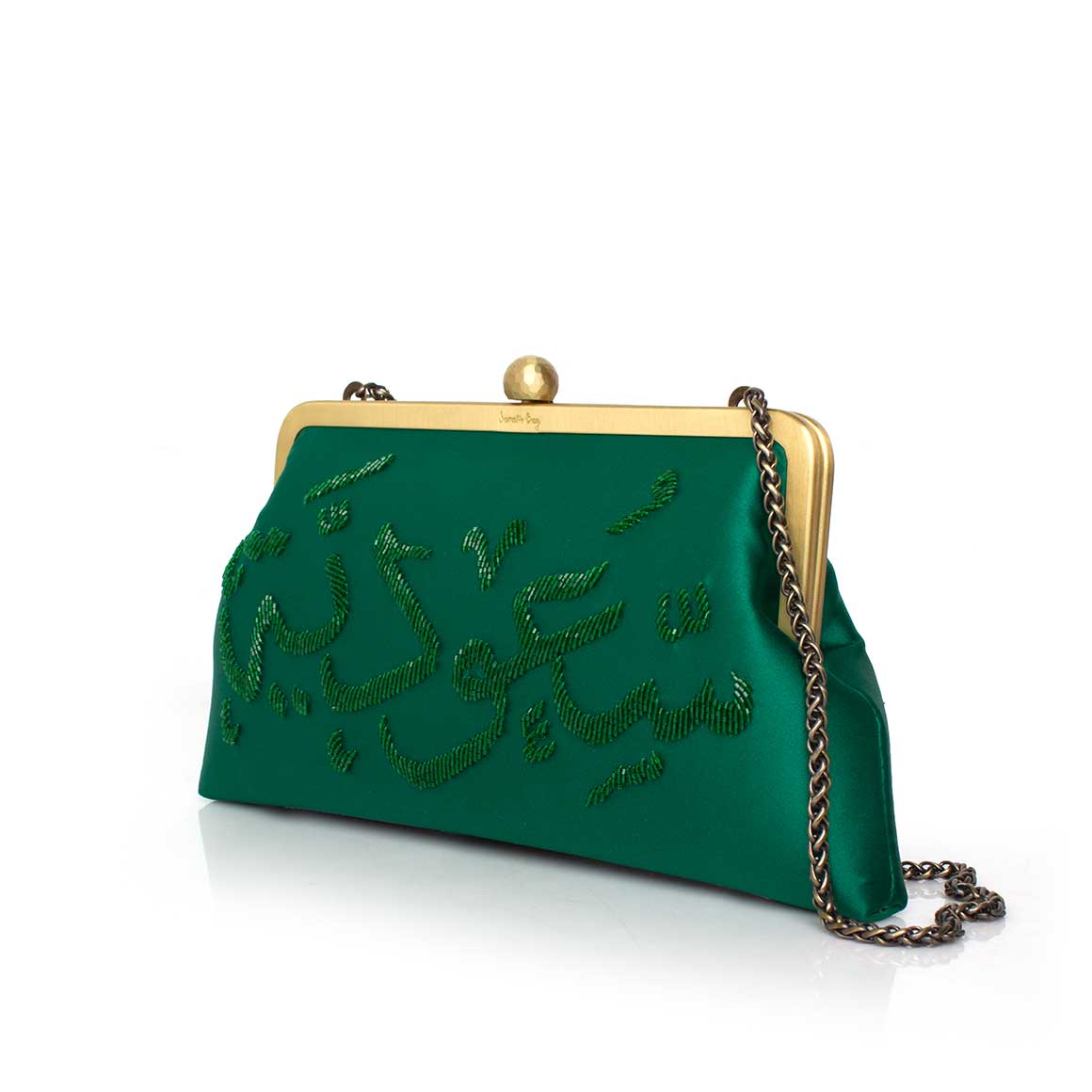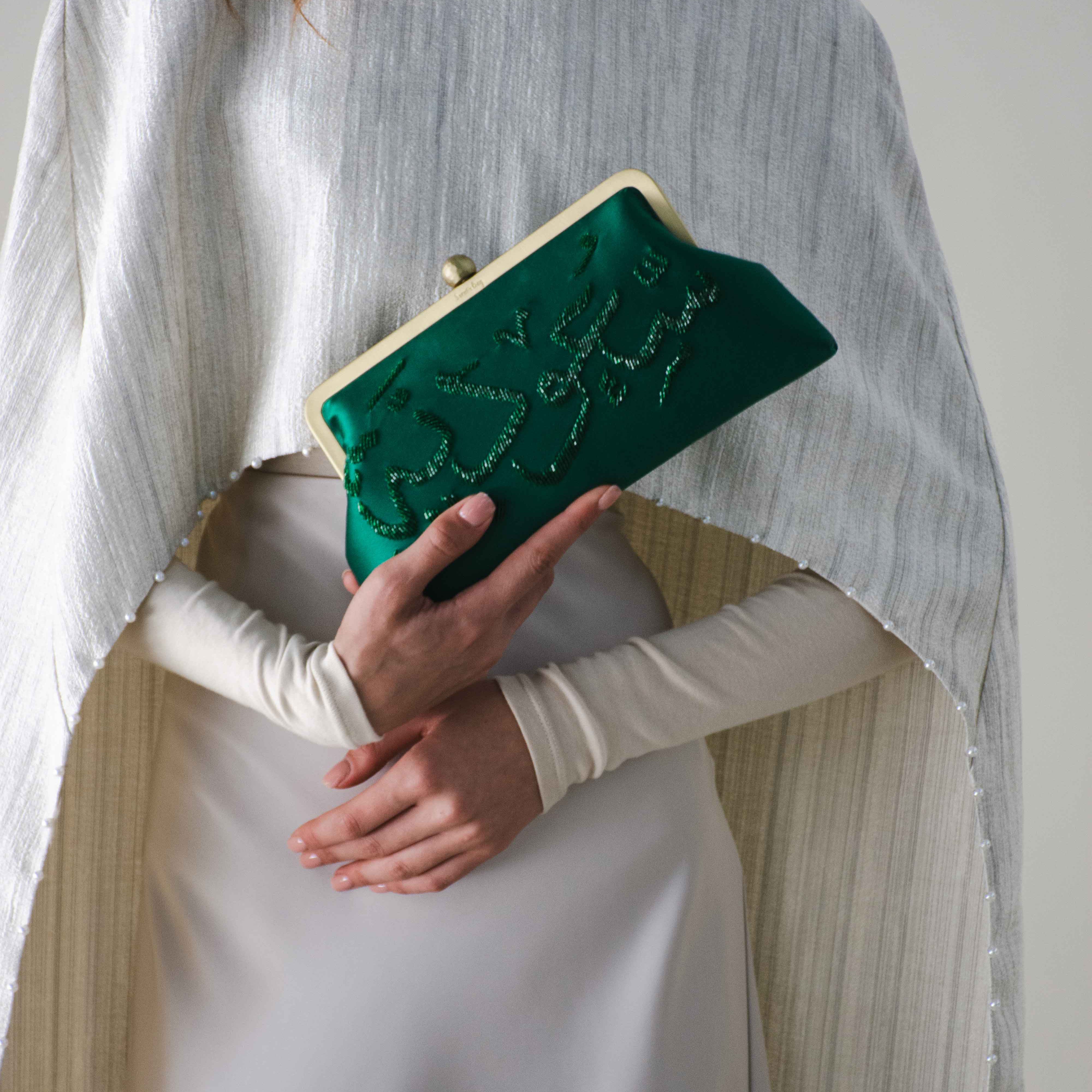 The Saoudiyah Green on Green Satin Classic Bag is a structured clutch crafted in deep green satin. A core piece of The KSA Capsule collection, it features tonal Arabic calligraphy spelling Saoudiyah (سعودية) in matching thread for a sleek monochrome effect. It can be carried by hand or worn on the shoulder using a detachable chain.