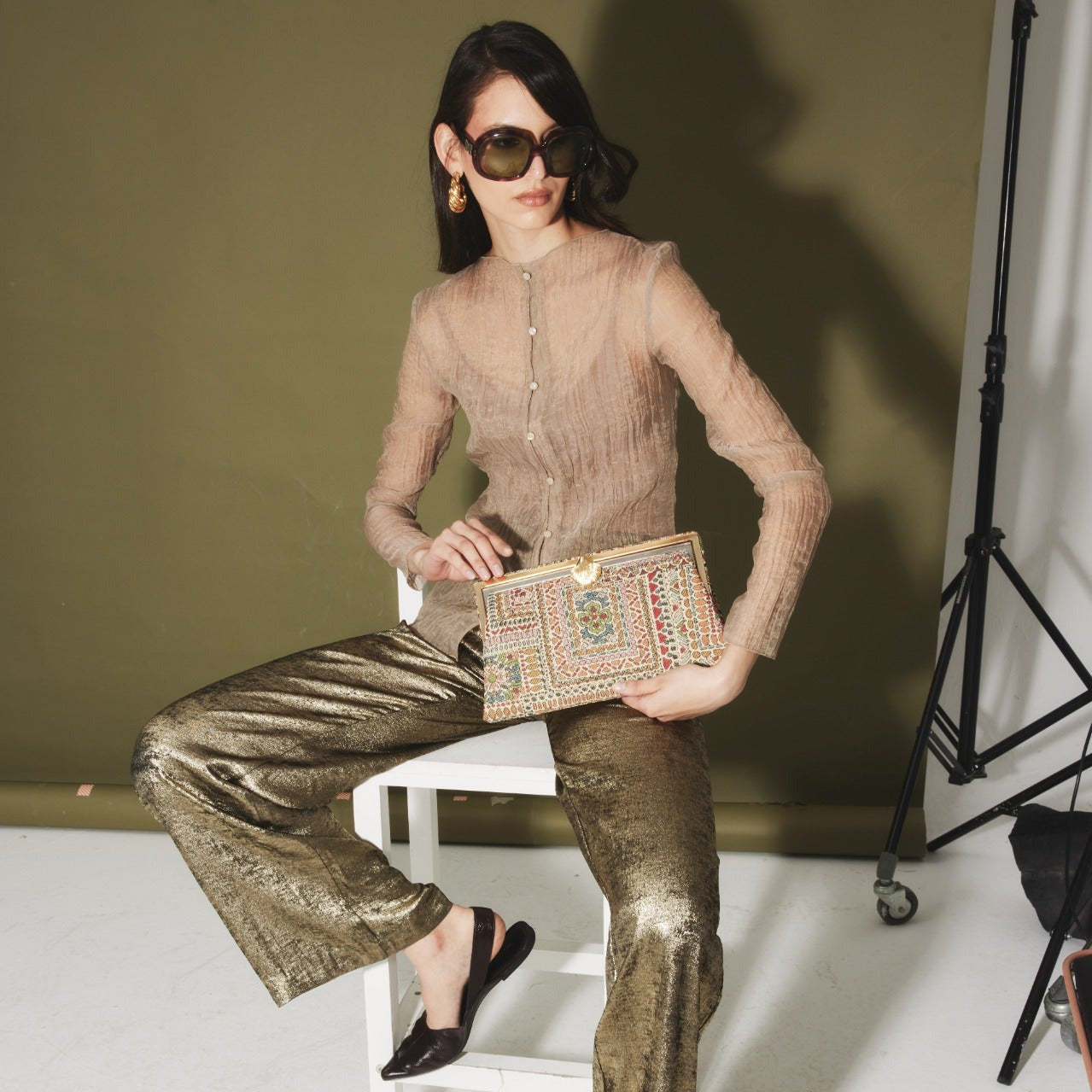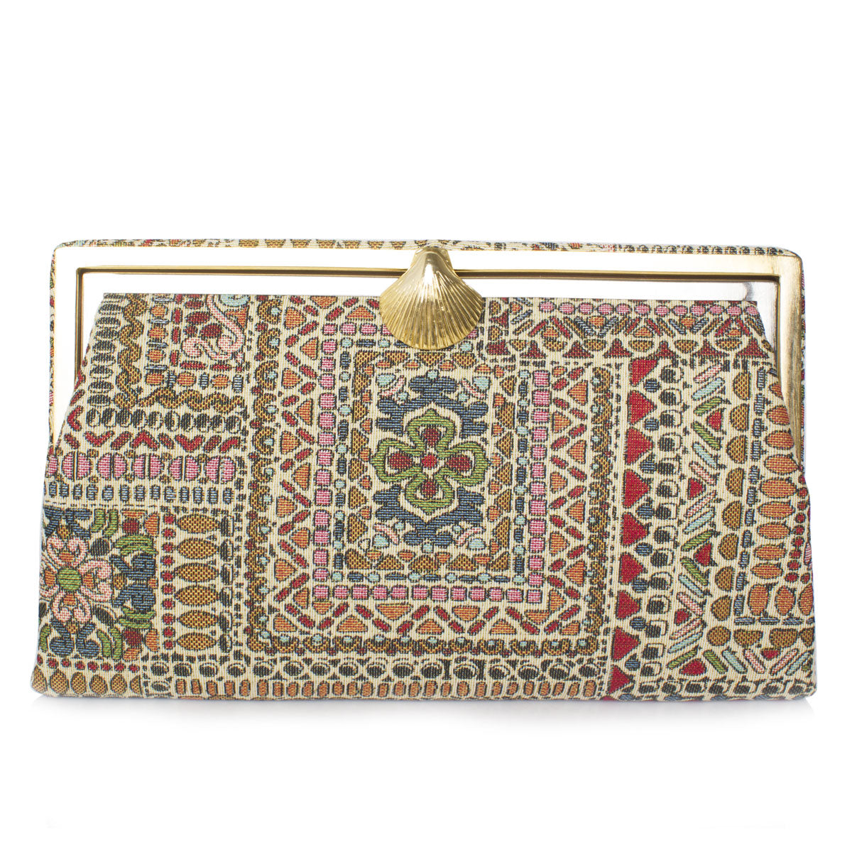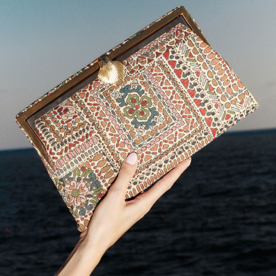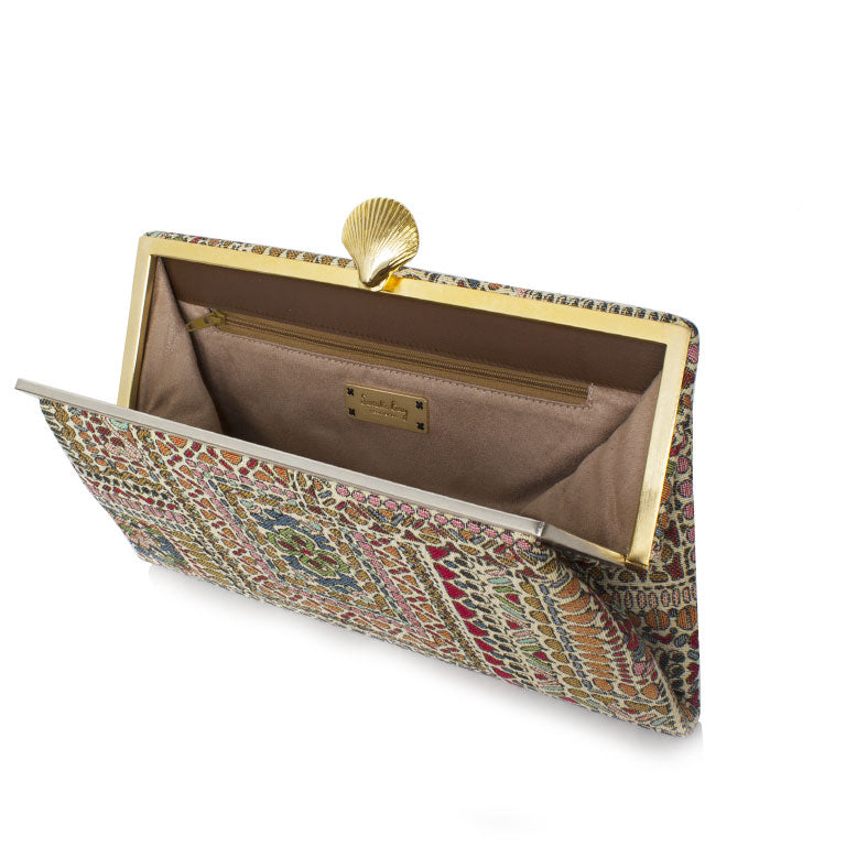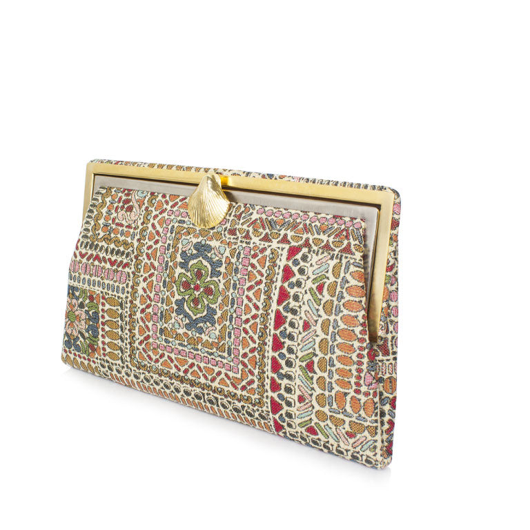 Paired with daily casuals or nightly abayas, this incandescent clutch will give any outfit a glowing, oriental touch. The Grace shape is inspired by dazzling bags from the 1920’s and contains a small inside zippered pocket.